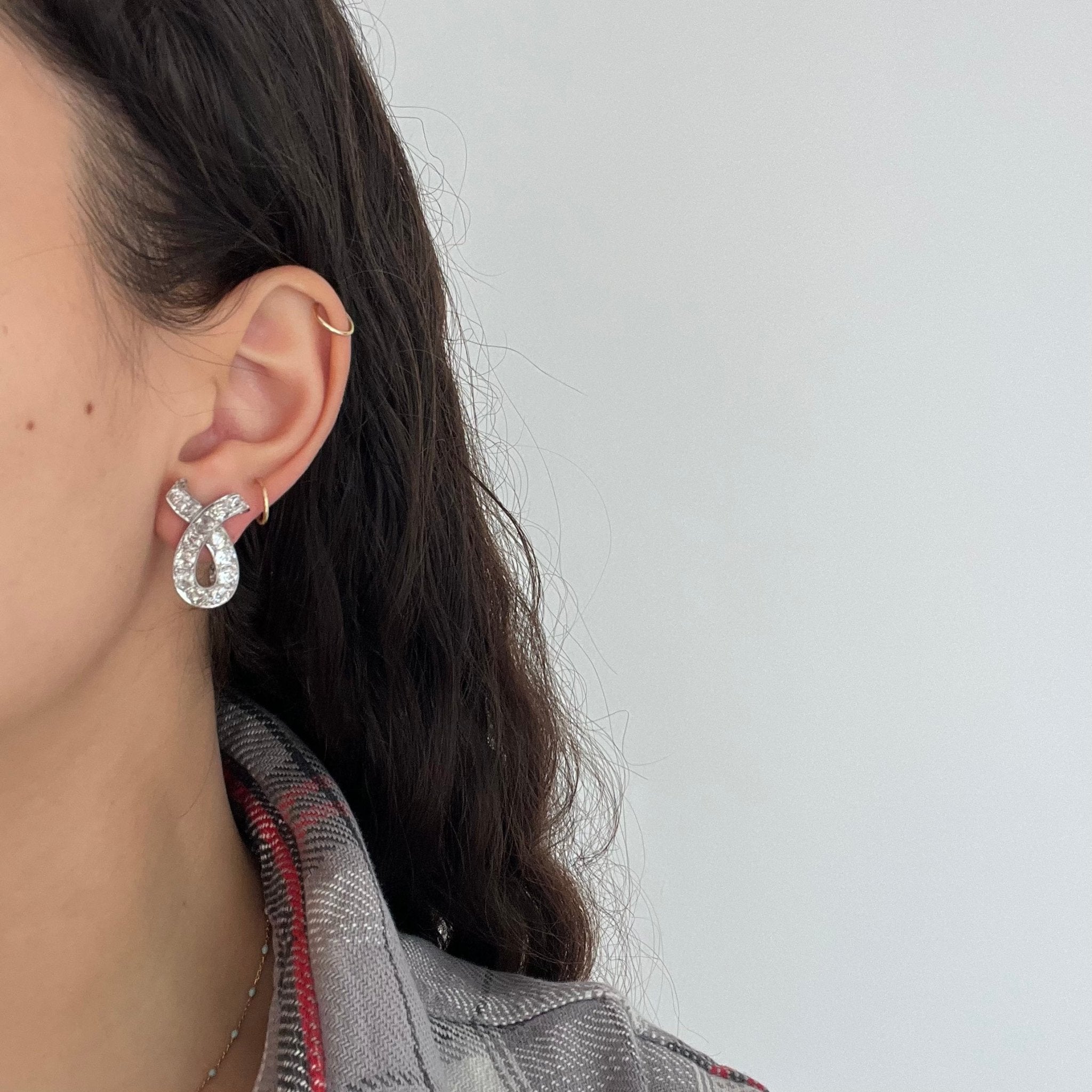 Chic and sexy - what more can we say? I am enamored by this pair of bow motif earrings, studded with super chunky old mine cut diamonds in platinum. On the lobes, the earrings sit elegantly, with the old cut diamonds sparkling like little disco balls on the lobes. They look like a million bucks!