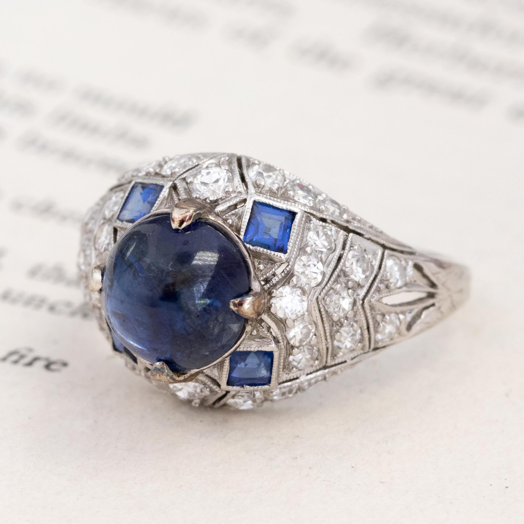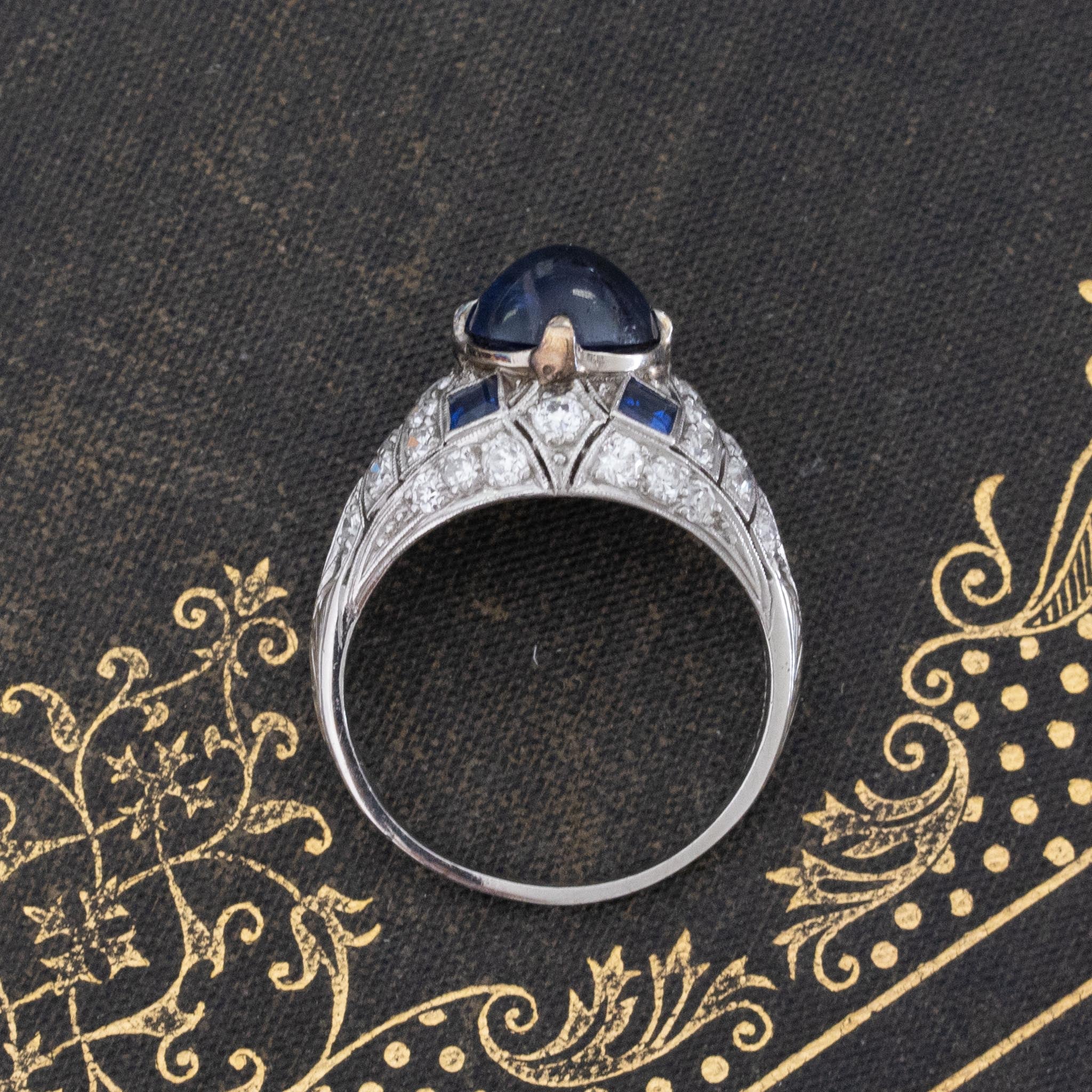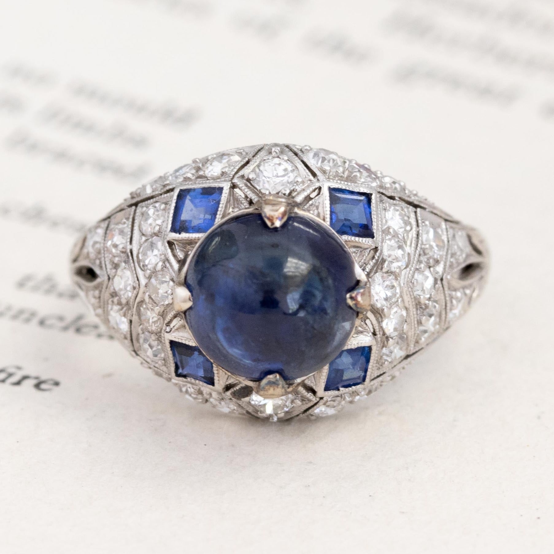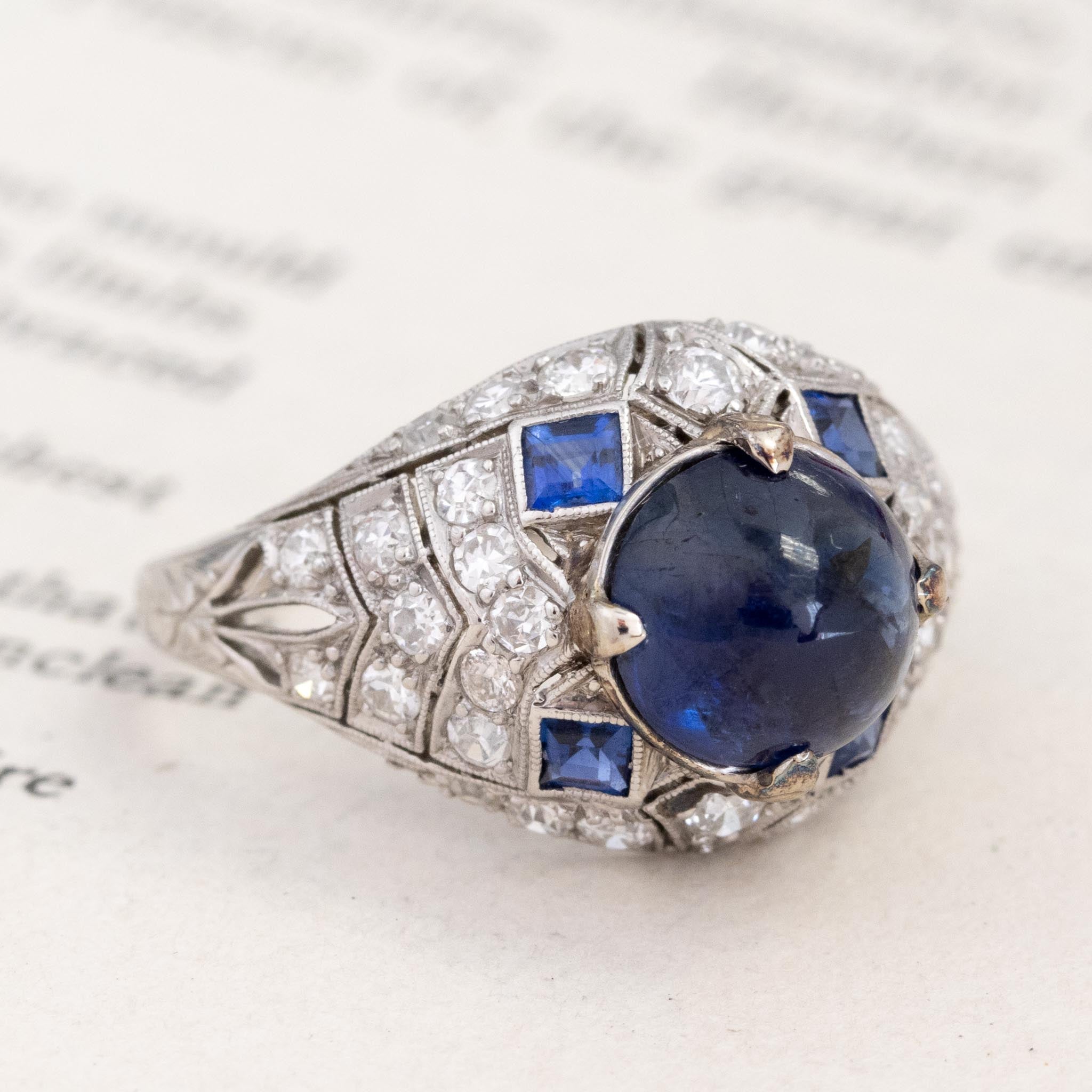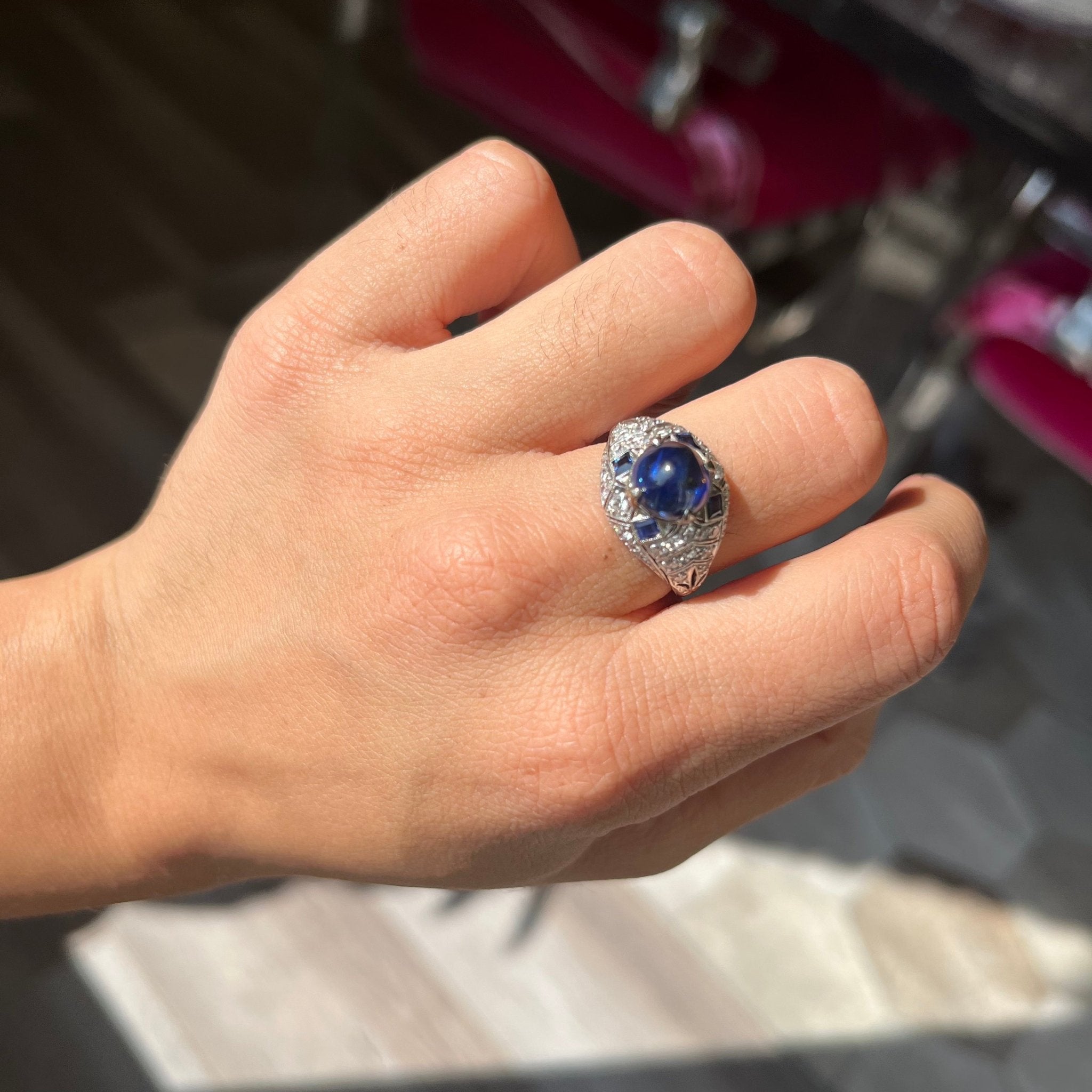 What a beautiful pop of color on the finger this ring offers! The cabochon sapphire has the prettiest velvety blue color, offering a sharp contrast against the white diamonds and metal. Beautiful craftsmanship with intricate details. Just a stunning example from the era, and looks super elegant on the finger.