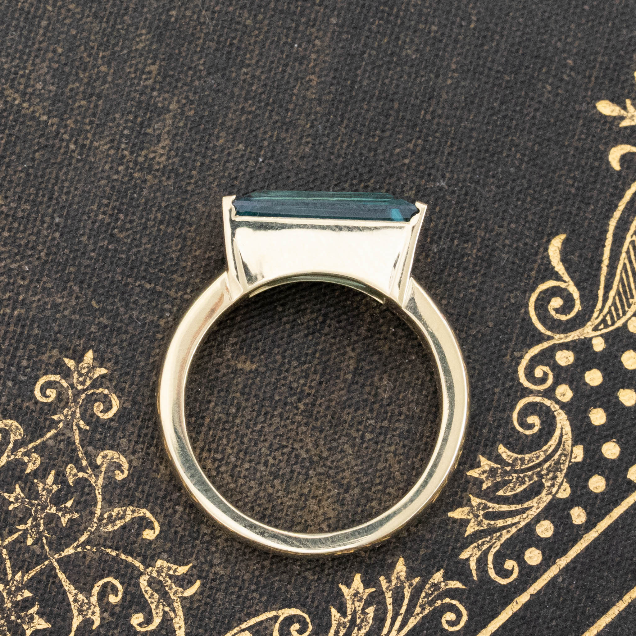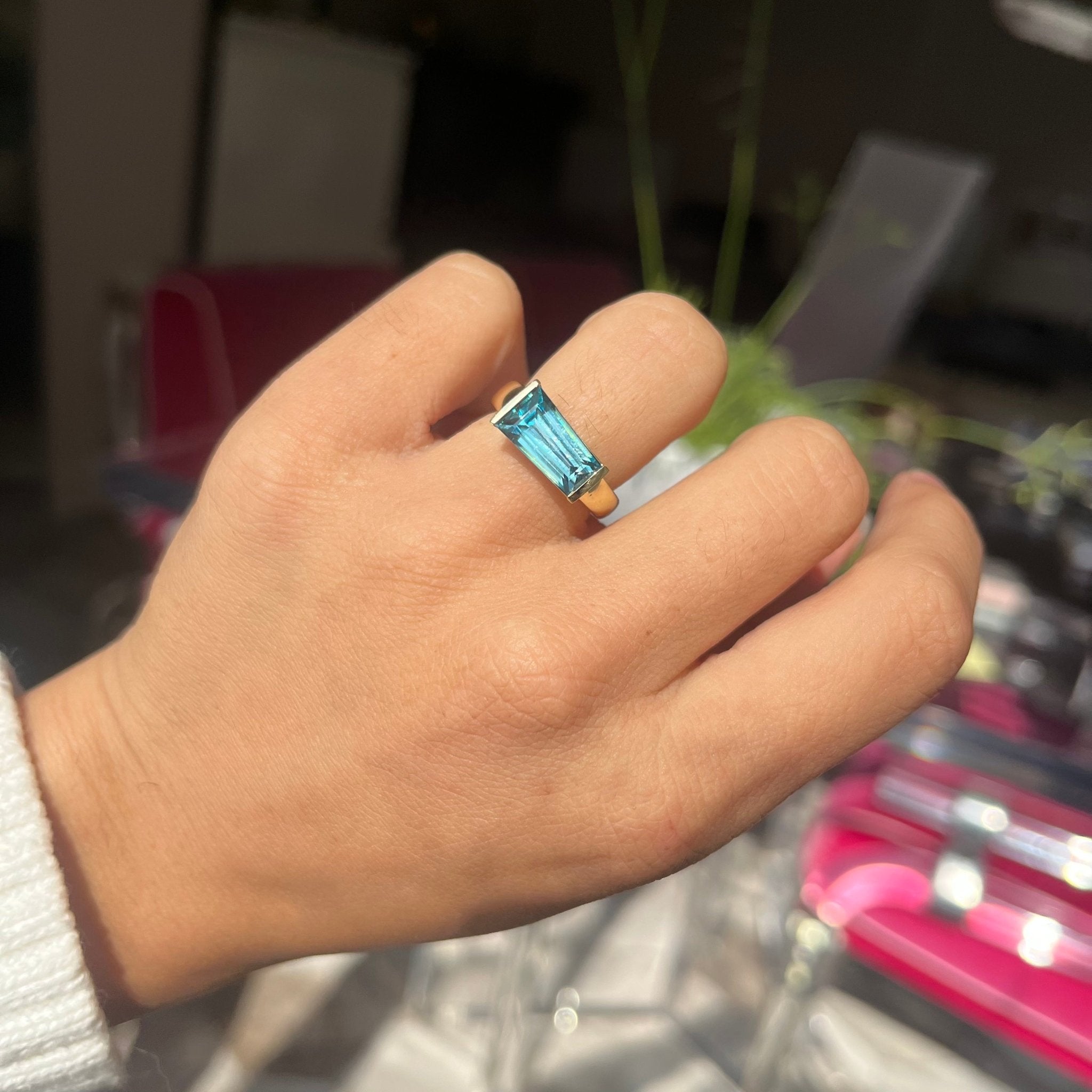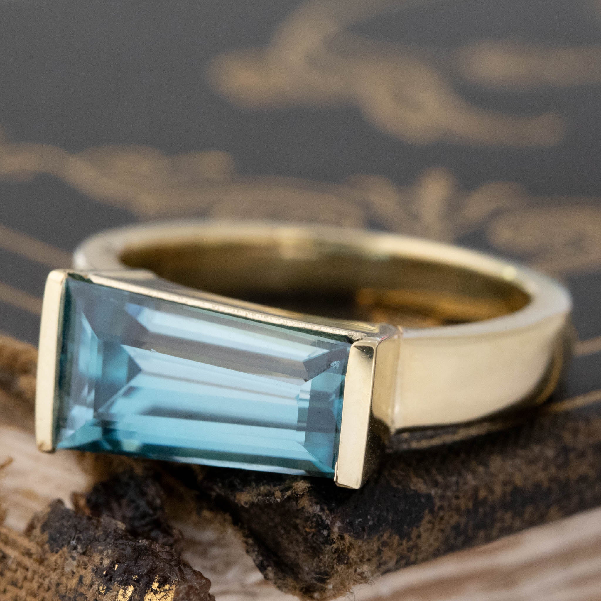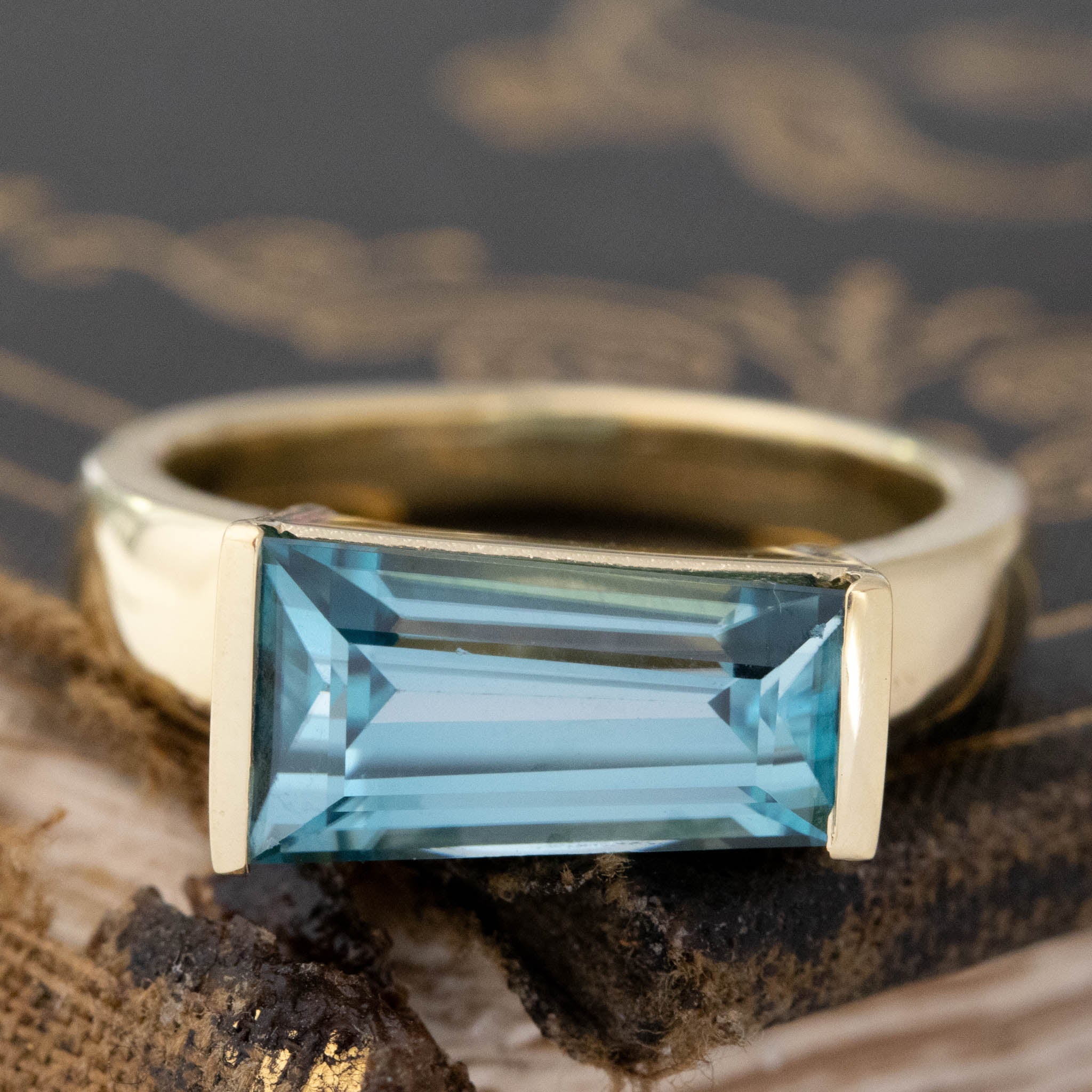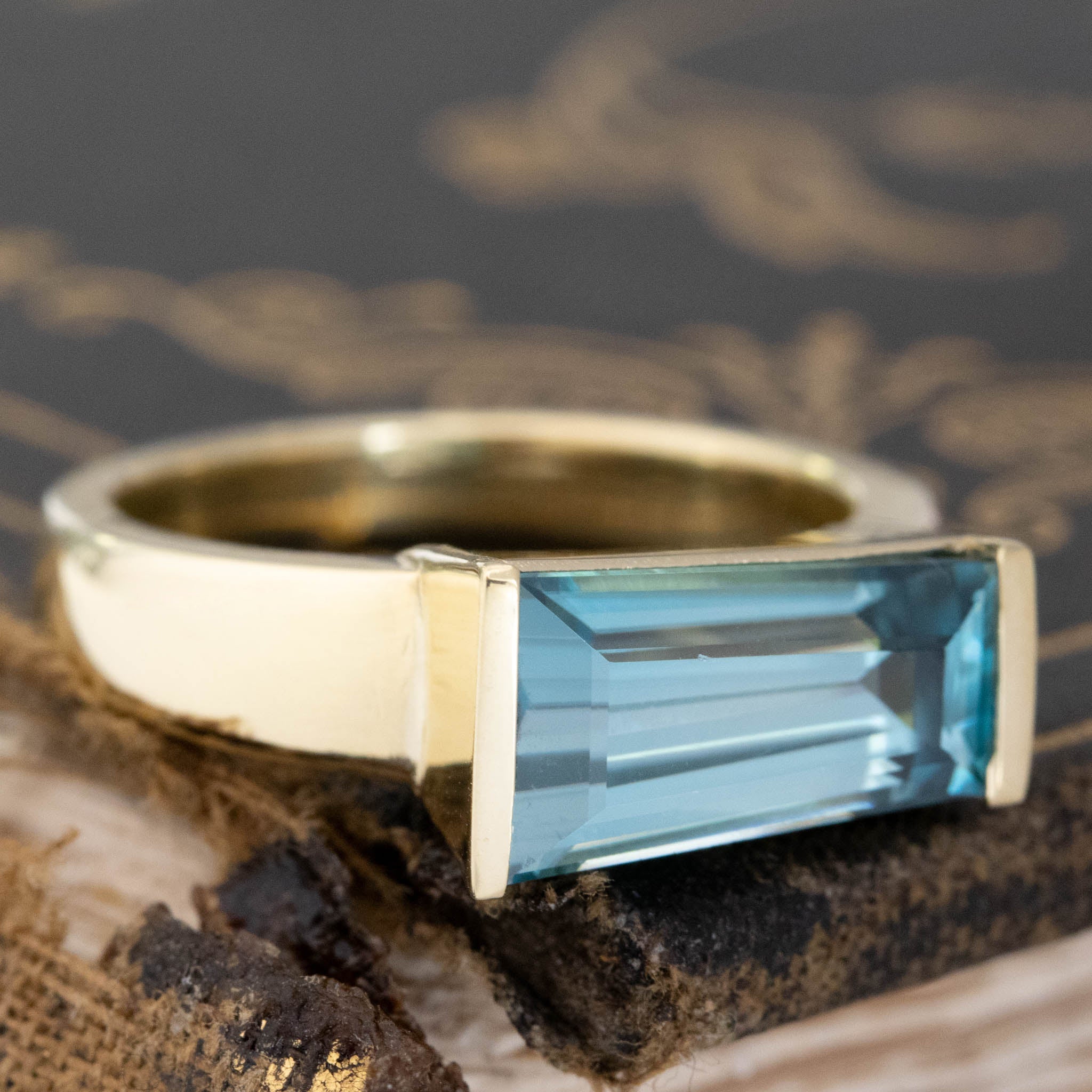 This is probably our favorite way to set a tapered baguette-shaped gemstone! An equally tapered ring setting, which follows the width of the stone that sits in the center. We find it to be so charming, so unique and incredibly elegant on the finger. The baguette has gorgeous spread across the top of one's finger, especially in this delicious blue shade. This aquamarine is crisp and chunky in the best way - the color combo of blue and yellow is also to die for!