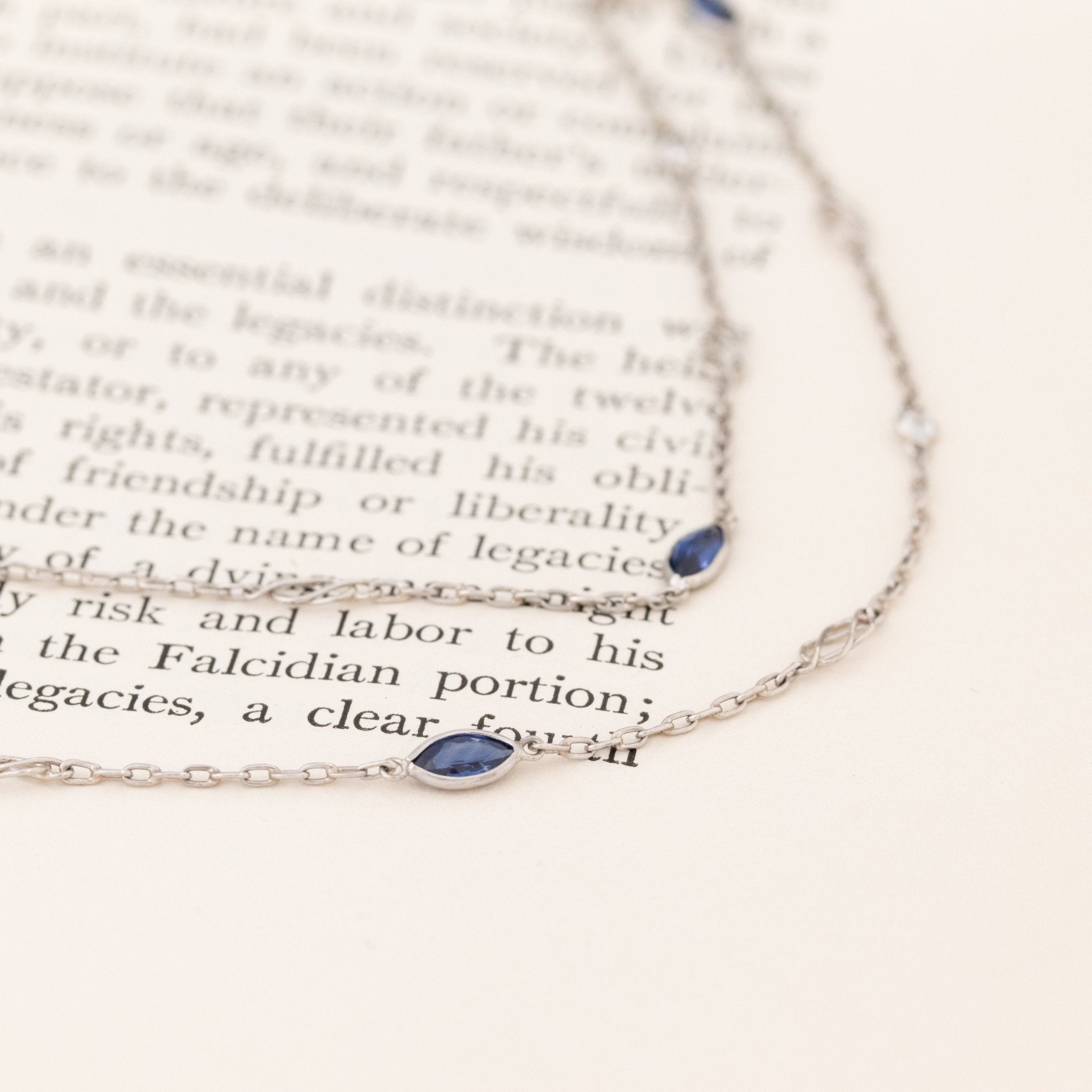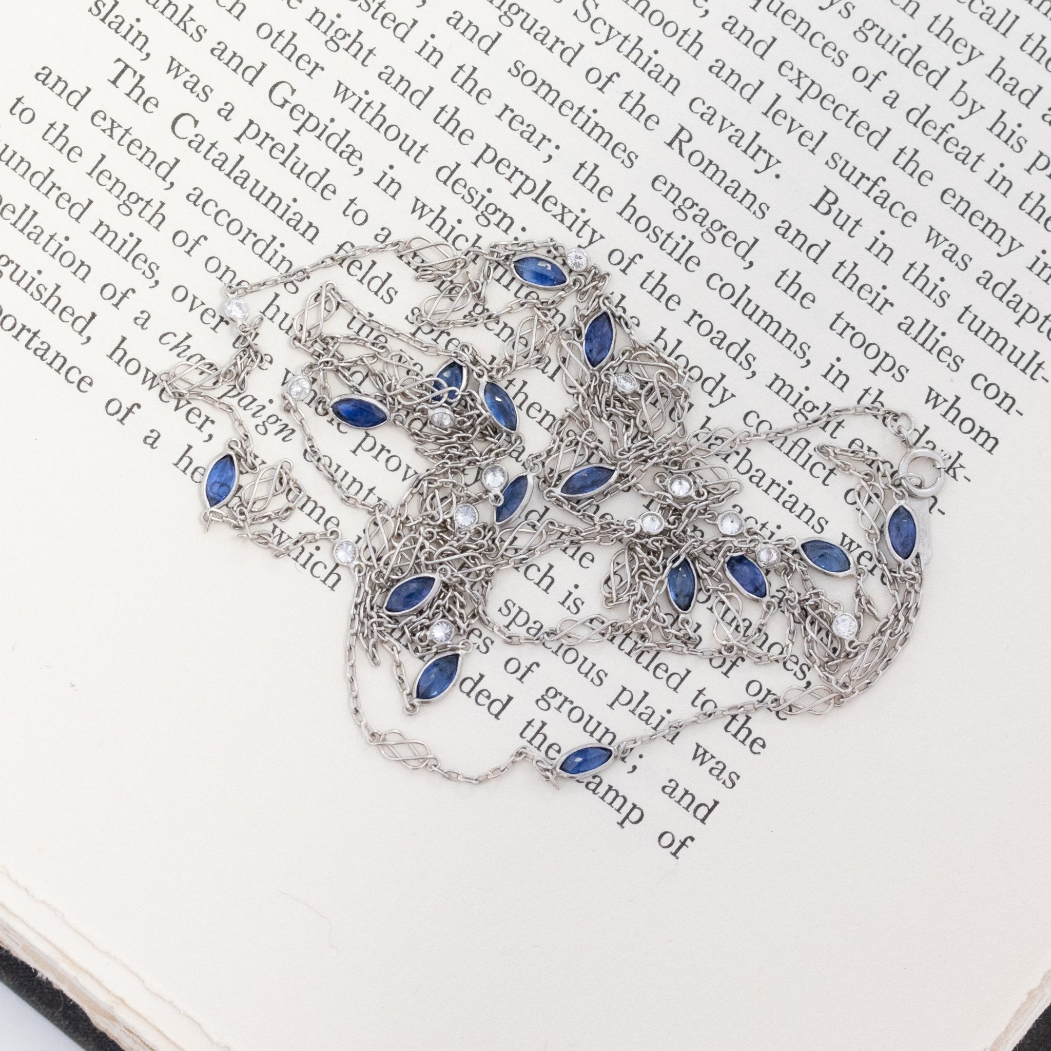 A station necklace that we are absolutely obsessed with! This platinum chain is airy, delicate, and so elegant on the neck, with round diamonds and marquise cut sapphires alternating between one another. The sheer length on this guy is enough to fall in love, but who can resist a sapphire + diamond combo moment? Beautiful layered with itself, or stacked with your other favorite necklaces.