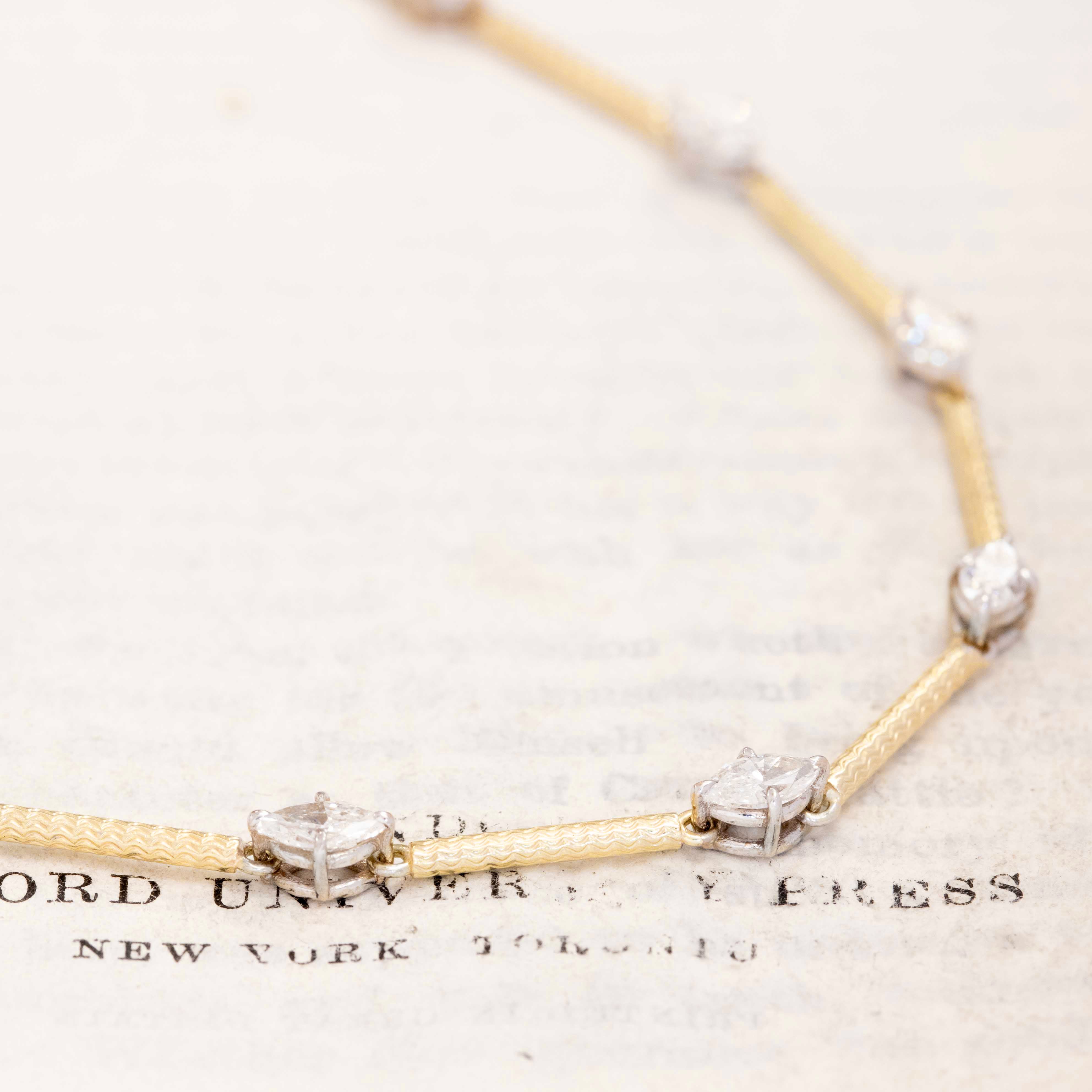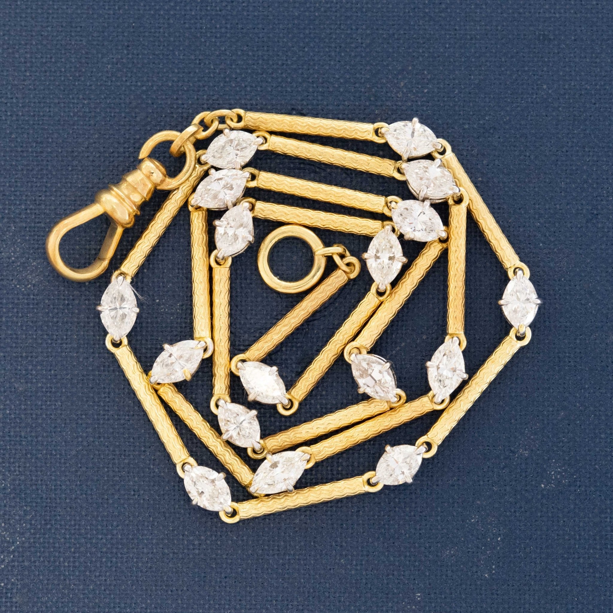 When antique meets vintage! A delicious conversion project which we're pretty obsessed with! We had this antique watch chain for the most extended test, long bar links joined together with smaller circular rings. We decided to really up the ante, and we know no other way than with diamonds! Sparkly little upcycled marquise cuts replace those alternating links, making for the most lovely station conversion necklace we've ever seen. The watch chain, originally too short to be worn around the neck, was also lengthened with the diamonds - a win-win all around!