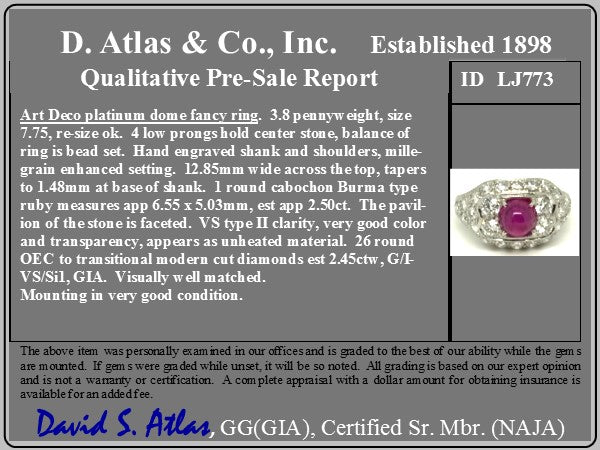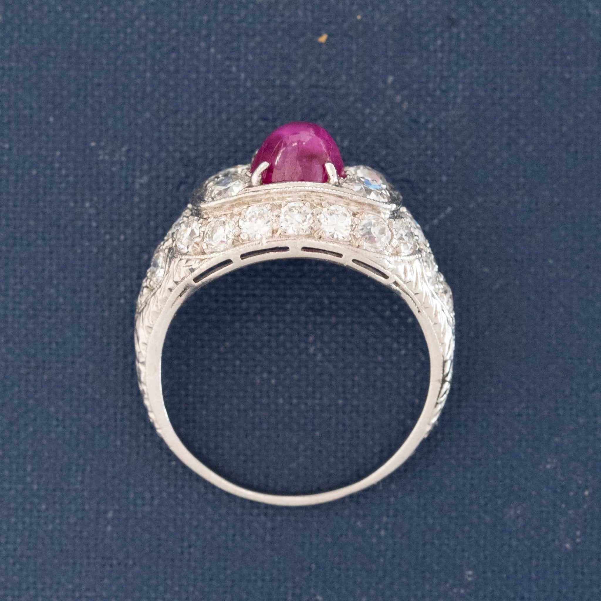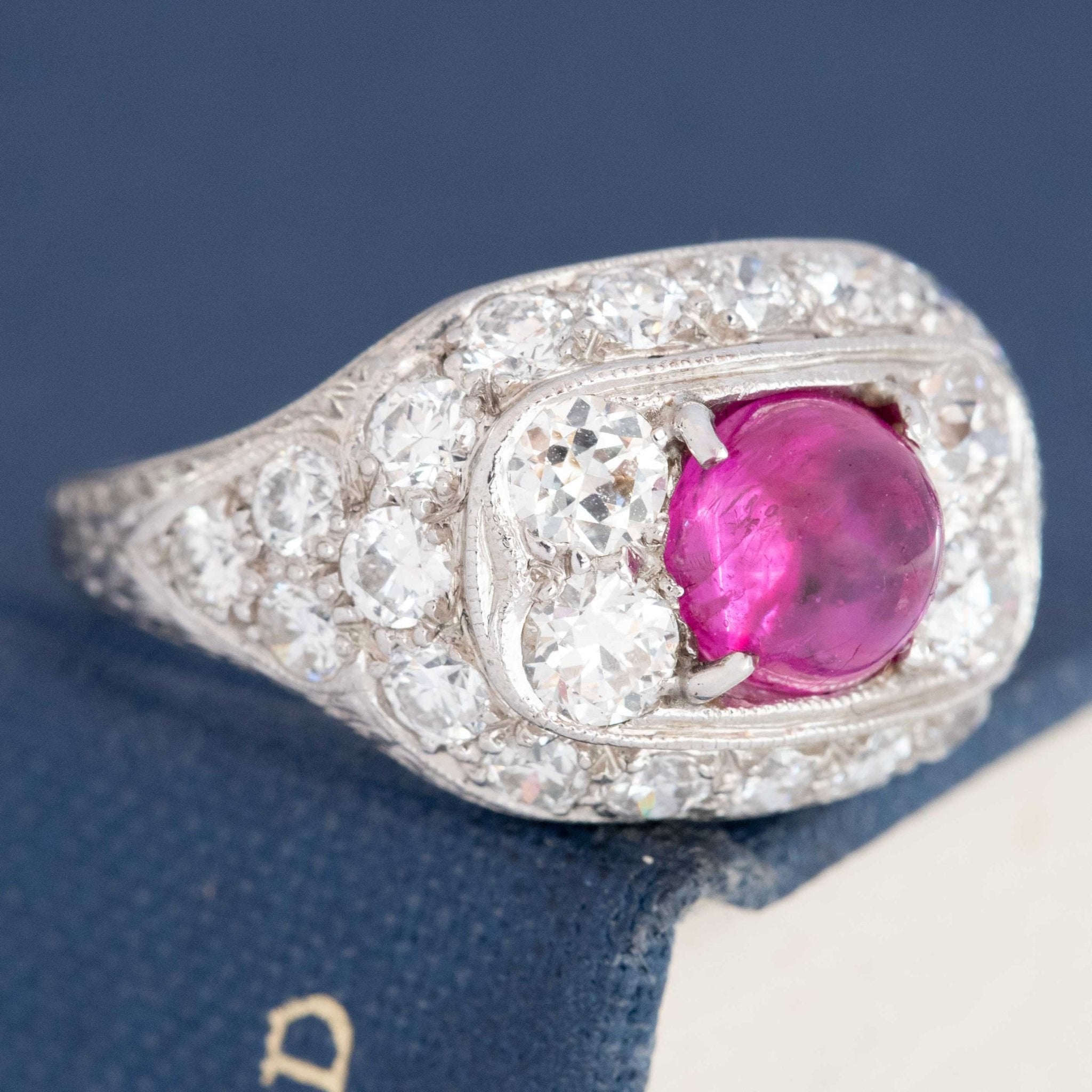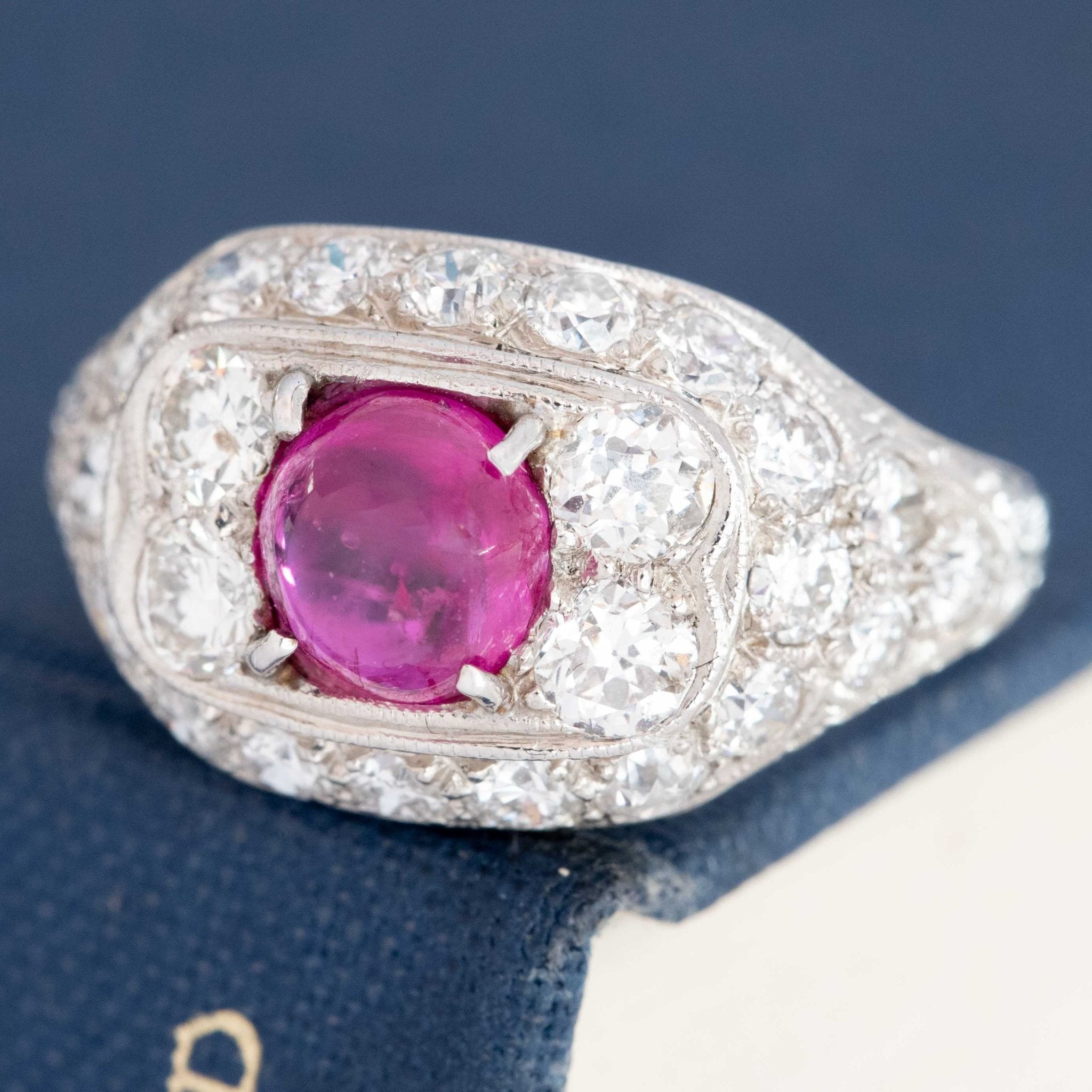 Quintessentially deco! This bold plaque deco-era ring has a gorgeous ruby cabochon in the center, making for a perfect pop of color amidst the sea of bright, white diamonds! Such an elegant ring on the finger.