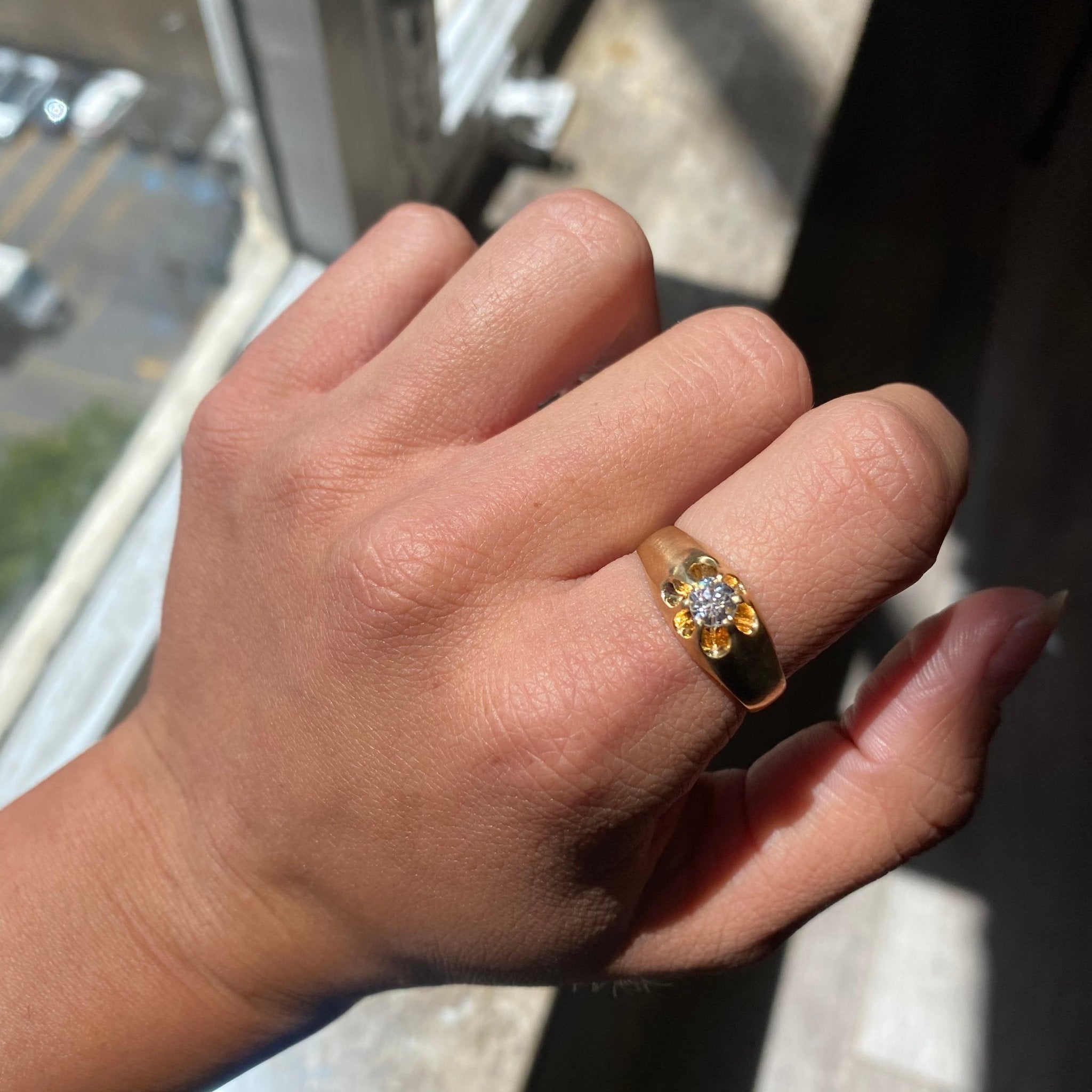 This one is absolutely charming - 18kt yellow gold with a sweet and bright Old European cut diamond sitting front and center! We love the width on this specific ring - she’s bold on the finger without being too heavy, with the perfect touch of sparkle. Easy to stack with other bands, too! We also love that this one came to us in a bigger size, which we don’t find too often.