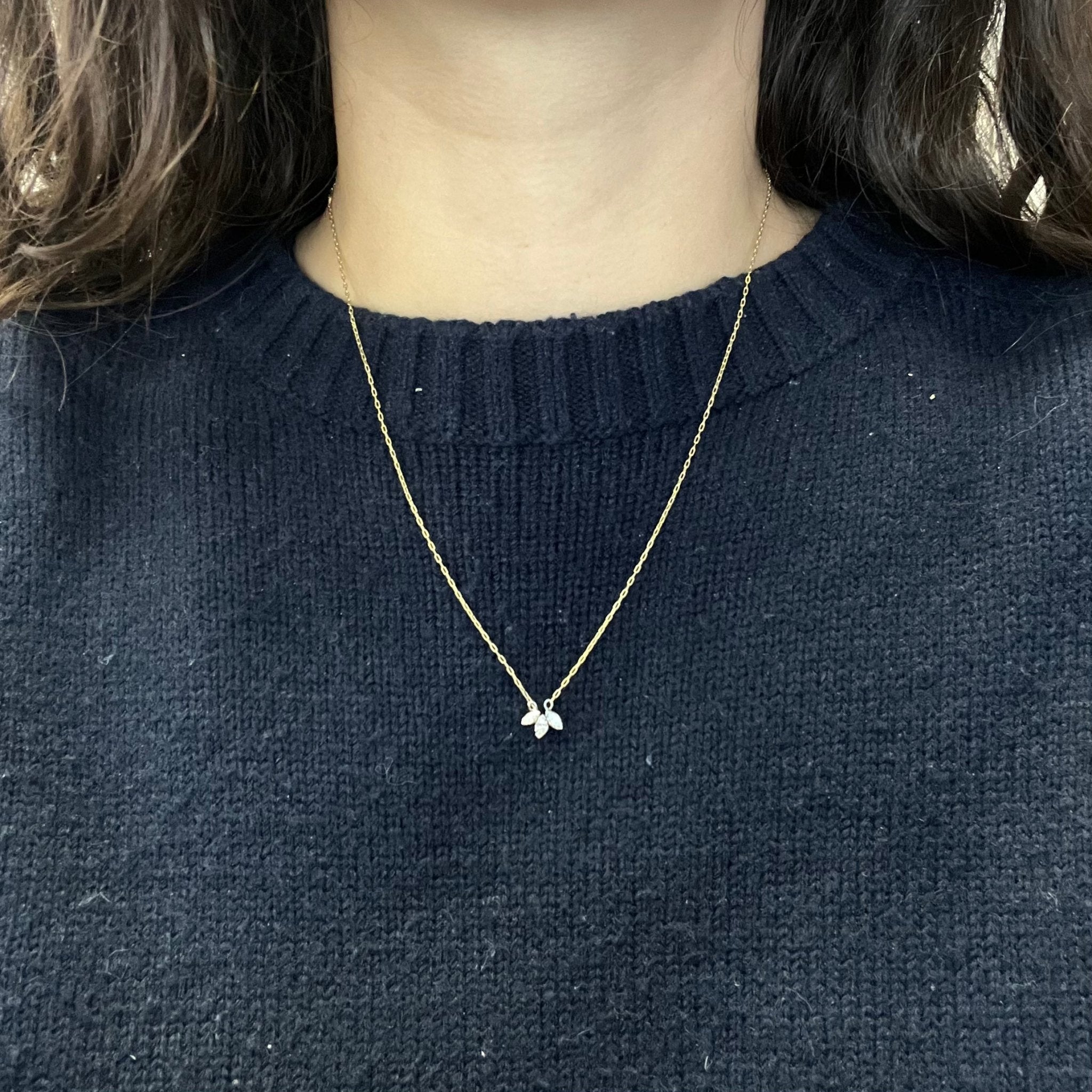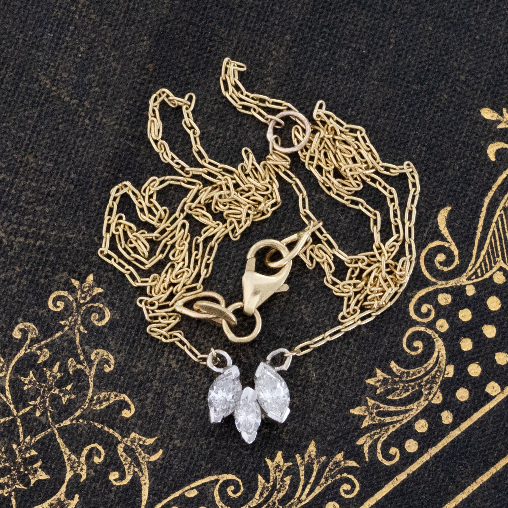 We recently acquired a midcentury-era necklace component from which these trio of vintage marquise cut diamonds were strung. We decided to keep them in other original layouts - both whimsical and playful.