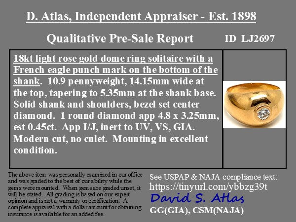 She’s a French little number in 18kt light rose gold - a sweet, pinky middle ground between yellow and rose. We adore the spread of this guy on one’s finger, it’s perfect for those who love a bolder, gold heavy vibe when it comes to their jewelry. The ring also has some patina that we love, but can be buffed out upon request.