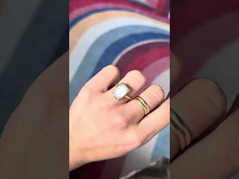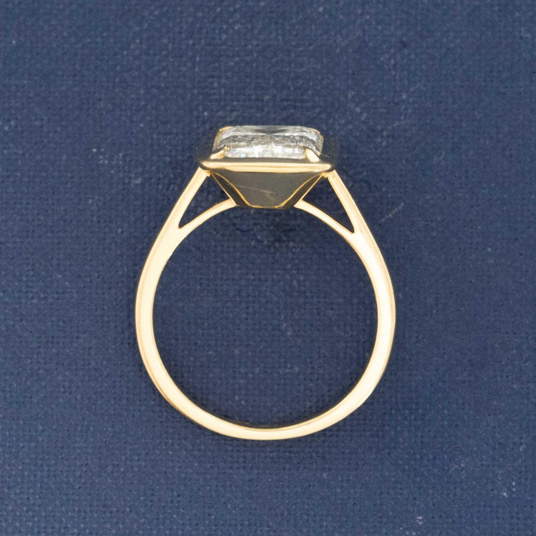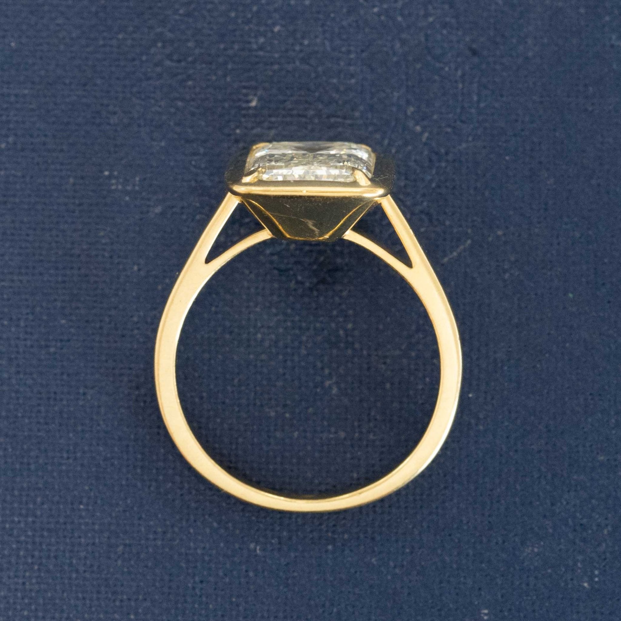 Set in a rich 18kt yellow gold frame and held in place with 4 prongs, the diamond feels both bold and refined— perfectly balanced. The bezel frames the stone beautifully, making that already impressive 5 carats look even bigger! It’s a clean, sculptural setting that feels super chic on the hand. The diamond has the faintest hint of warmth to her, with a little pinpoint inclusion off to the side of the table, but eye clean otherwise!