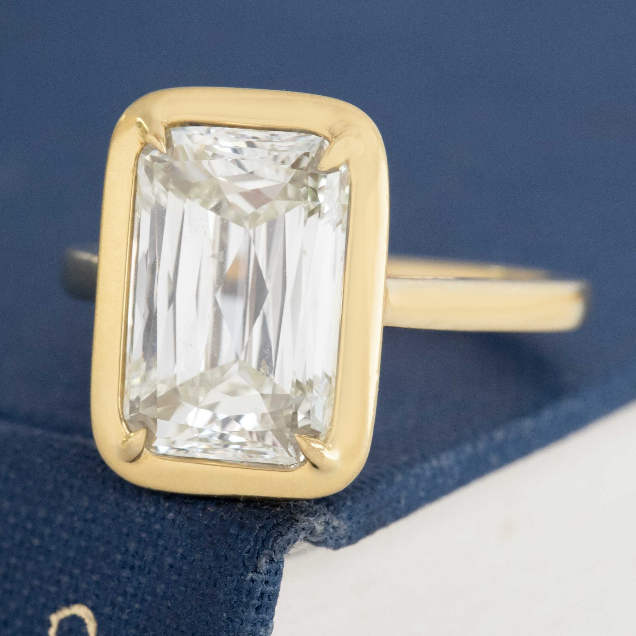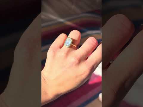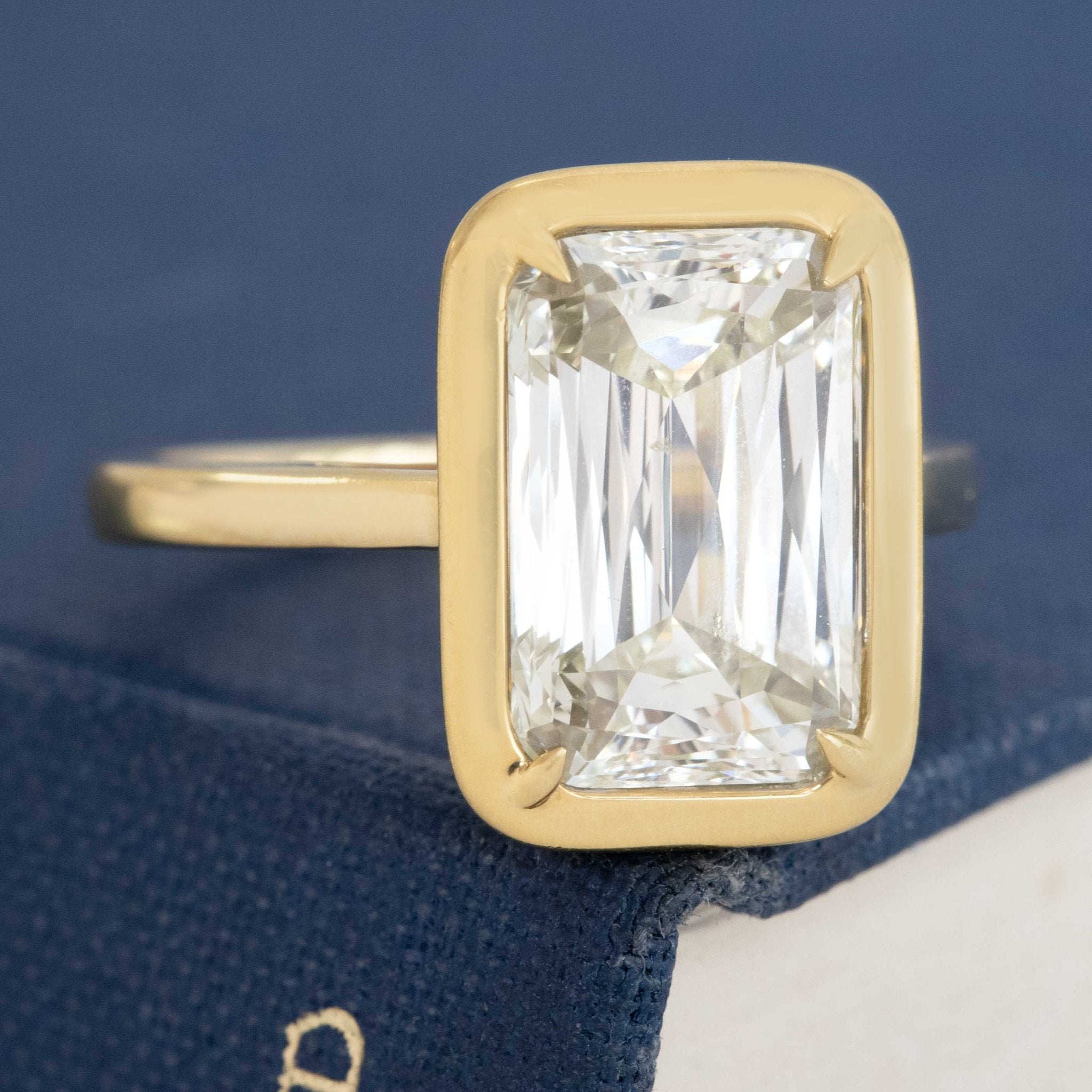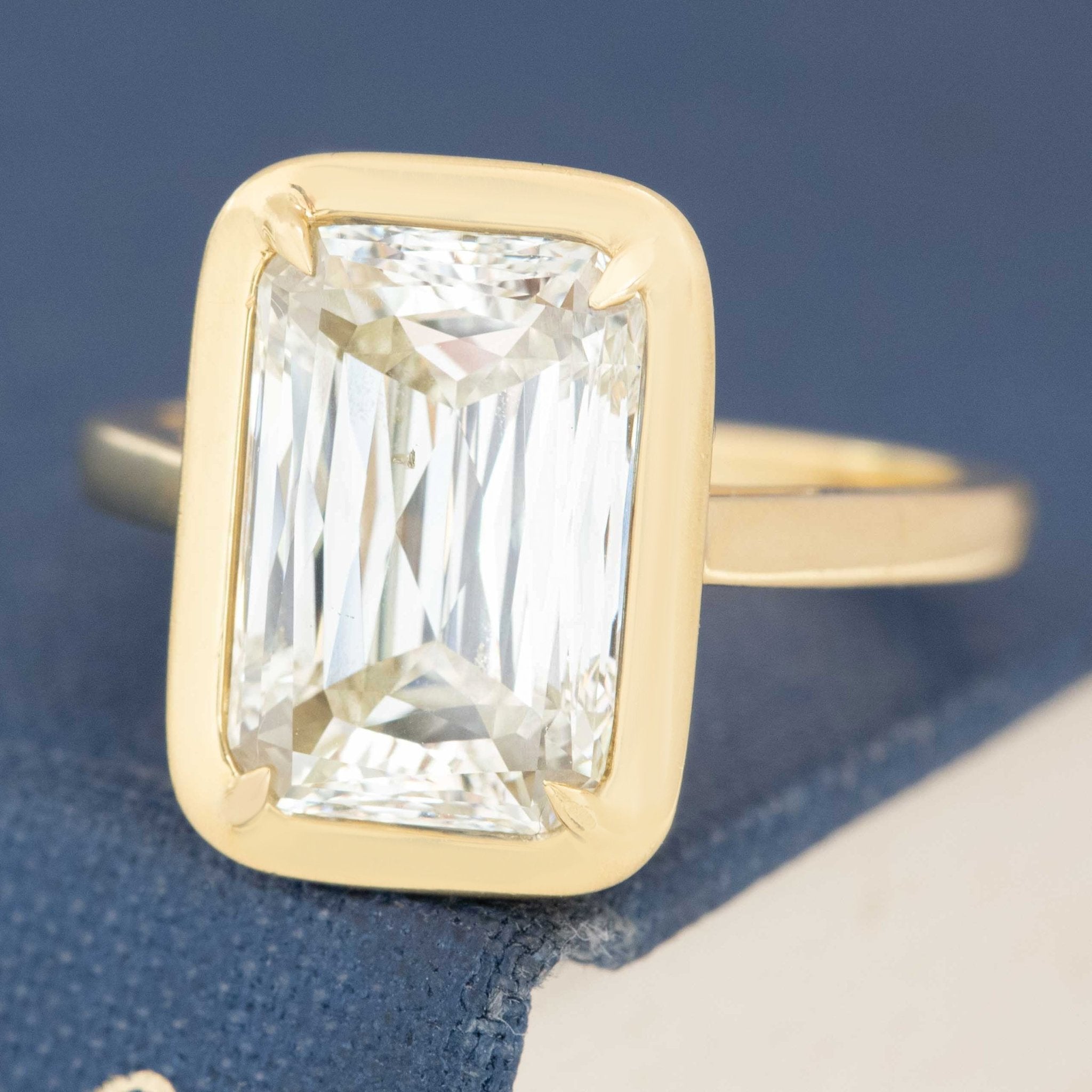 Set in a rich 18kt yellow gold frame and held in place with 4 prongs, the diamond feels both bold and refined— perfectly balanced. The bezel frames the stone beautifully, making that already impressive 5 carats look even bigger! It’s a clean, sculptural setting that feels super chic on the hand. The diamond has the faintest hint of warmth to her, with a little pinpoint inclusion off to the side of the table, but eye clean otherwise!