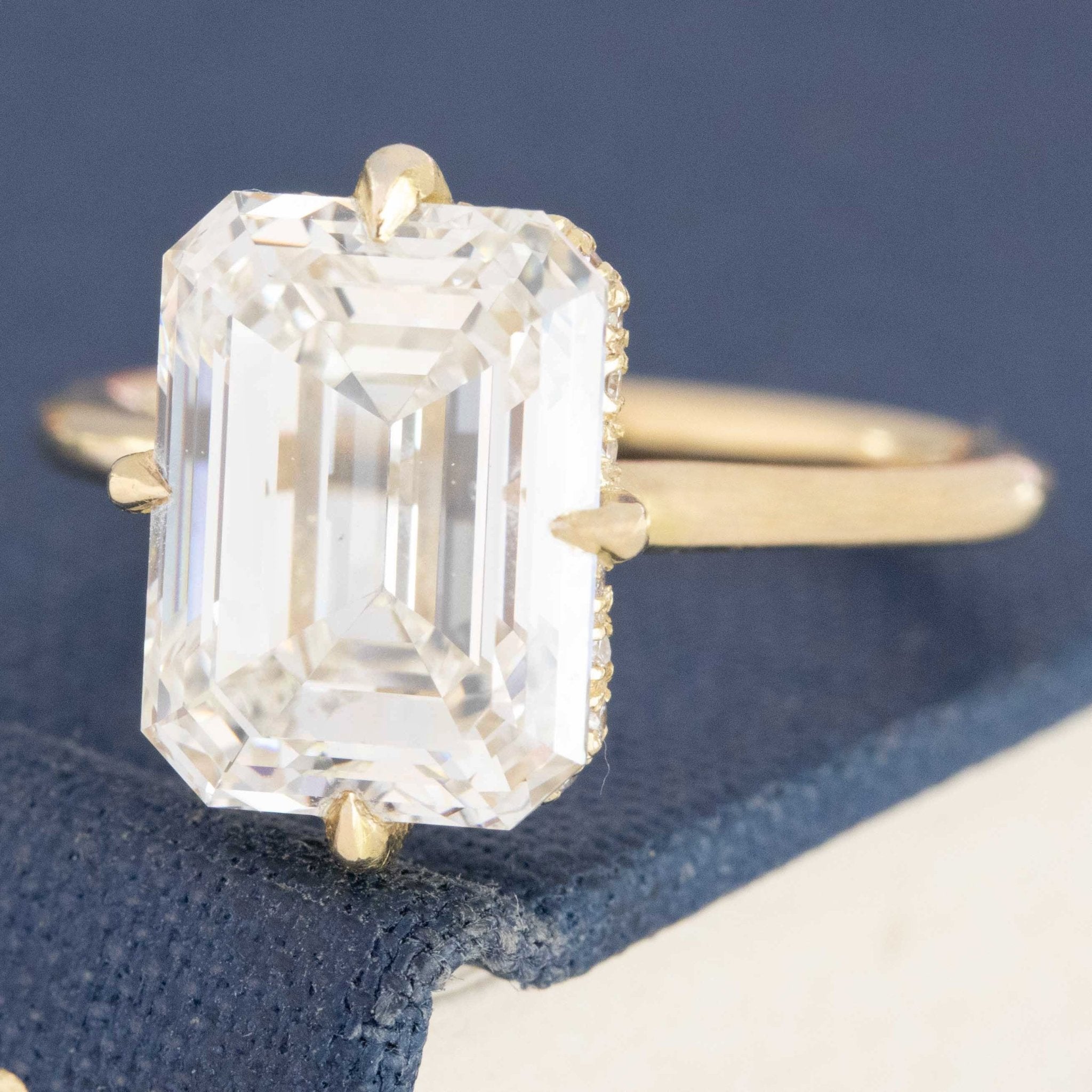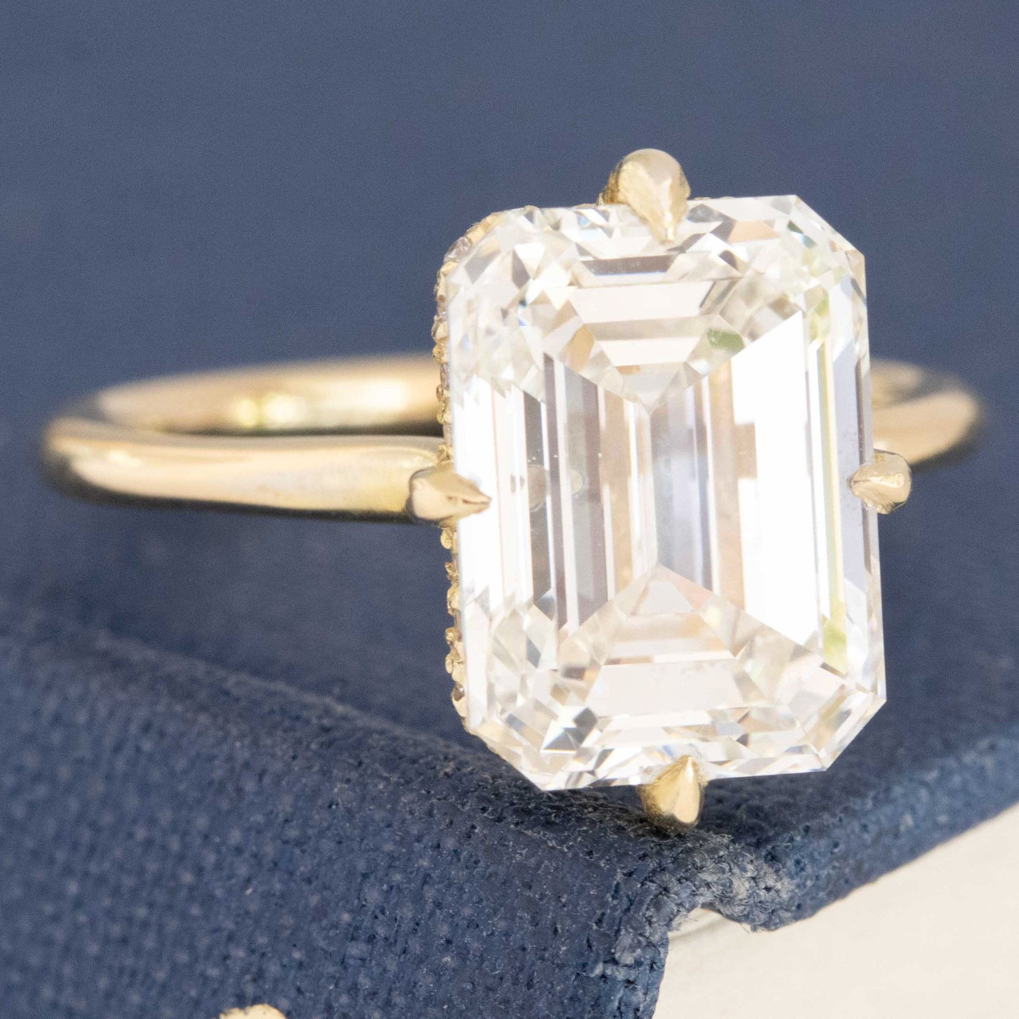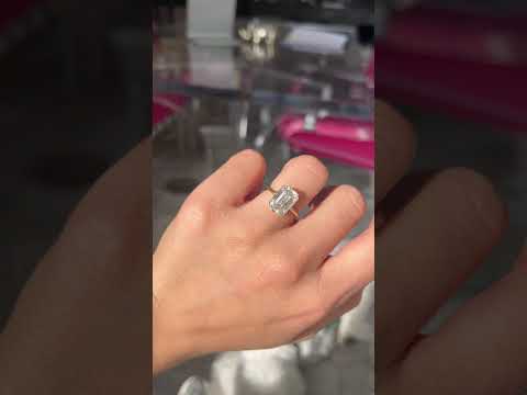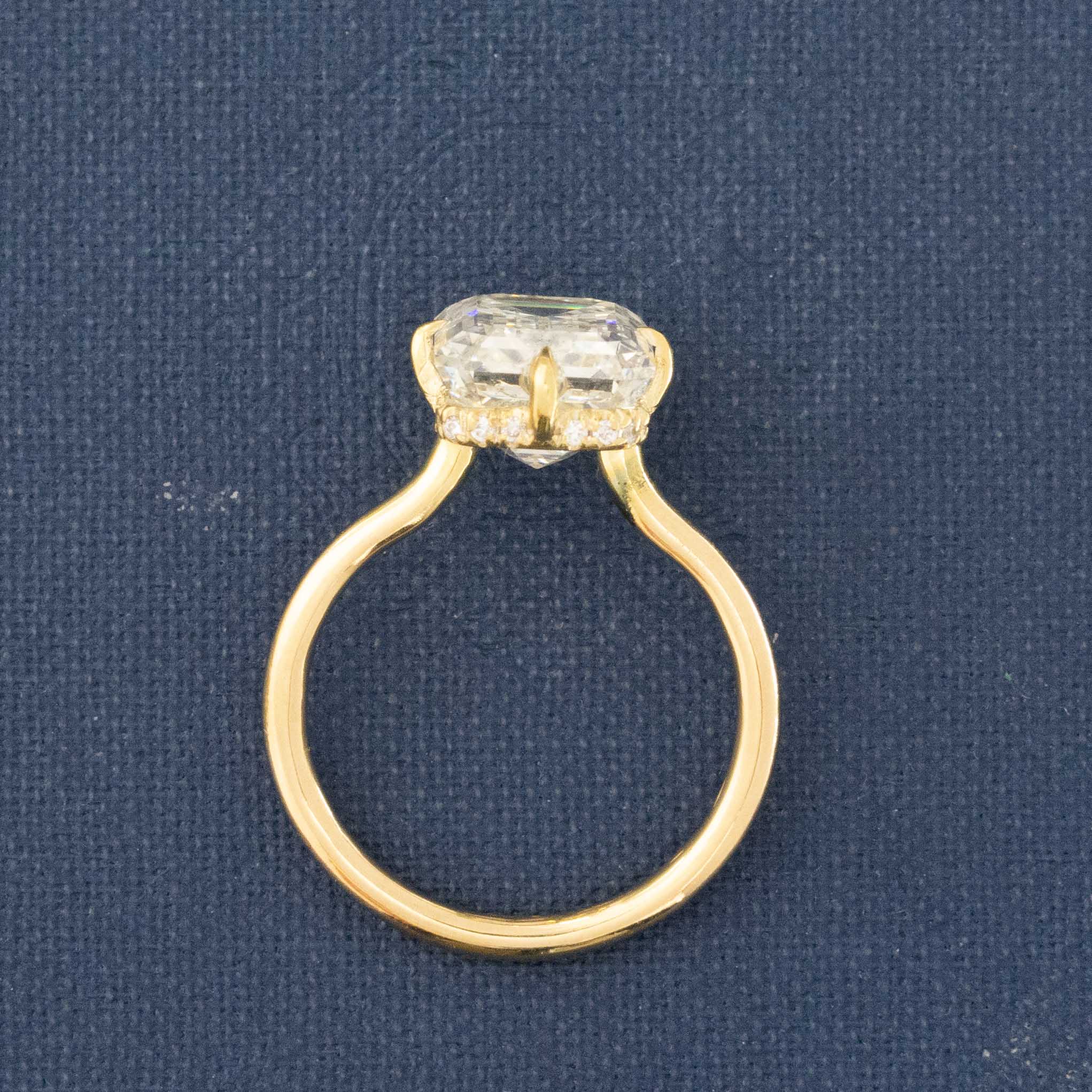 Ah, the beauty of larger step cut diamonds! As timeless and elegant as they come. The diamond has classic proportions, with crisp faceting and a bright face up. Set in warm yellow gold with a hidden halo, she is the perfect engagement ring - so, so elegant on the finger.