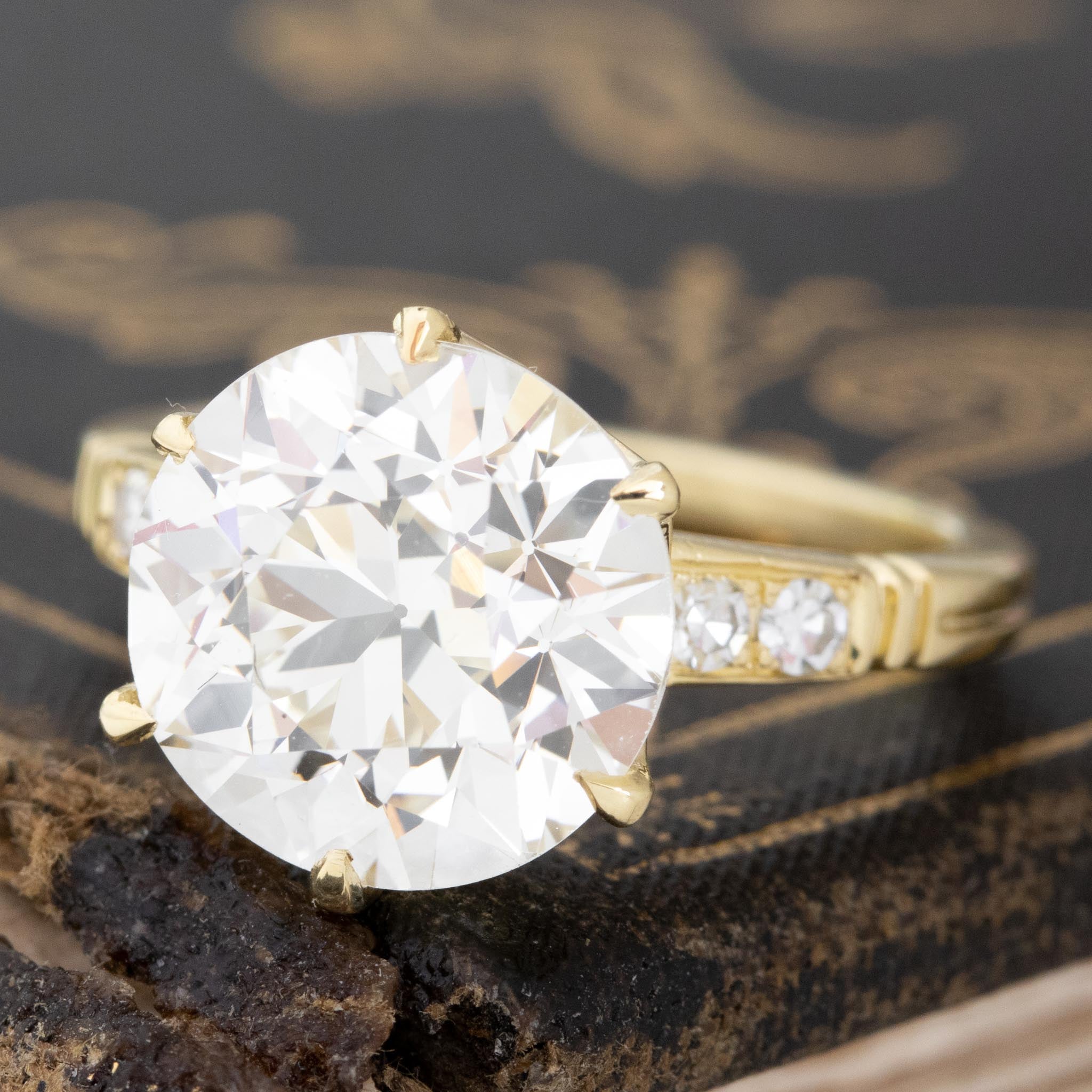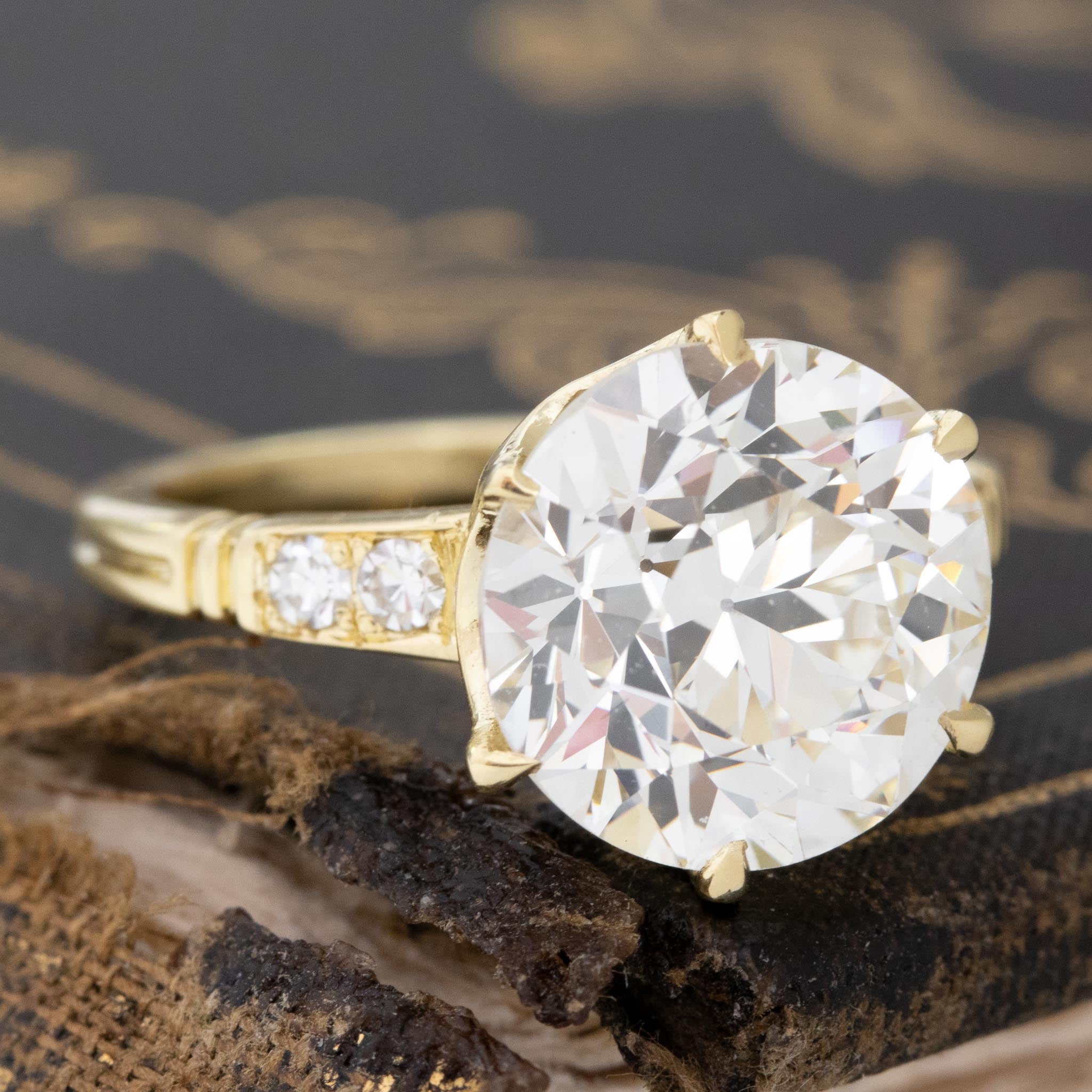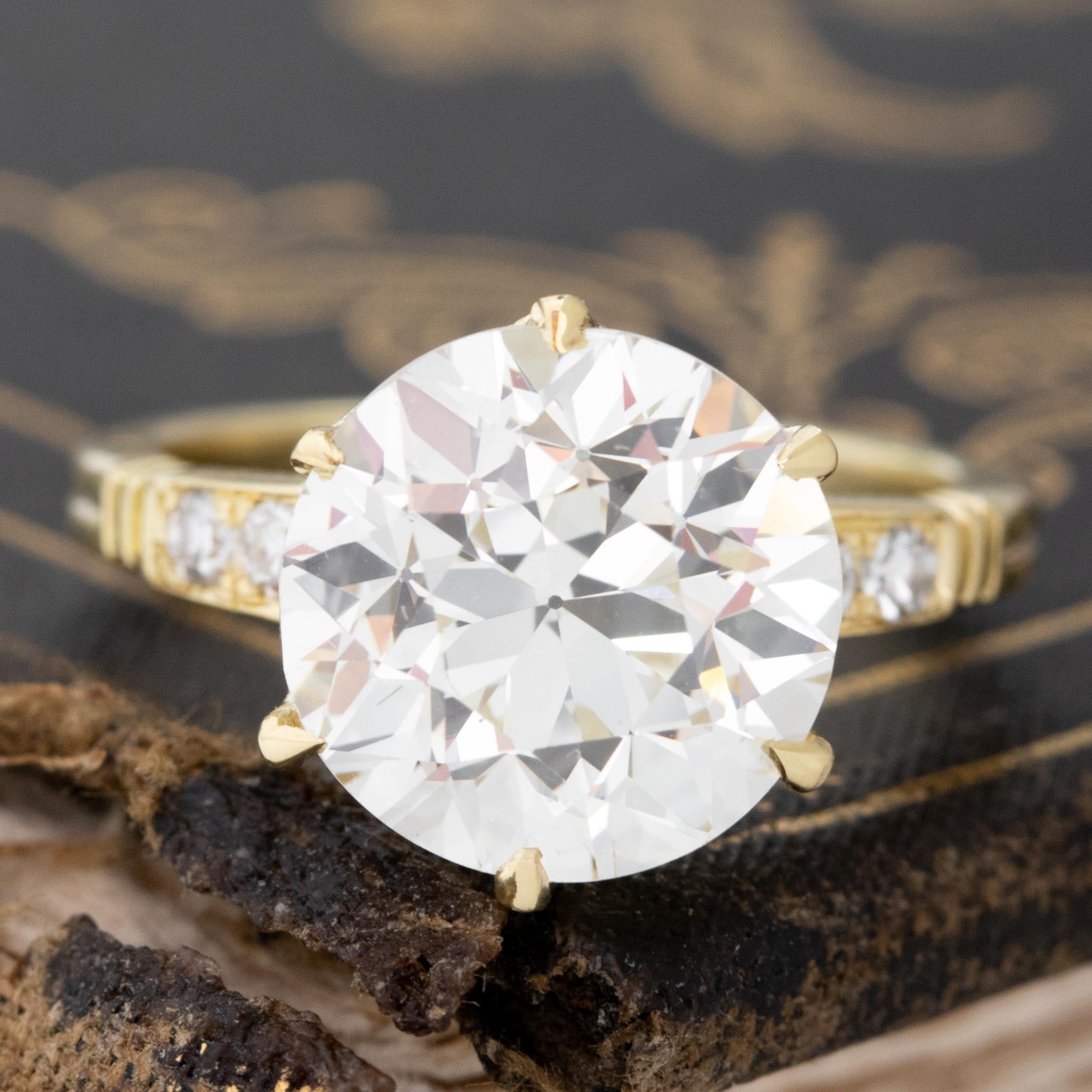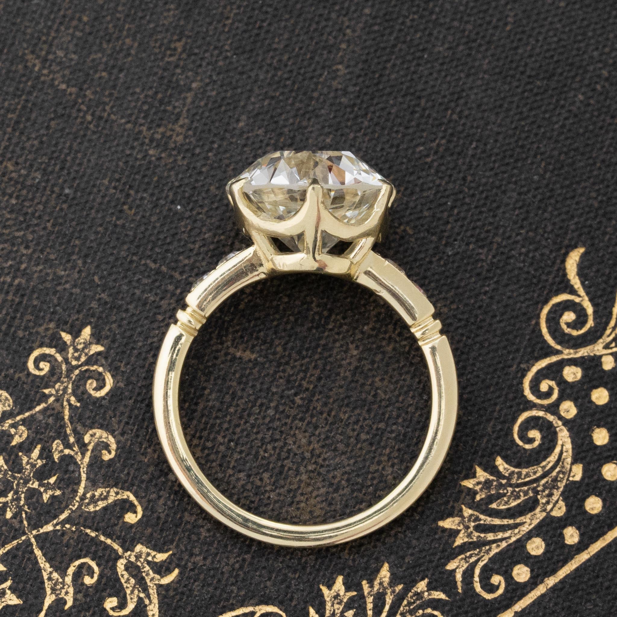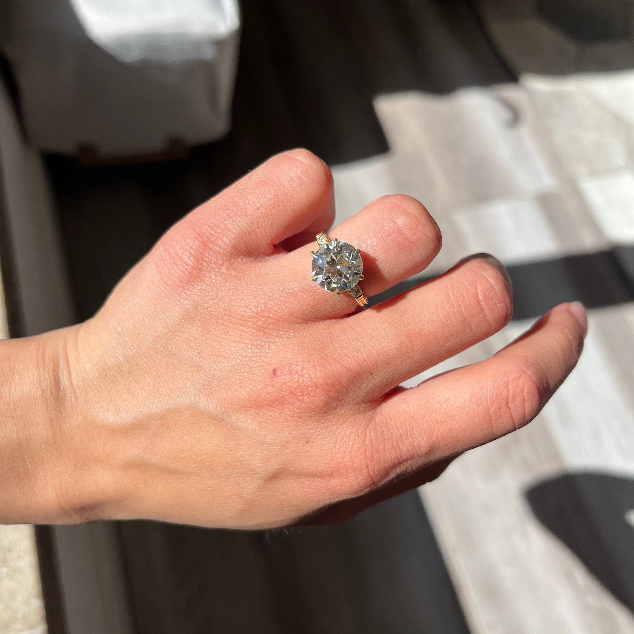A ring with so much to offer, we just adore her to bits! The central diamond is a lovely transitional cut diamond with killer faceting and a very white face up for its color. Bright and prismatic - she is a little fireball! Set in our antique-inspired mounting with bead set single cuts on the shoulders, the ring is elegant and timeless. It doesn't hurt that the diamond looks closer to a 5.50cts too!