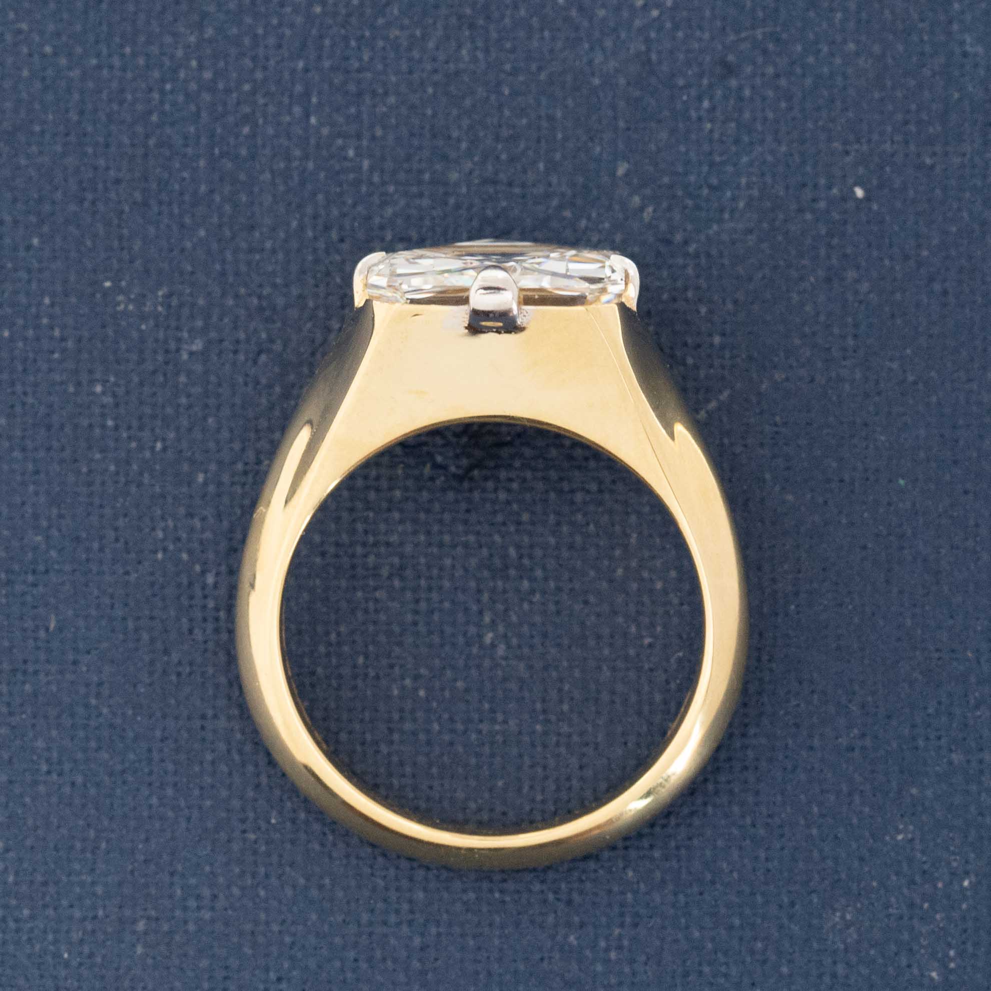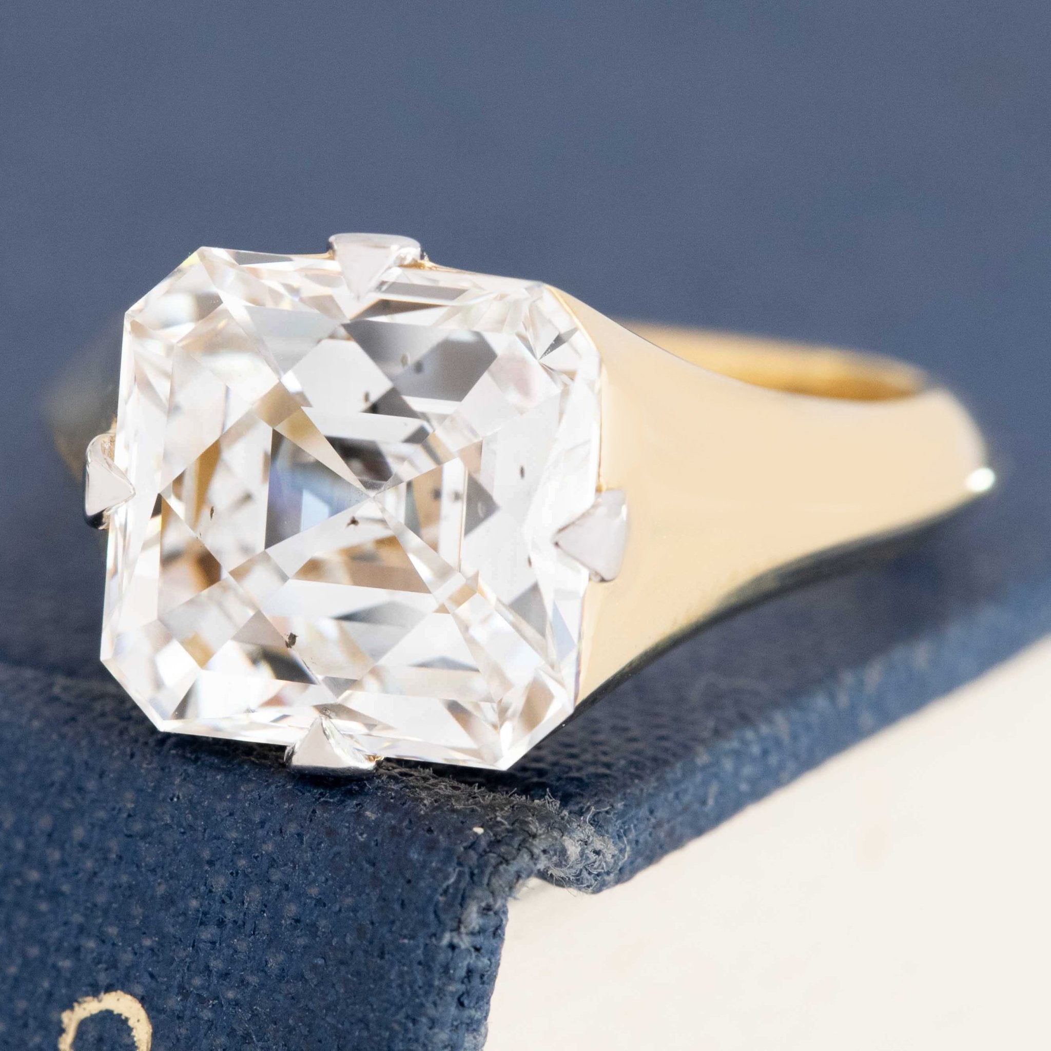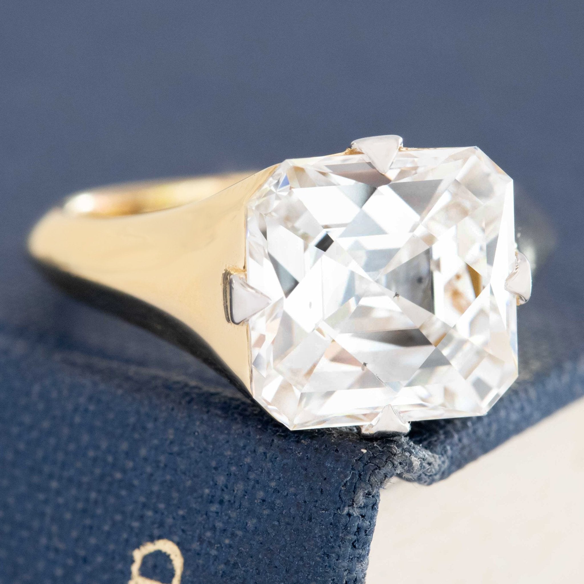 This one wins as a personal Grace fave amongst our latest release! The diamond is a vintage Tycoon cut - cut initially in 2004 (engraved with the original GIA number and dated as such). And we love it so because of its unique faceting pattern - a mix of the asscher cut and criss cut diamond cuts. Crisp, clear, and just so incredibly bright and prismatic. Looking down upon the diamond is such a treat - like looking at a tide pool. Set in our custom yellow gold setting with white tipped prongs - she is elegant and sexy - the perfect vintage diamond in a contemporary "now" setting.