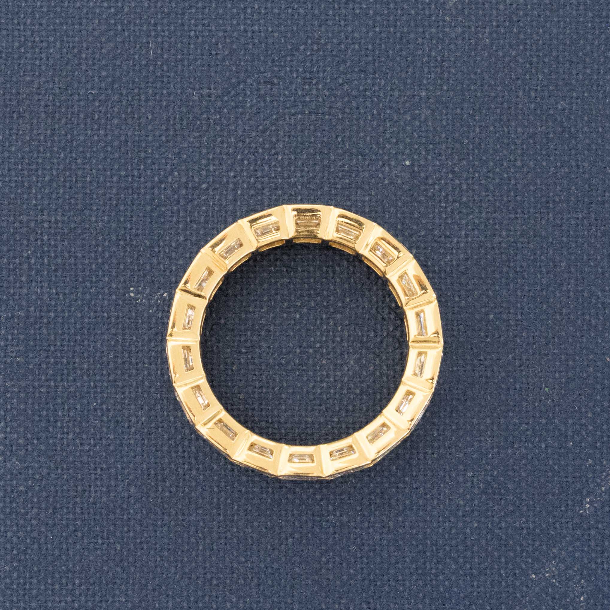 Nothing is more timeless, more elegant, and simply more exquisite than an emerald cut diamond eternity band? The band is the epitome of understated but carries with it big diamond energy. The diamonds are custom cut to mimic the art deco emerald cuts oof the era - with charming open culets and broader faceting. We set her in a low profile yellow setting to help it sit more flush with an engagement ring or to stack with other bands!