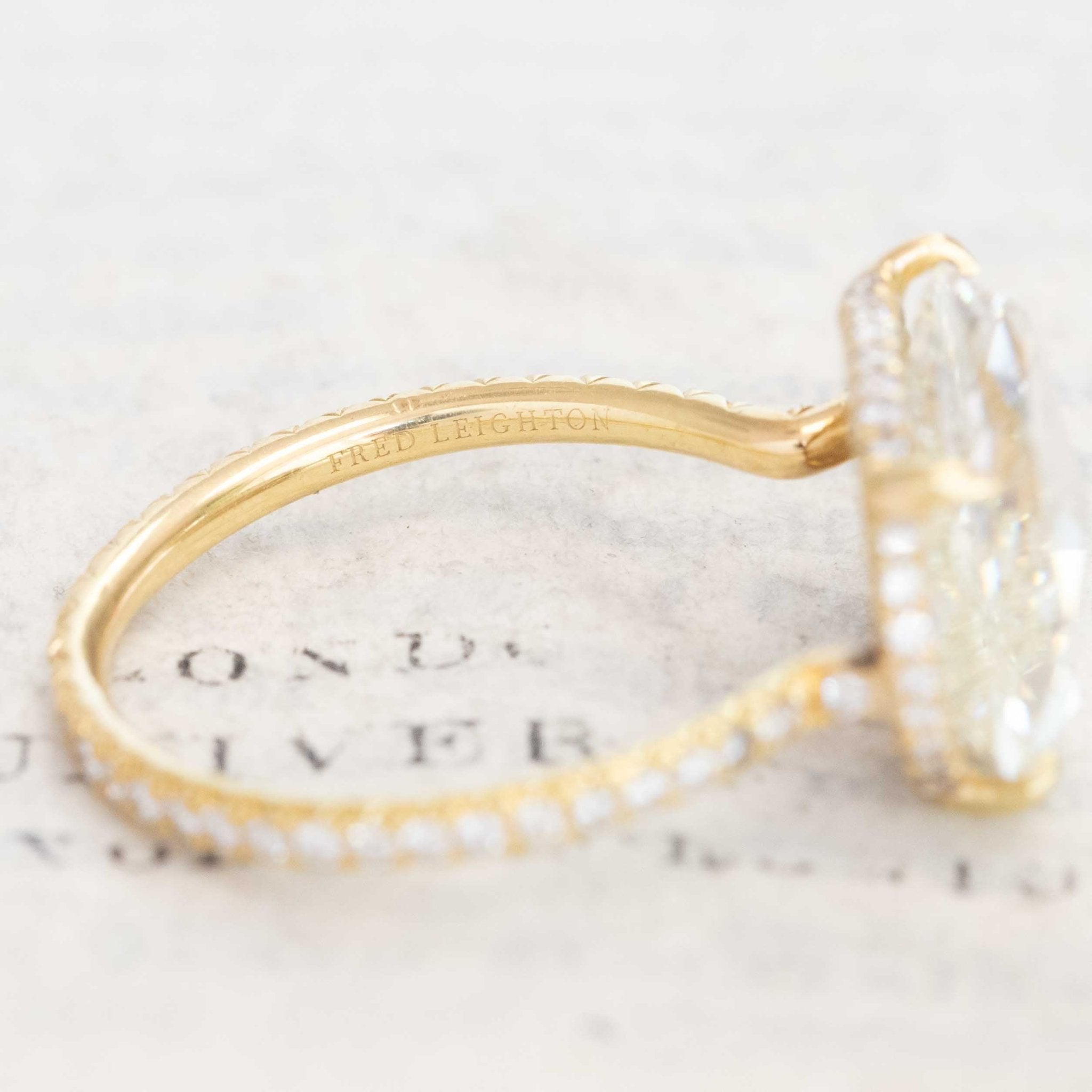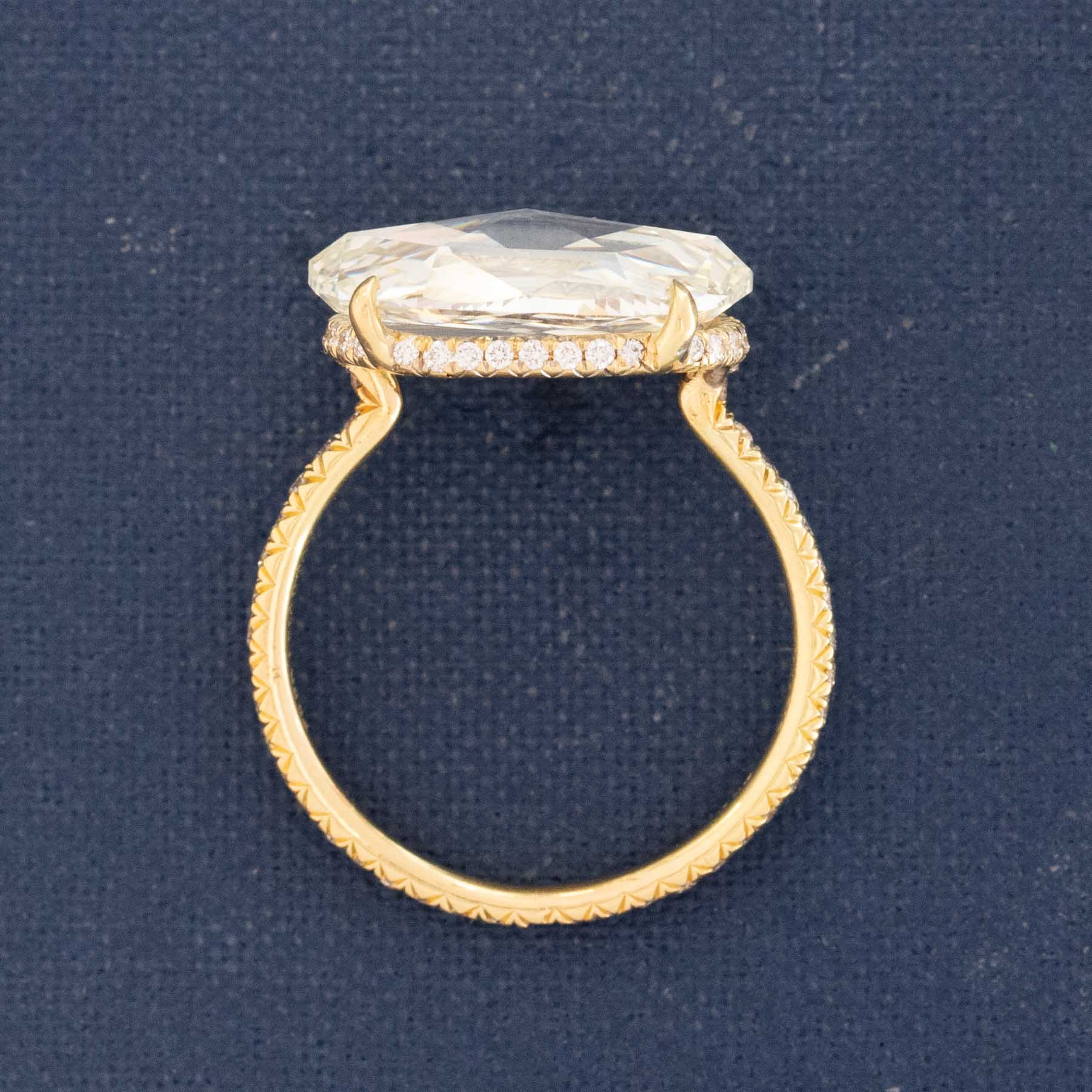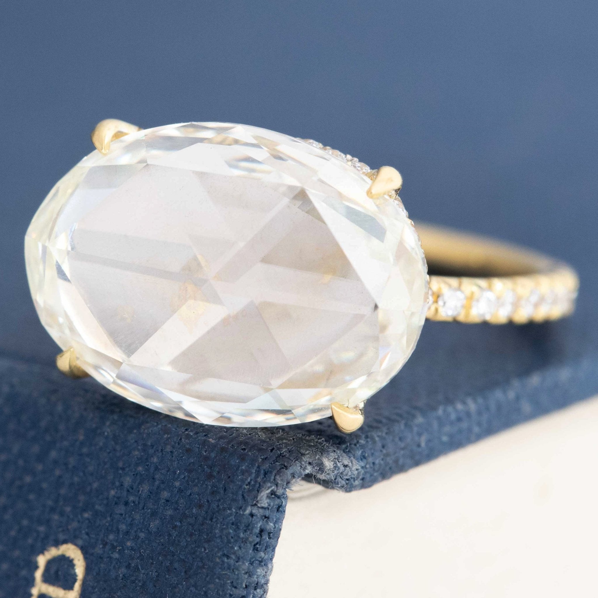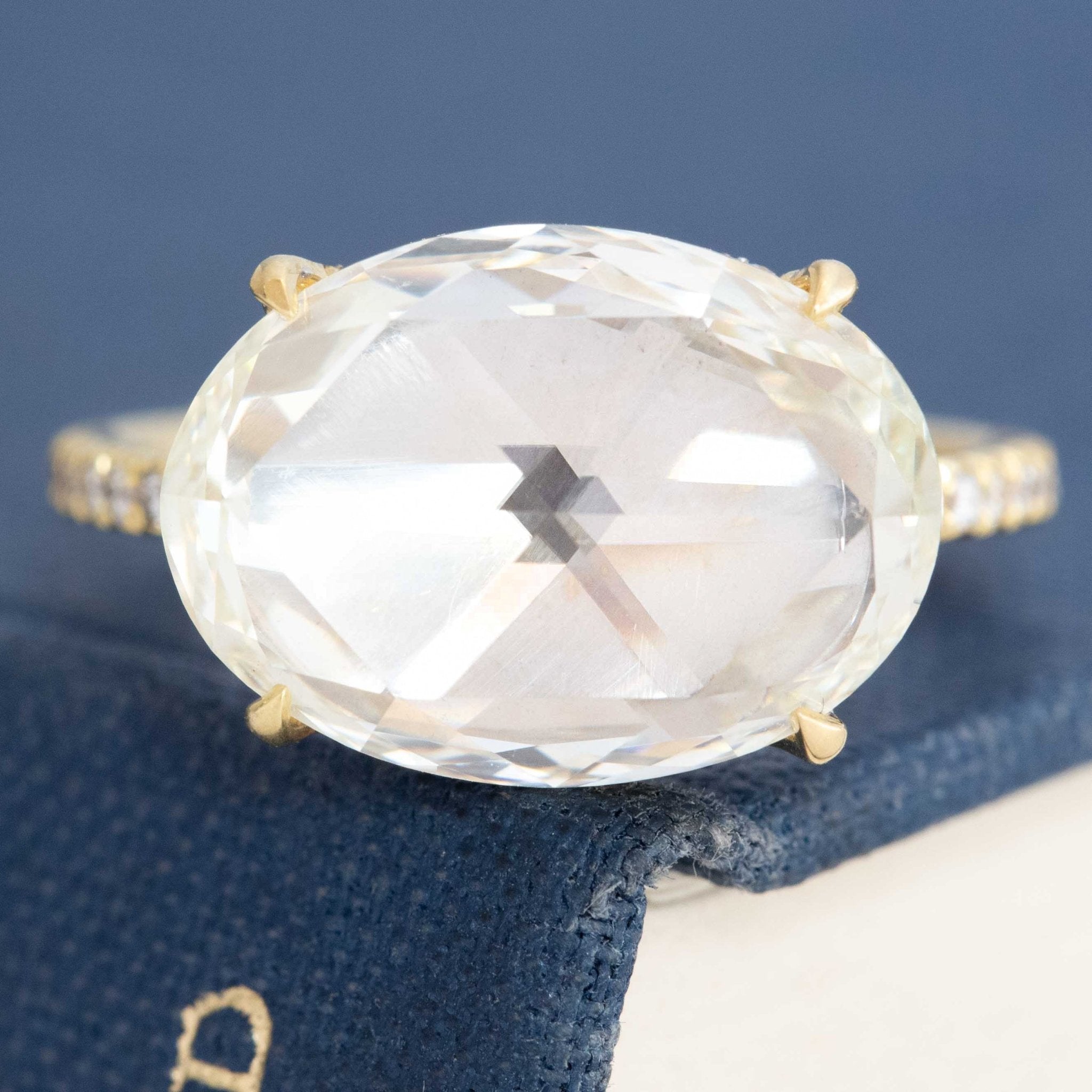 Spectacular in its own right! This 5.24ct oval rose cut diamond is everything we want in a rose cut - high dome, beautiful faceting, prismatic face up and just an incredibly elegant silhouette! Set in this beautiful pave setting by Fred Leighton - beautifully done pave on the shank and a hidden halo on the gallery. Killer finger coverage and incredibly classy on the finger to boot. Lastly, the diamond is also sitting on a white gold plaque at its base - much like the Georgian and Victorian rose cut jewels we love so much!