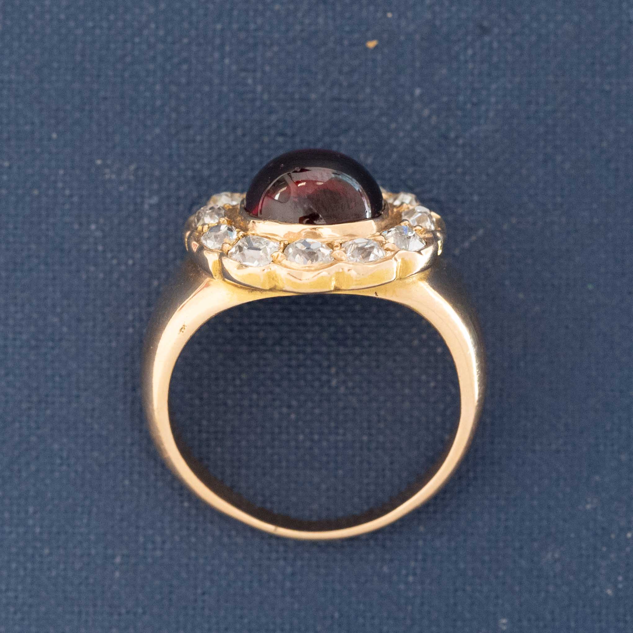 One of the most fabulous, chunkiest cluster rings we’ve come across as of late! In the most gorgeous light rose gold, this bold garnet cabochon sits front and center with an old mine cut halo on a wide tapering yellow gold band. The cabochon sits in a bezel while the diamonds are all bead set in a scalloped top, giving you a chic floral look with the most beautiful, deep color and sparkle. Big 1960’s, 1970’s vibes from this one, in the absolute best way.