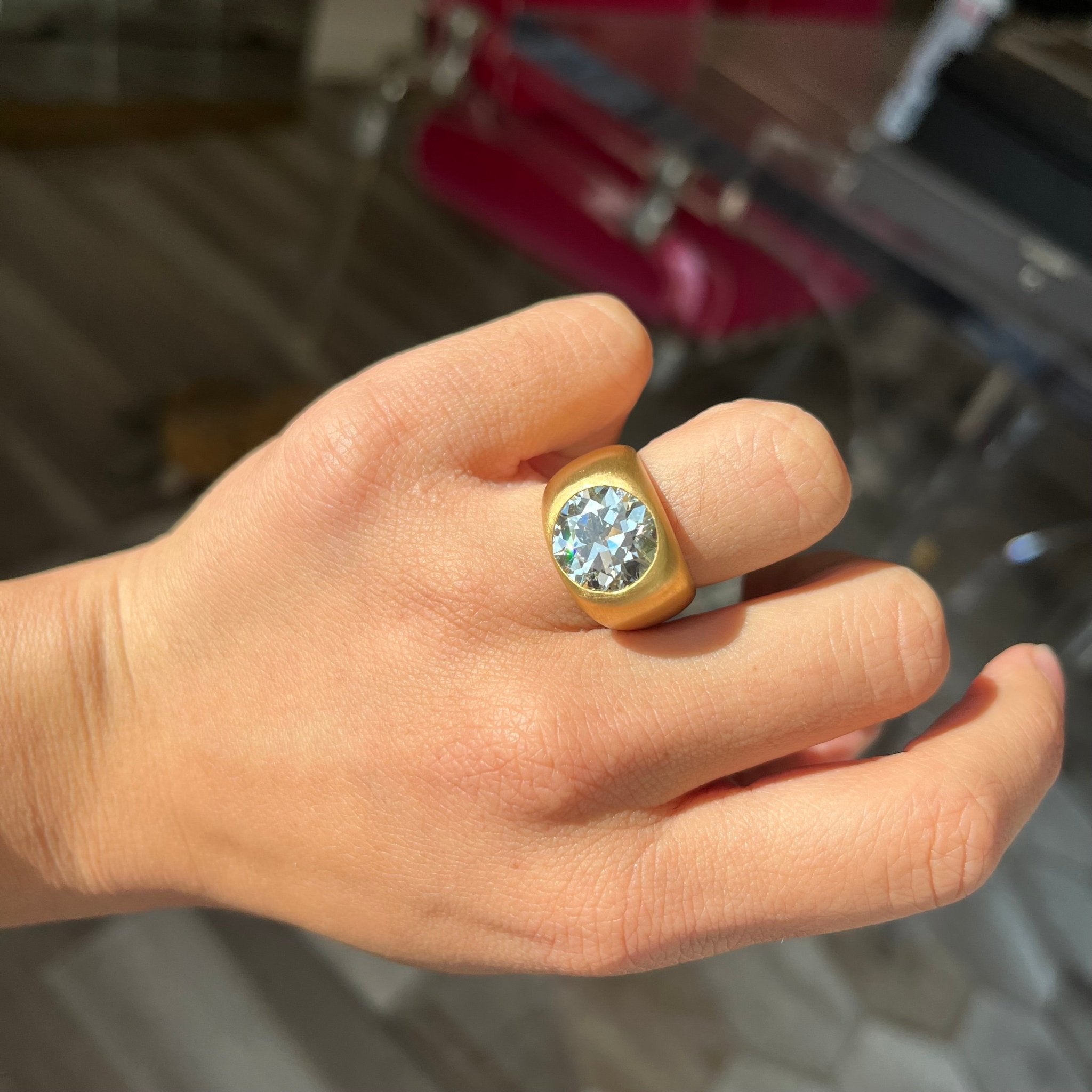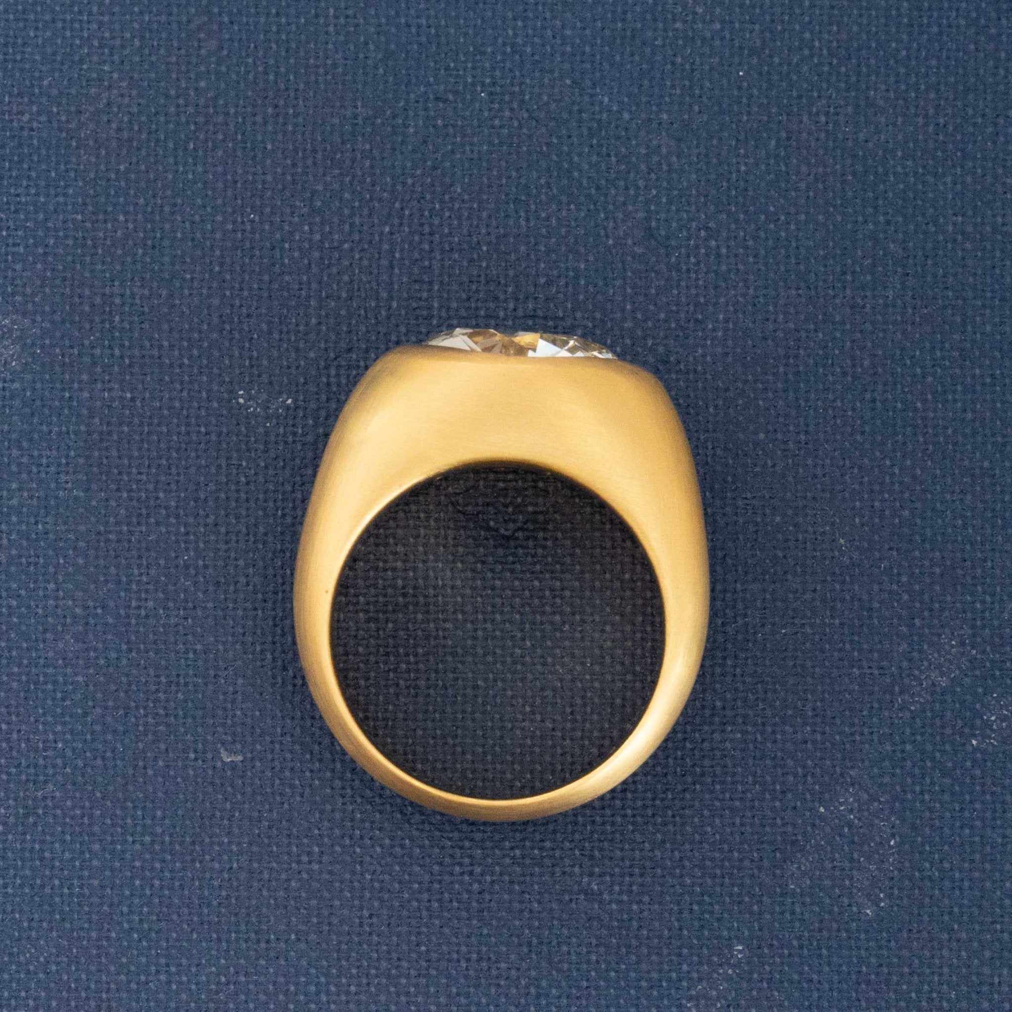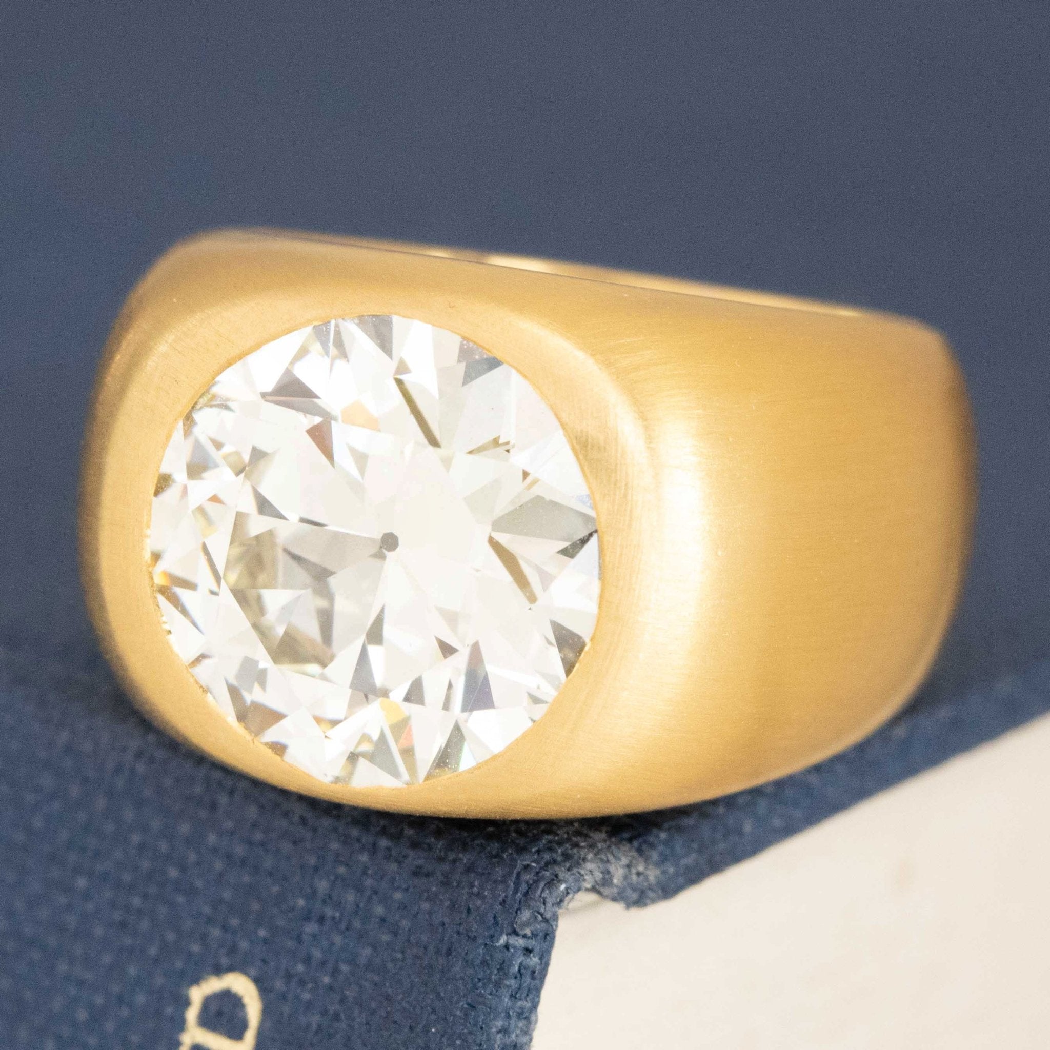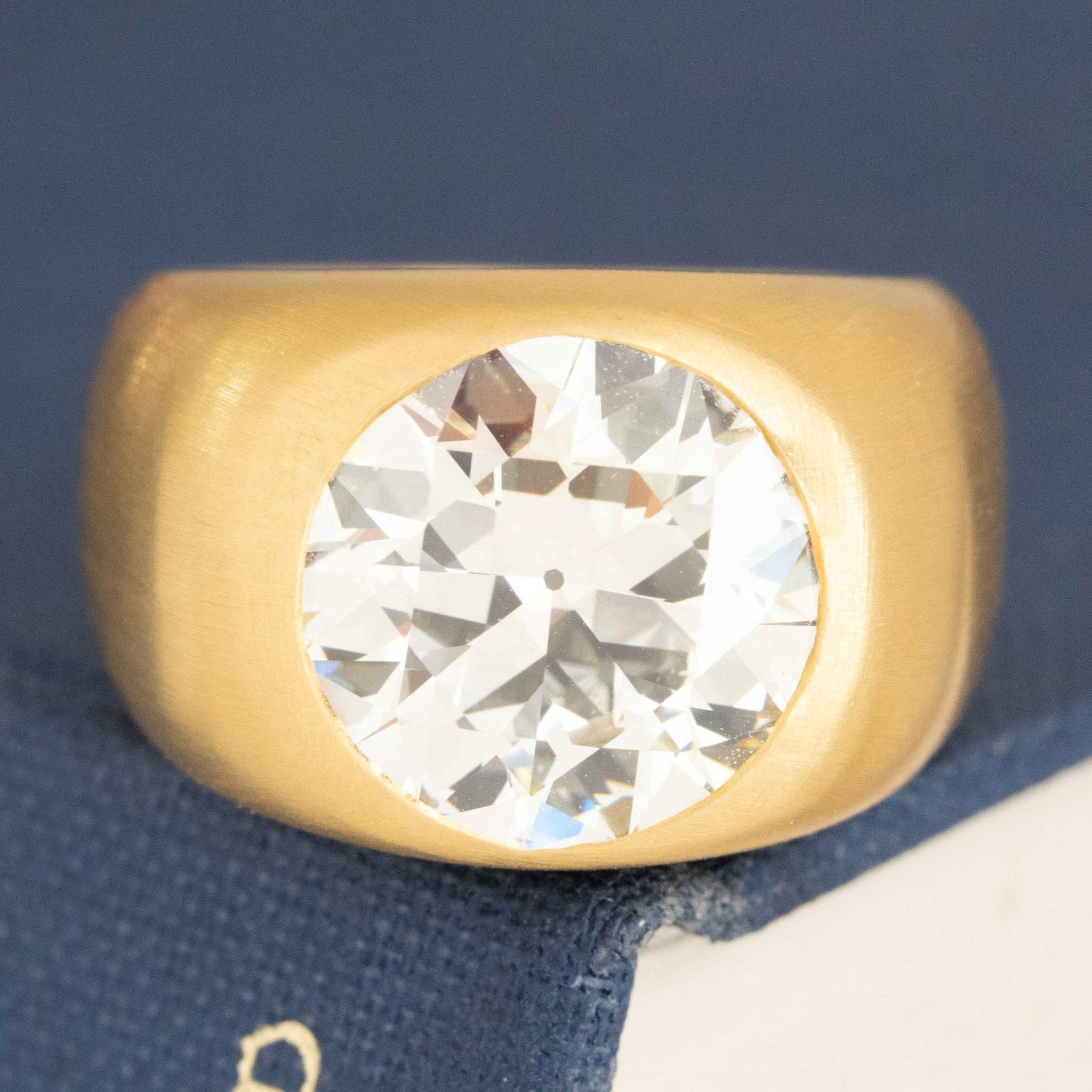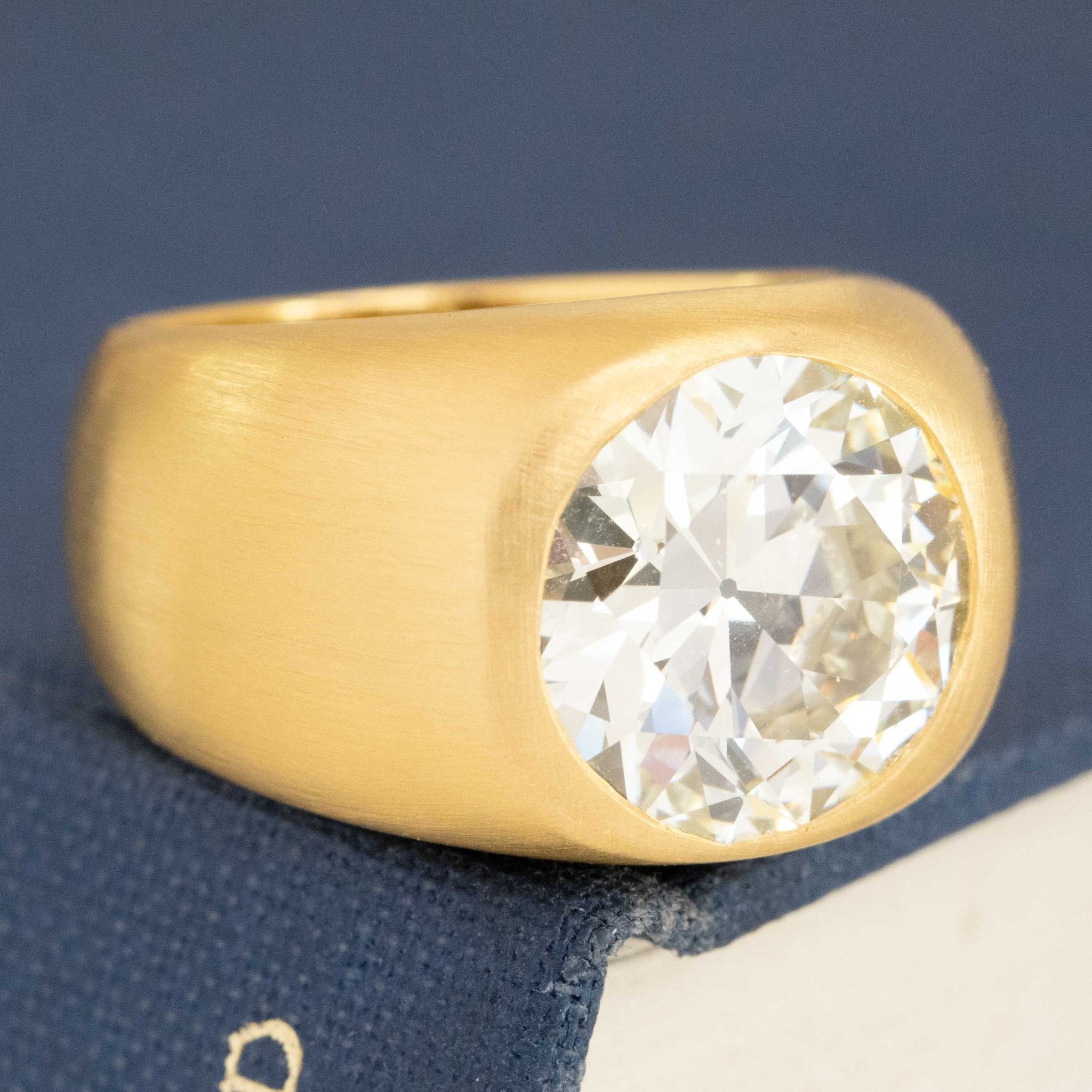 This 5.54ct transitional cut diamond is pure vintage magic, set in a sleek yellow gold chunky bezel setting. It's got that old-school charm with a modern twist! The transitional cut, which was popular in the 1920s and 1930s, bridges the gap between the old mine cut/old European cut and the brilliant cut of today. Think of it as the diamond world’s throwback to a time of flapper dresses and jazz – it’s a little piece of history with a whole lot of wow!