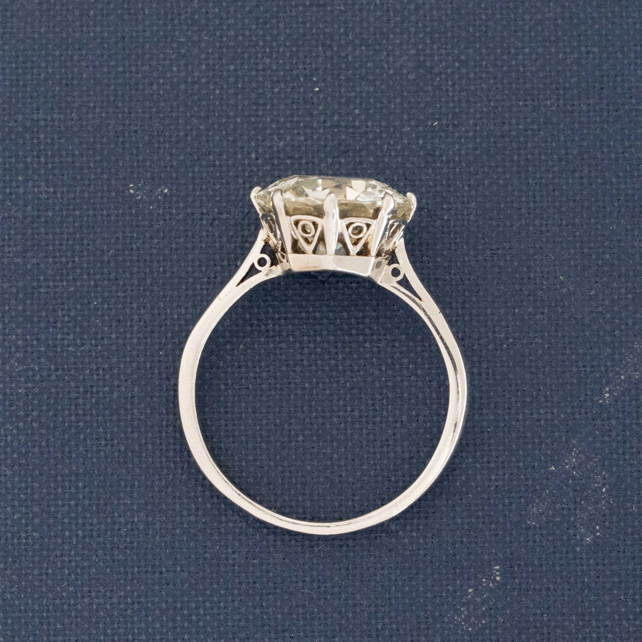 A classic antique solitaire with a gorgeous Old European cut diamond center. It doesn’t get better than this, folks! Although she falls a bit lower on the color scale, we find it to be much more bright and white-facing in person, especially in this sweet platinum crown-motif setting. The shank is simple and elegant, and that basket/gallery is just to die for. A beautiful ring, perfect for those looking for big size and impeccable antique charm.