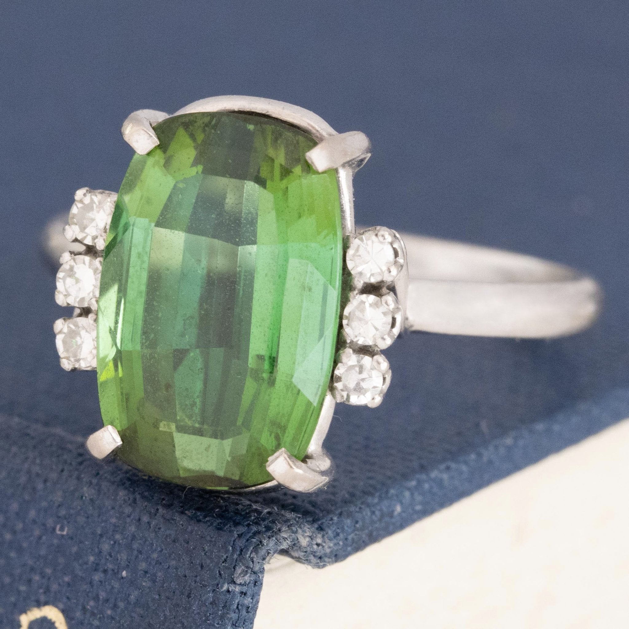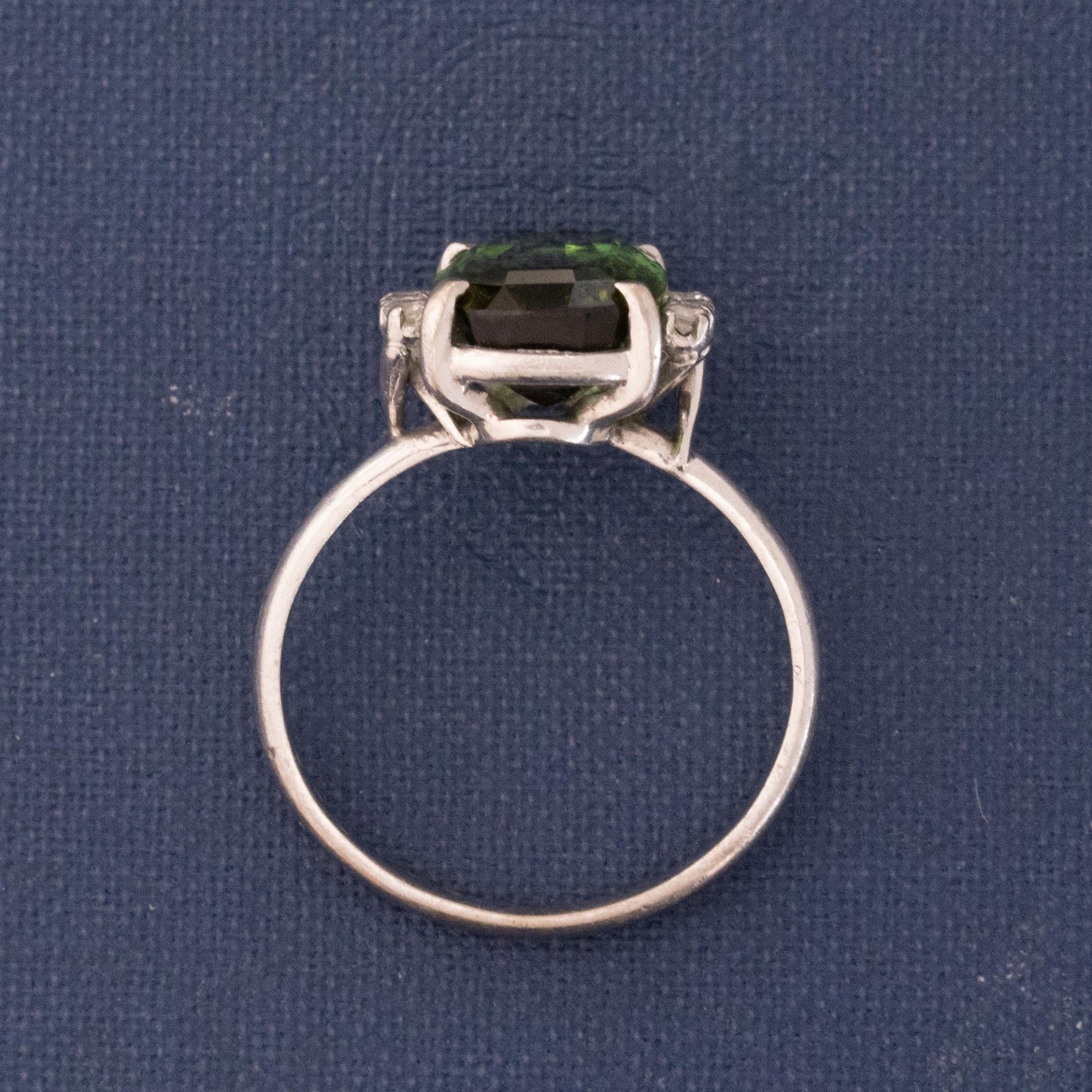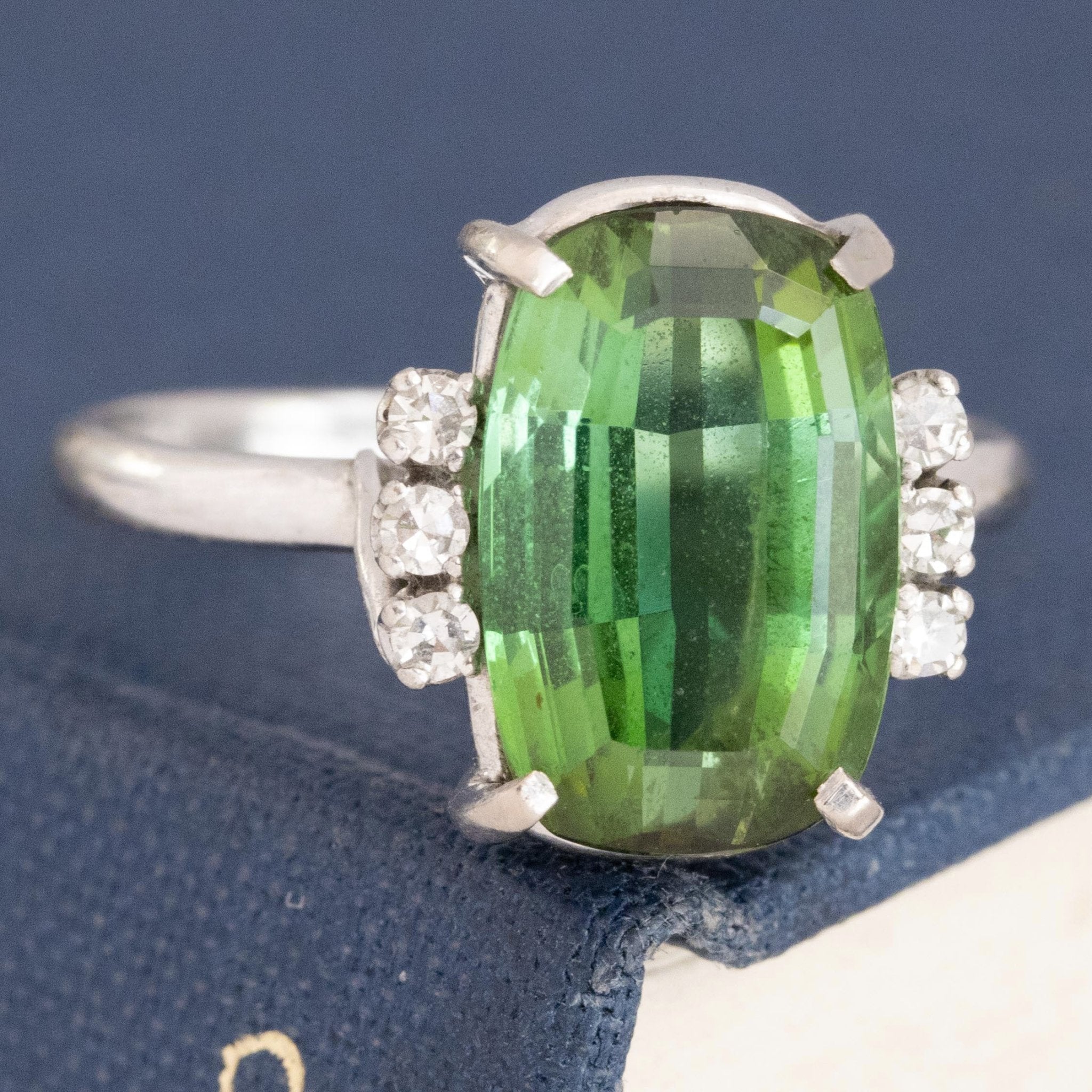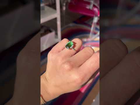We rarely see tourmaline stones in this vibrant color, and this one has an incredible variation in its’ green tones. In the light, the diamond accents add extra sparkle to the otherwise juicy center stone, and the ring sits beautifully on the hands. Pretty special, this one.