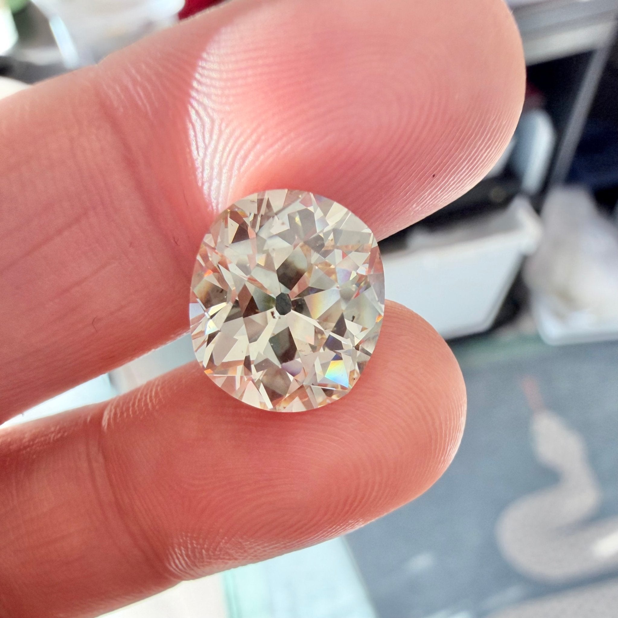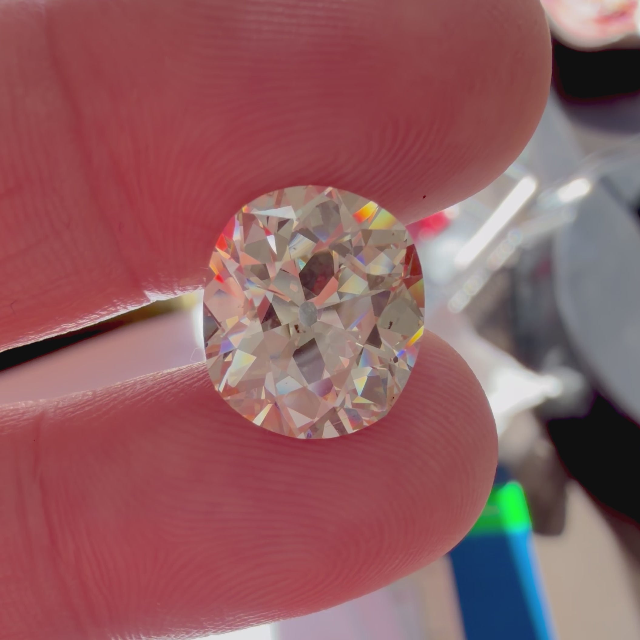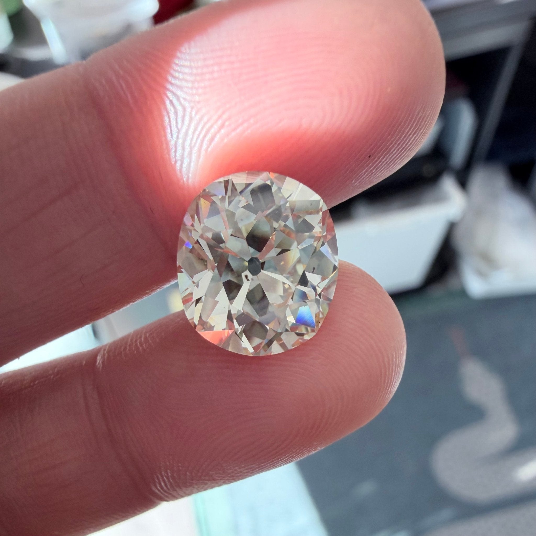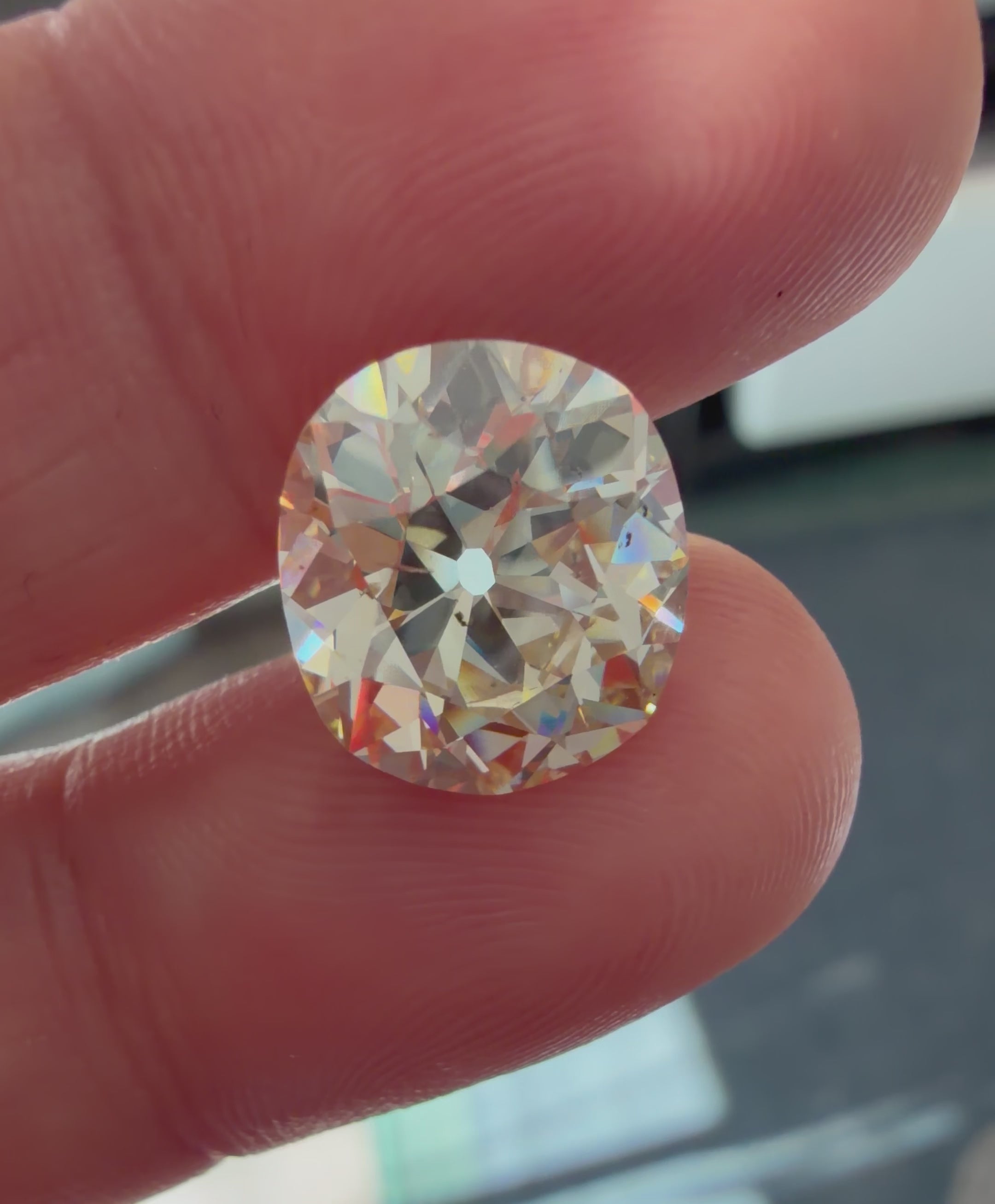 She is chunky, large, and very much in charge - what else can we say? Not an easy diamond to find these days - an authentic antique old mine cut which has retained all its personality and rustic charm. The diamond is very fiery - picking up colors from all around. She faces up a soft ivory in most lighting conditions yet white in others! A very special diamond indeed.