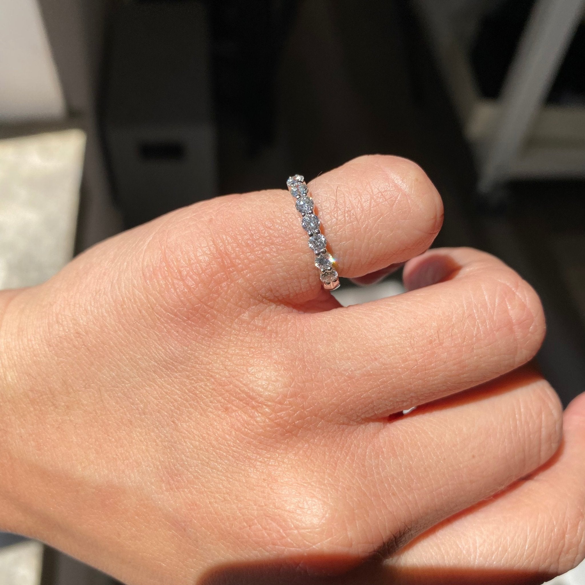 Anybody looking for a diamond-studded pinky ring? Or perhaps struggling with finding something for your small finger? We’ve come across the most perfect one - with seven round brilliant diamonds in a shared prong setting. They span across the top of the finger perfectly, providing a delicate and white sparkle from every angle you look at it.