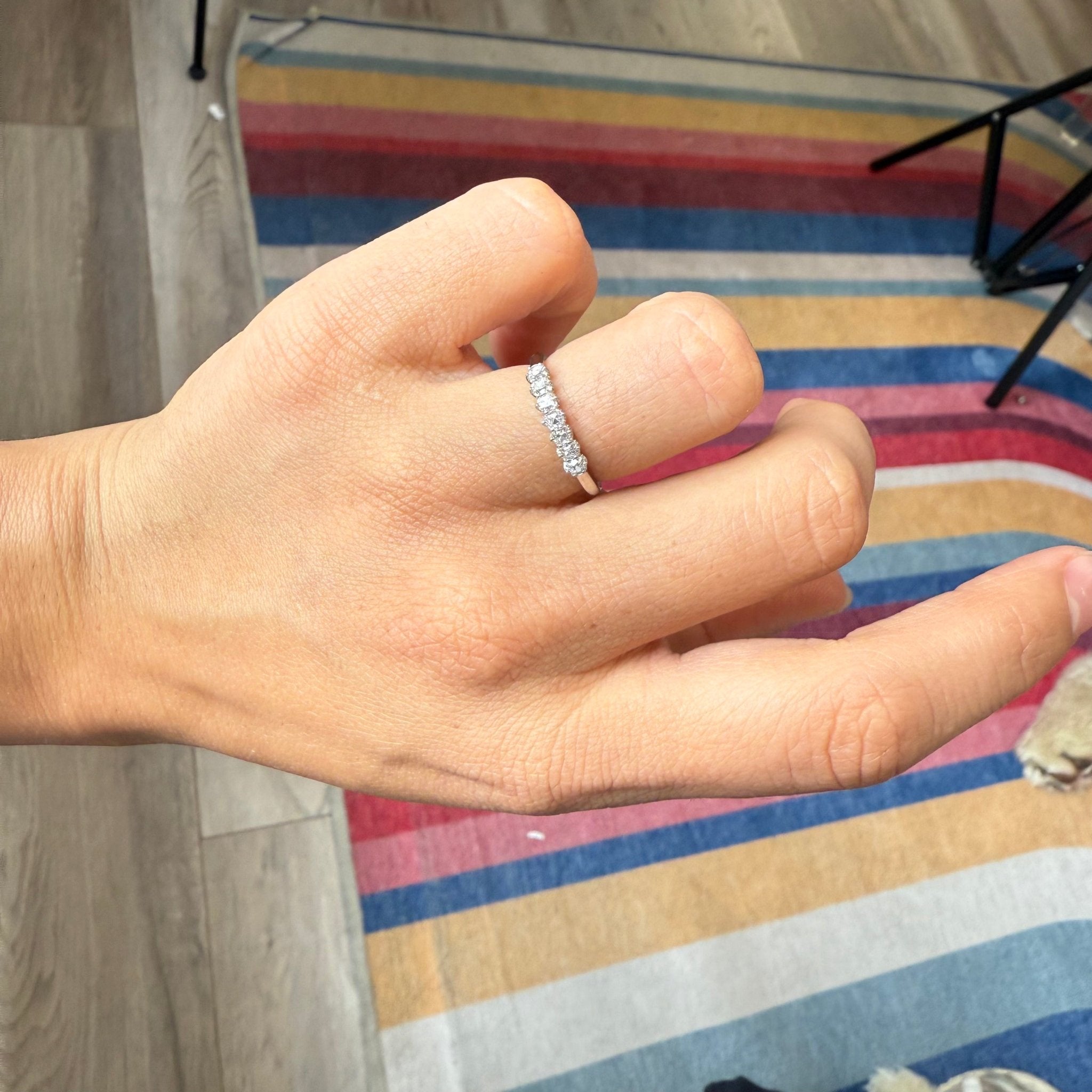 Modeled after antique diamond bands from the Georgian and Victorian eras, this band is set with 7 chunky and charming old mine cut diamonds in platinum! The diamonds are bright and sparkly and just looks so beautiful and elegant on the finger. This is the perfect size for those wanting something smaller and more delicate in scale.