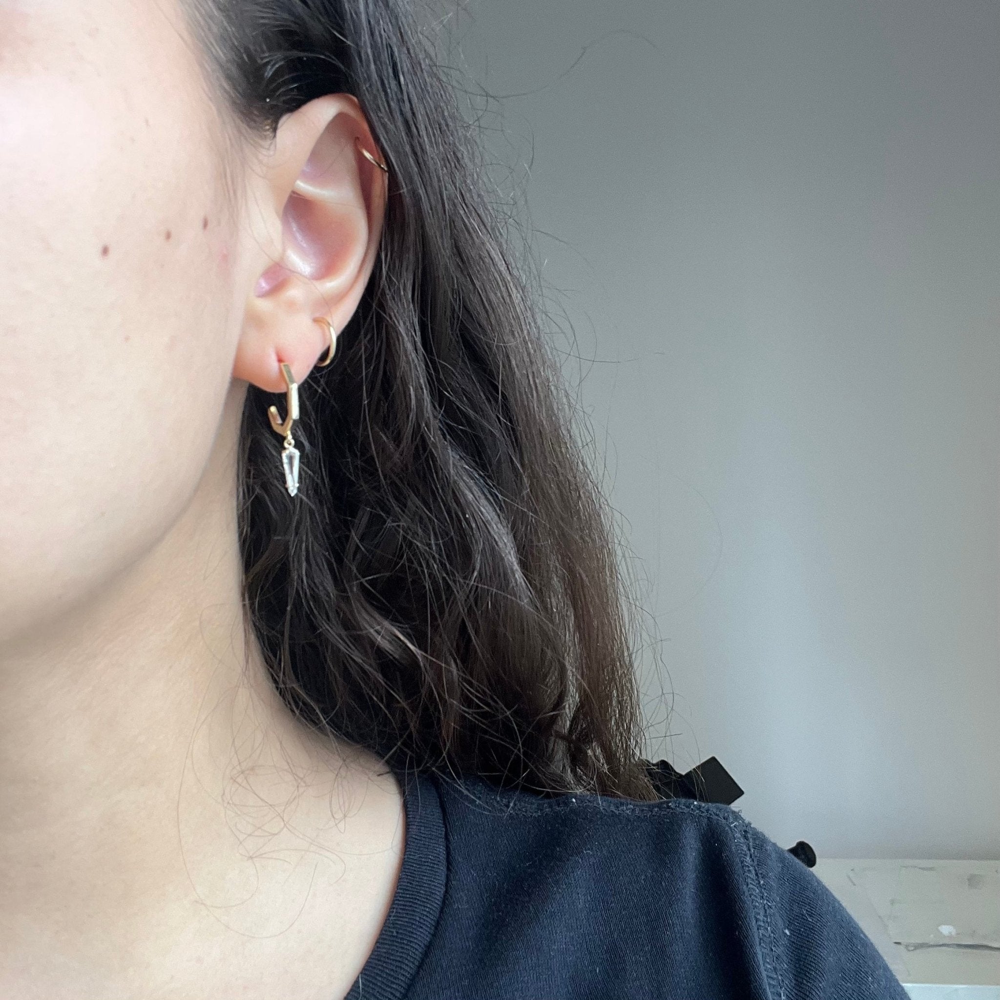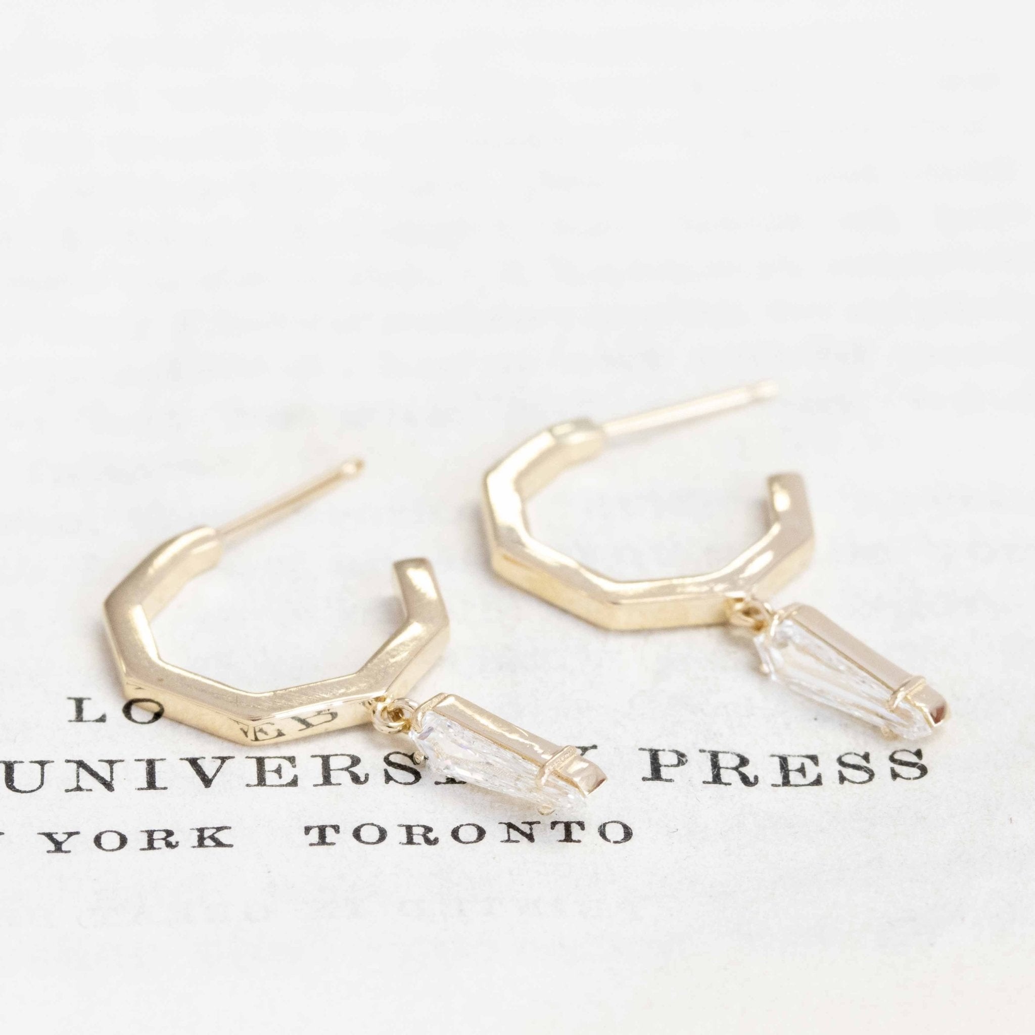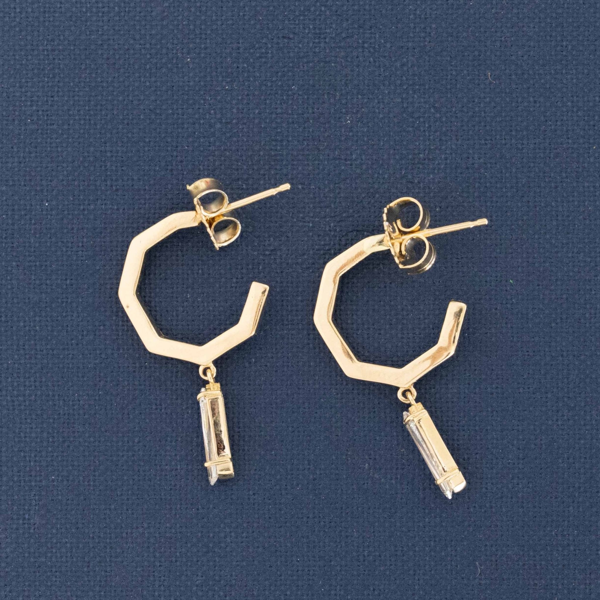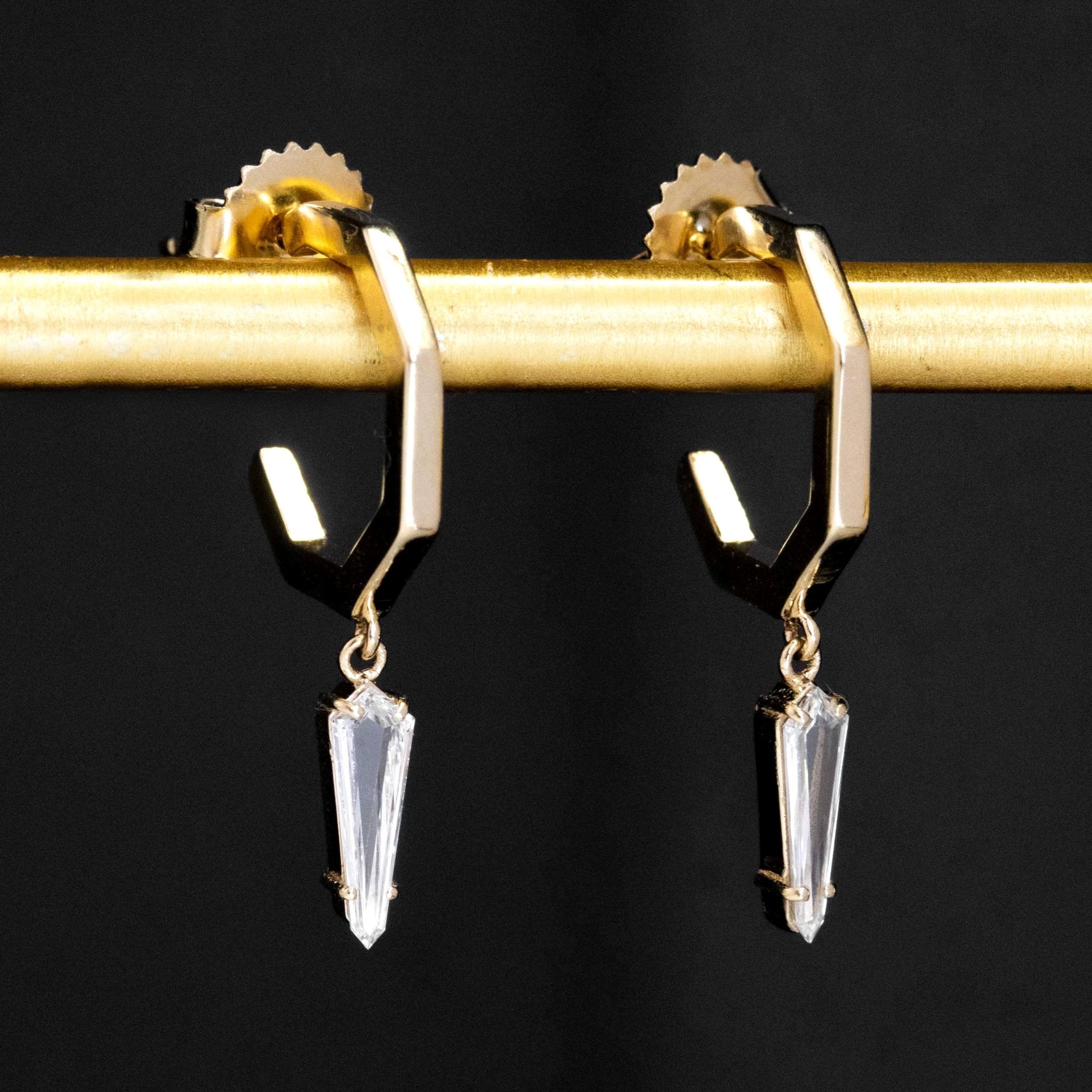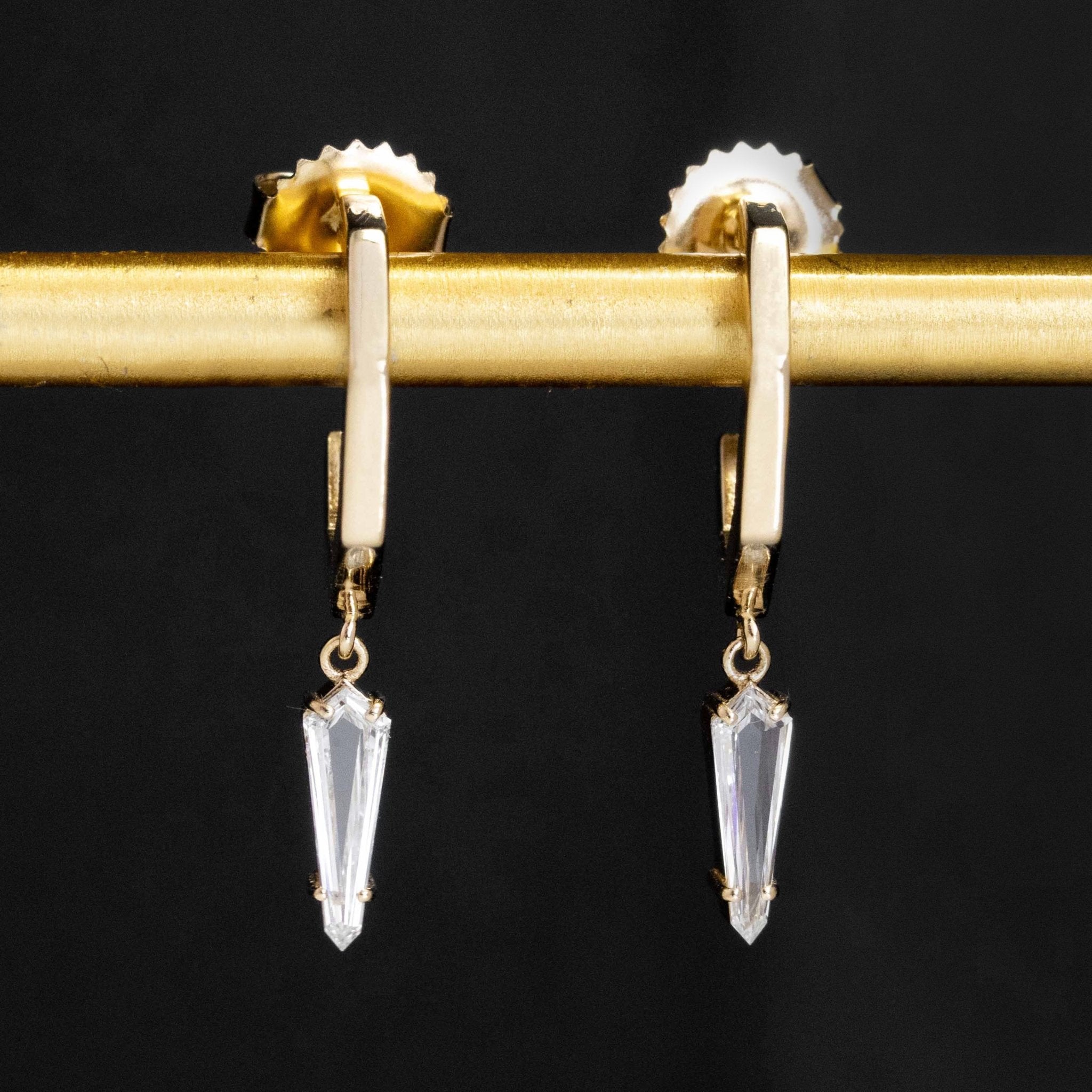 Sexy does not even cover it! We came across this pair of extra long kite shaped diamonds and were BEGGING to be made into some rad earrings. We set in minimal basket settings, with the intention to have the prongs blend and disappear into the diamond, giving off the illusion that they are floating on the lobes. Strung from a slender, geometric half-hoop settings. Minimalism at its finest.