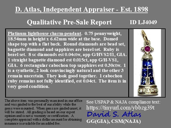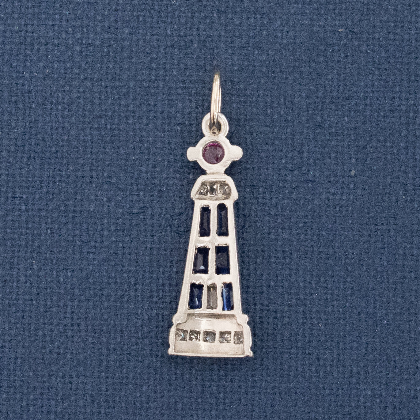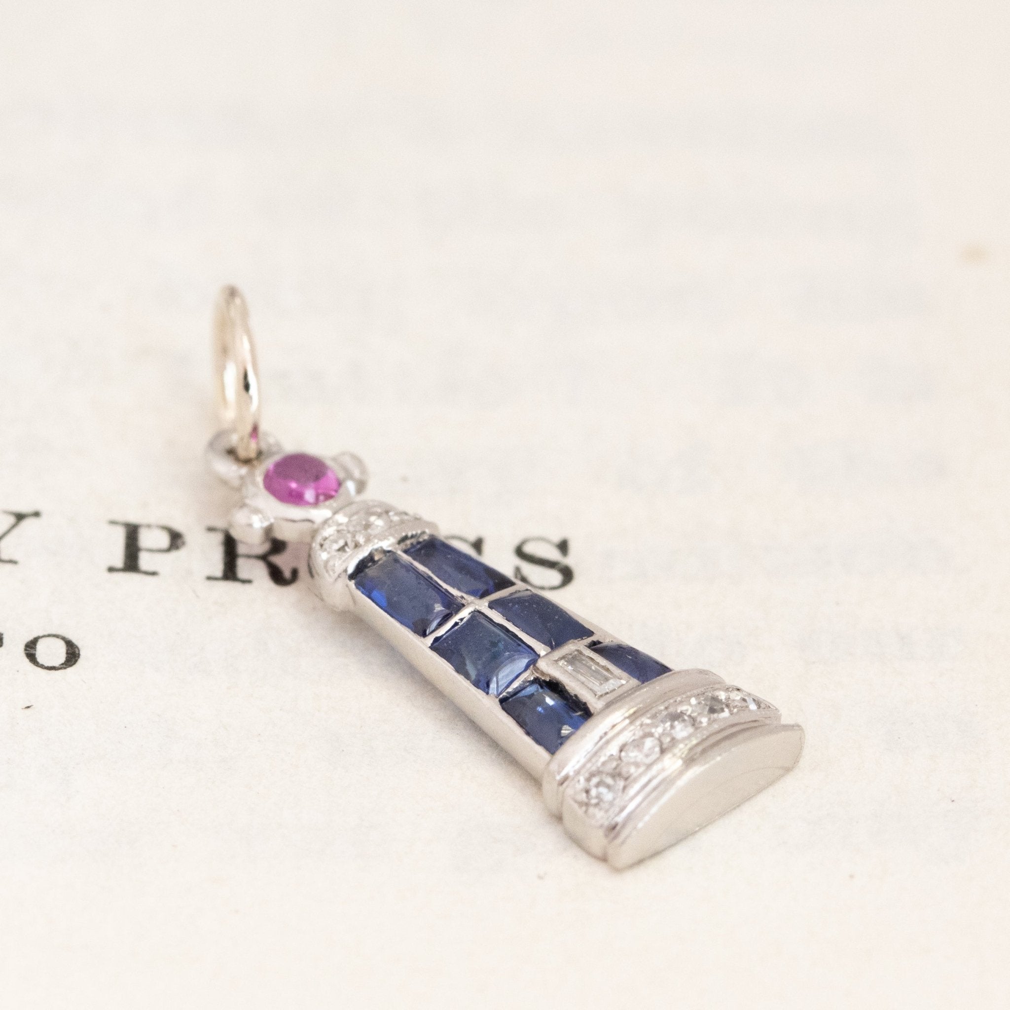 We recently acquired a batch of Deco-era charms that belonged to the same collector with a taste for diamonds, white metal, and yummy gemstone accents. This one is a sapphire-studded lighthouse with such a creative and elegant design, representative of the things which help guide us home.