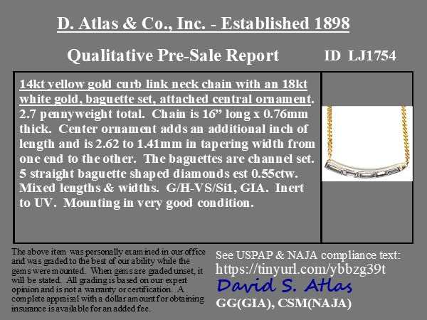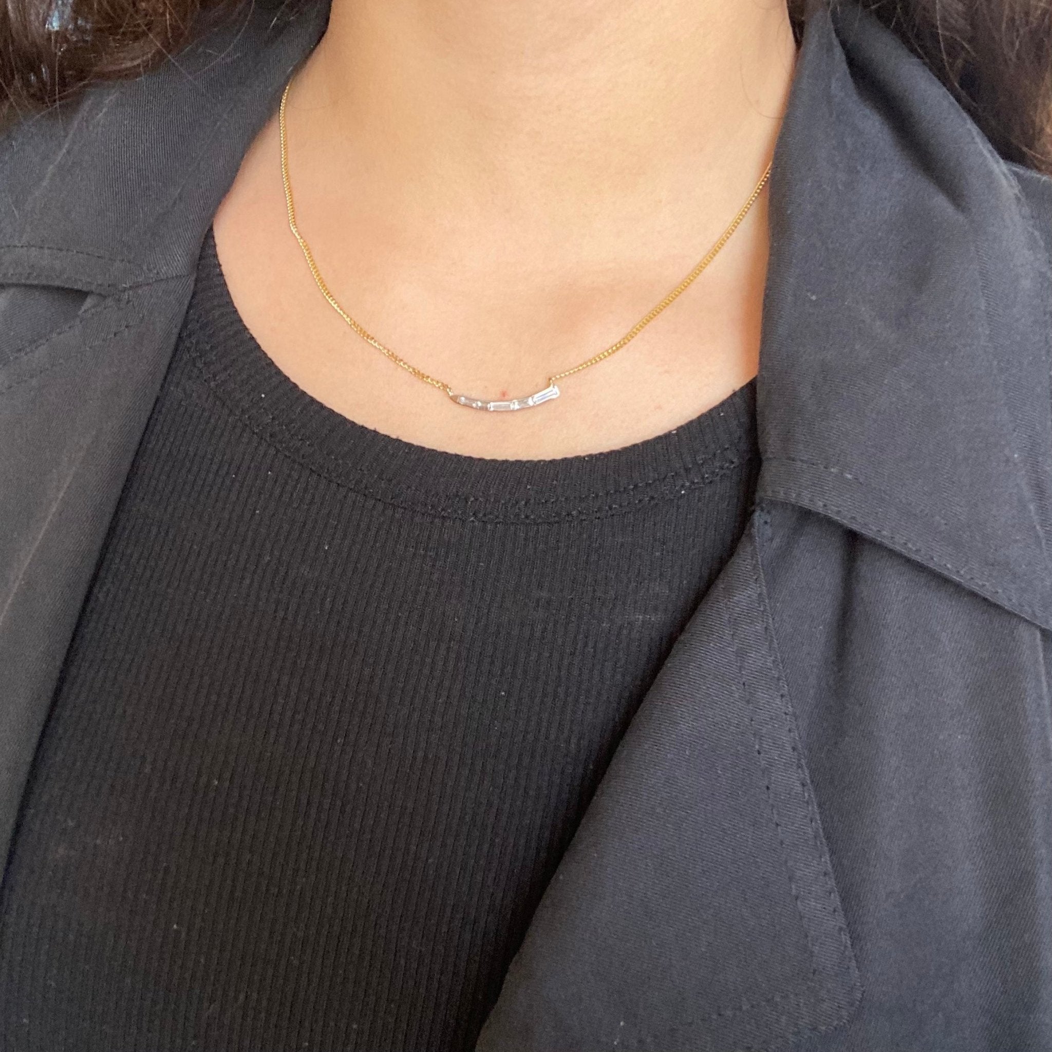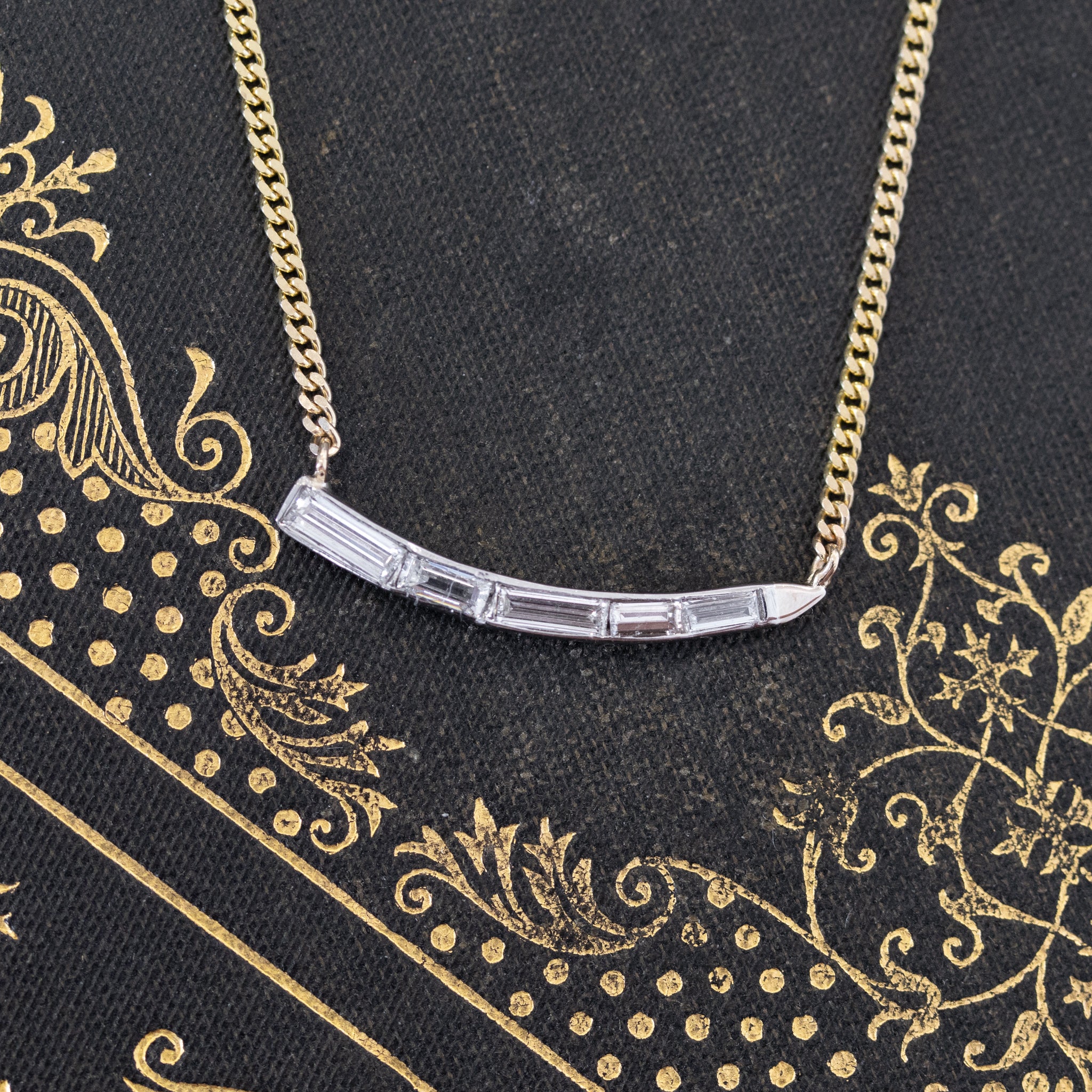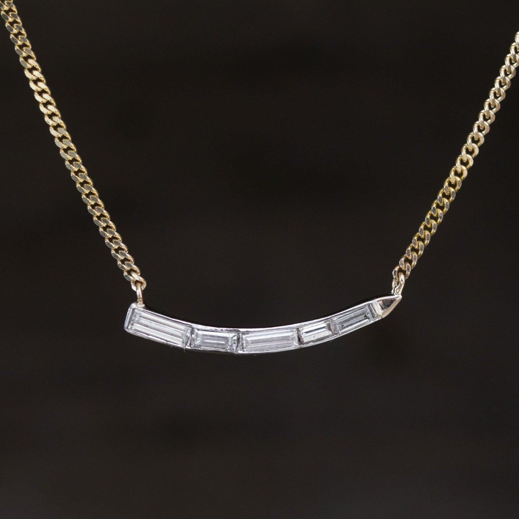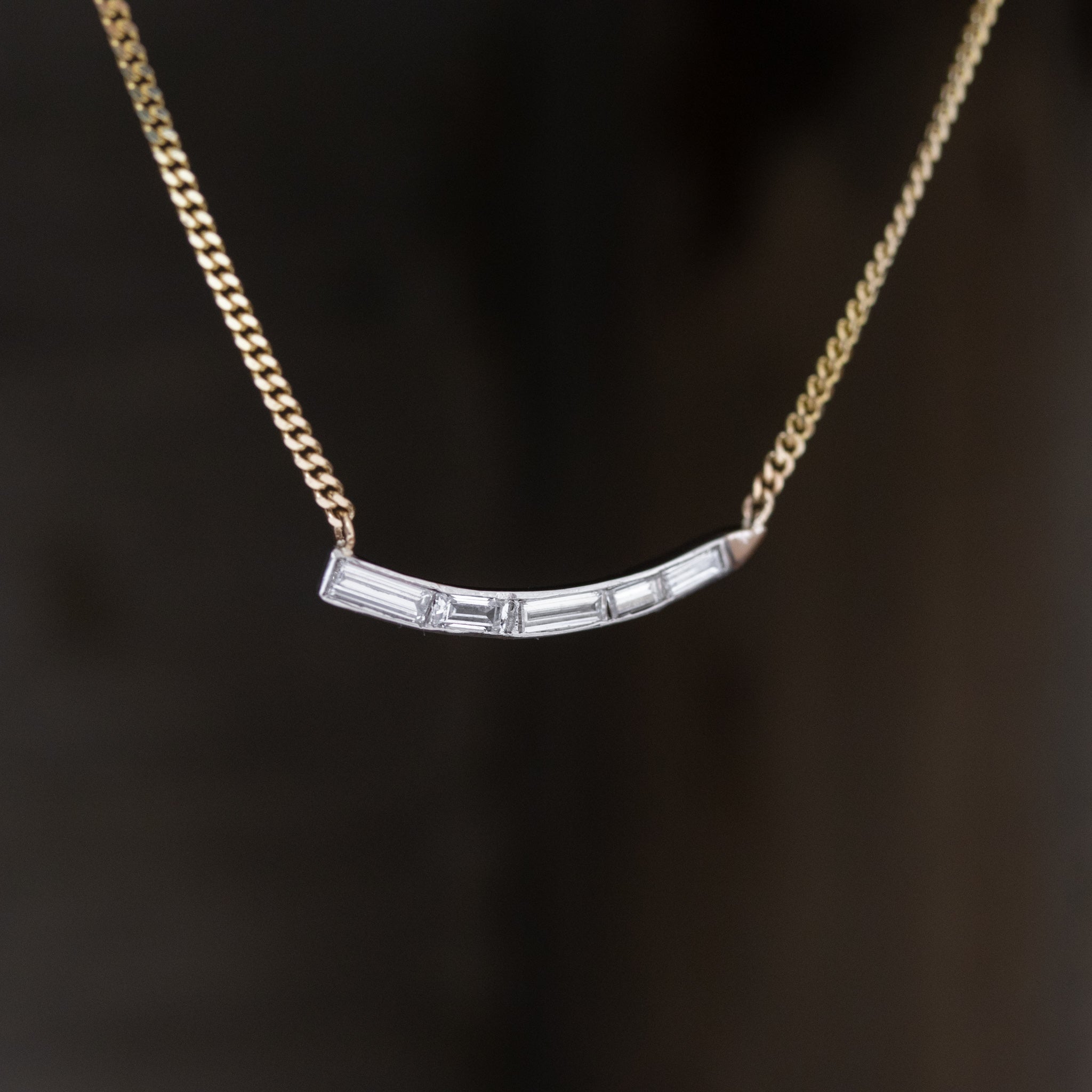 We rescued this wave-motif mid-century piece from the scrap pile after seeing so much potential in the piece. Strung on a yellow gold chain, the diamond component lays elegantly low and flush on the chest, the baguettes shimmering softly in its original white gold setting. Perfect worn on its own, or layered with other pieces.