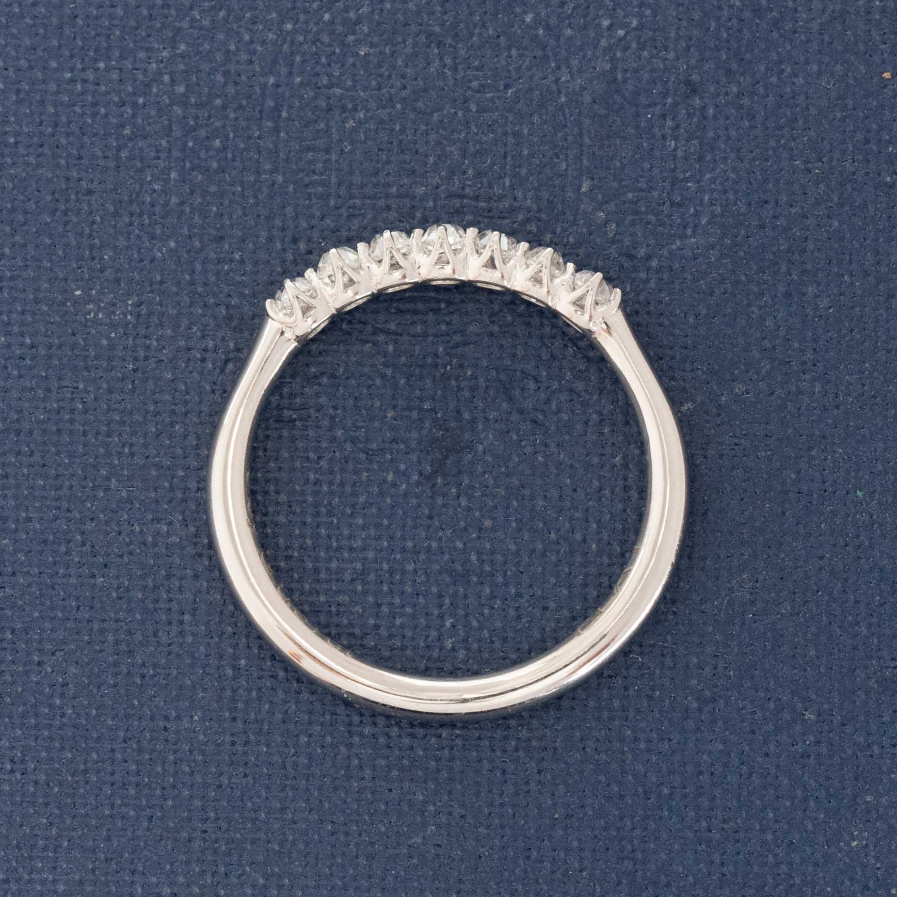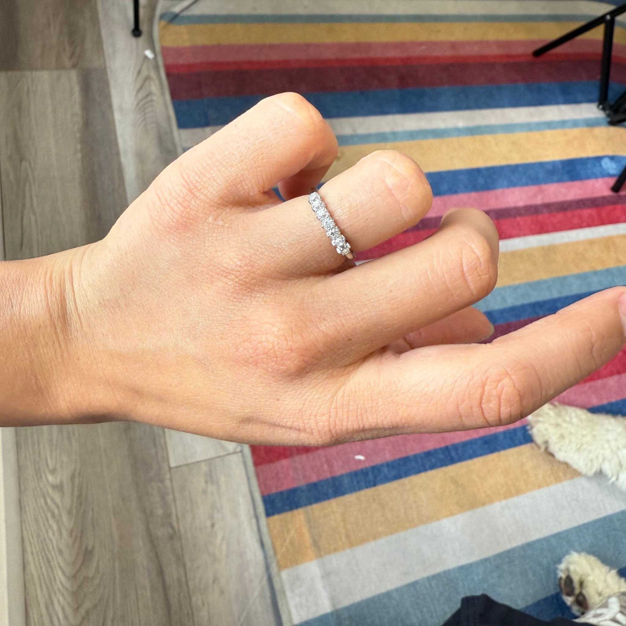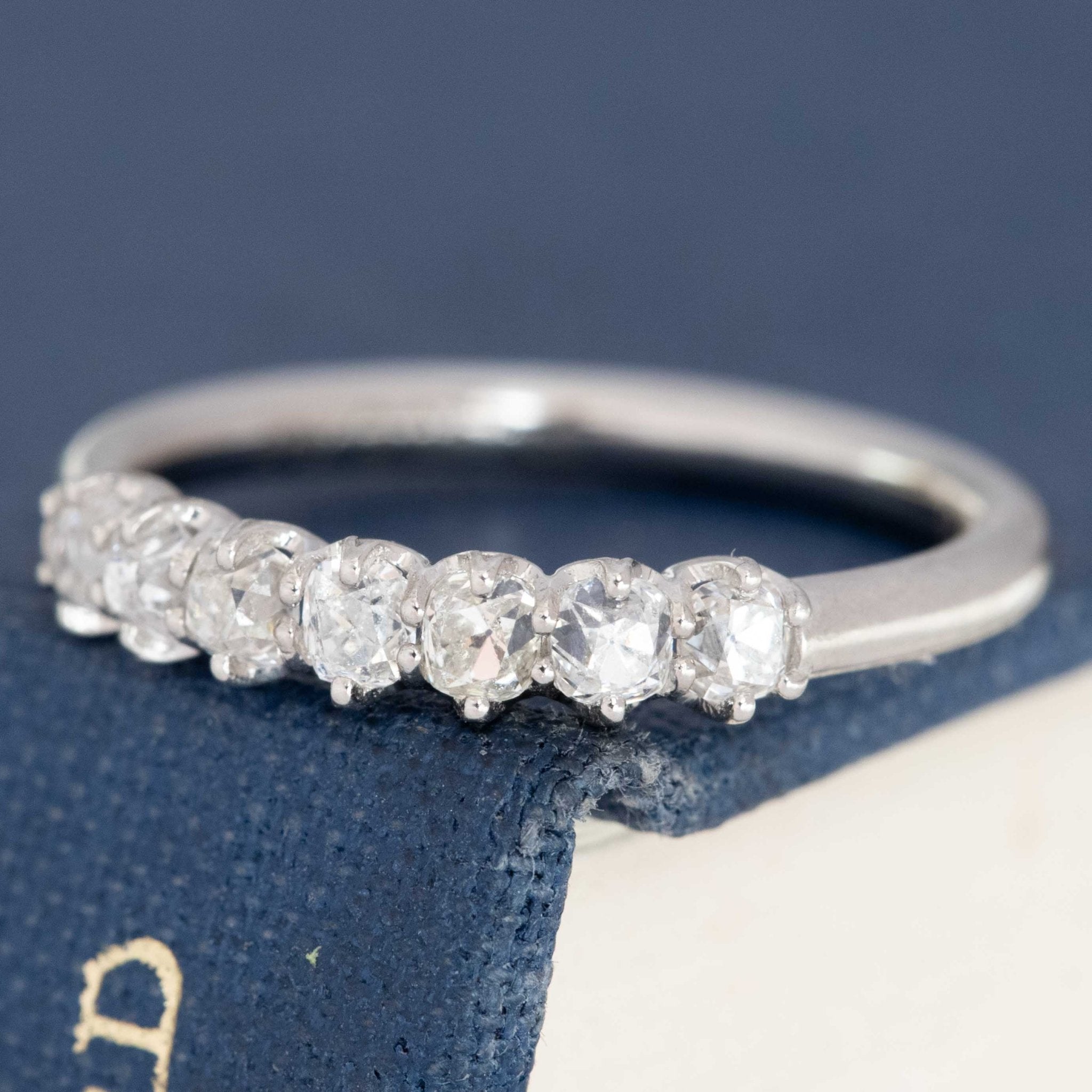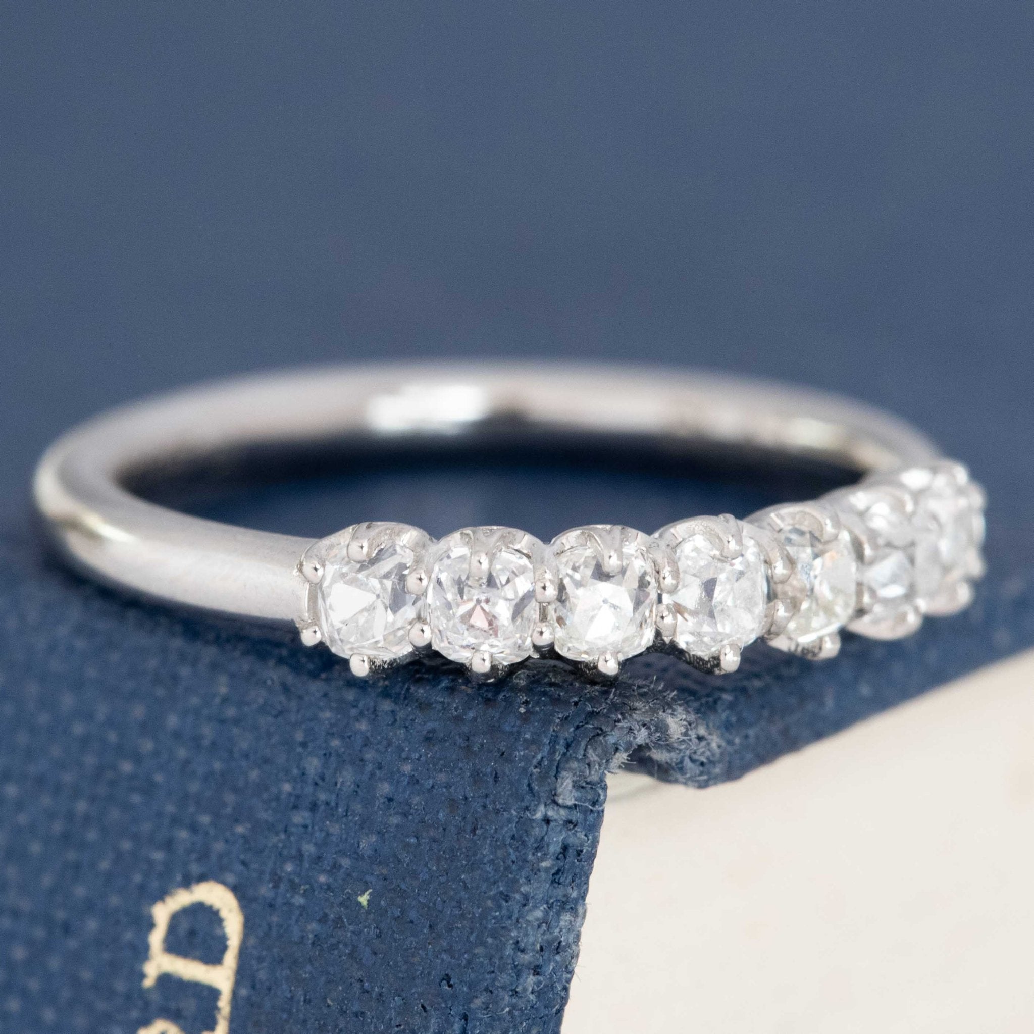 Modeled after antique diamond bands from the Georgian and Victorian eras, this 6-stone band is set with 7 chunky and charming old mine cut diamonds in platinum! The diamonds are bright and sparkly and just looks so beautiful and elegant on the finger. This is the perfect size for those wanting something smaller and more delicate in scale.