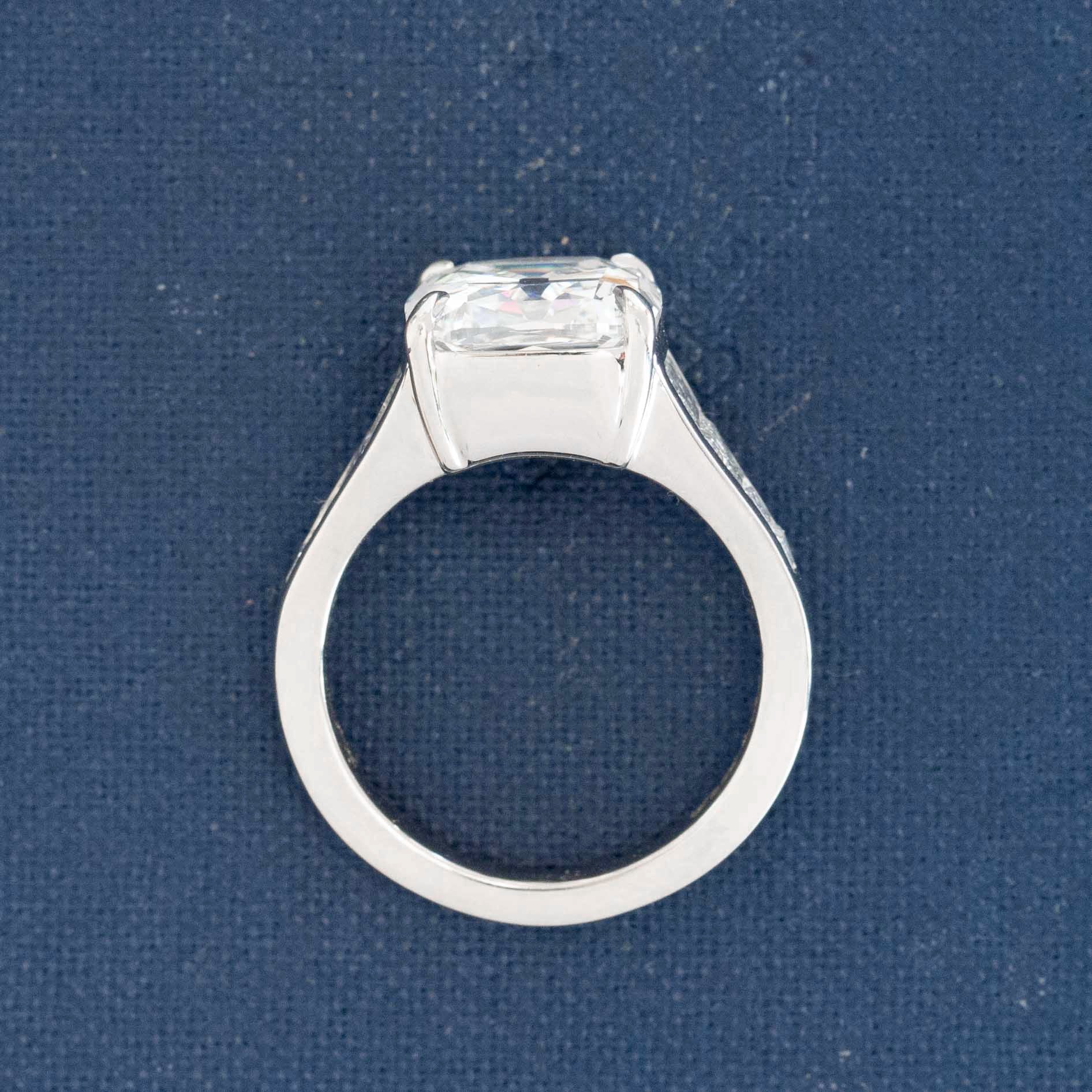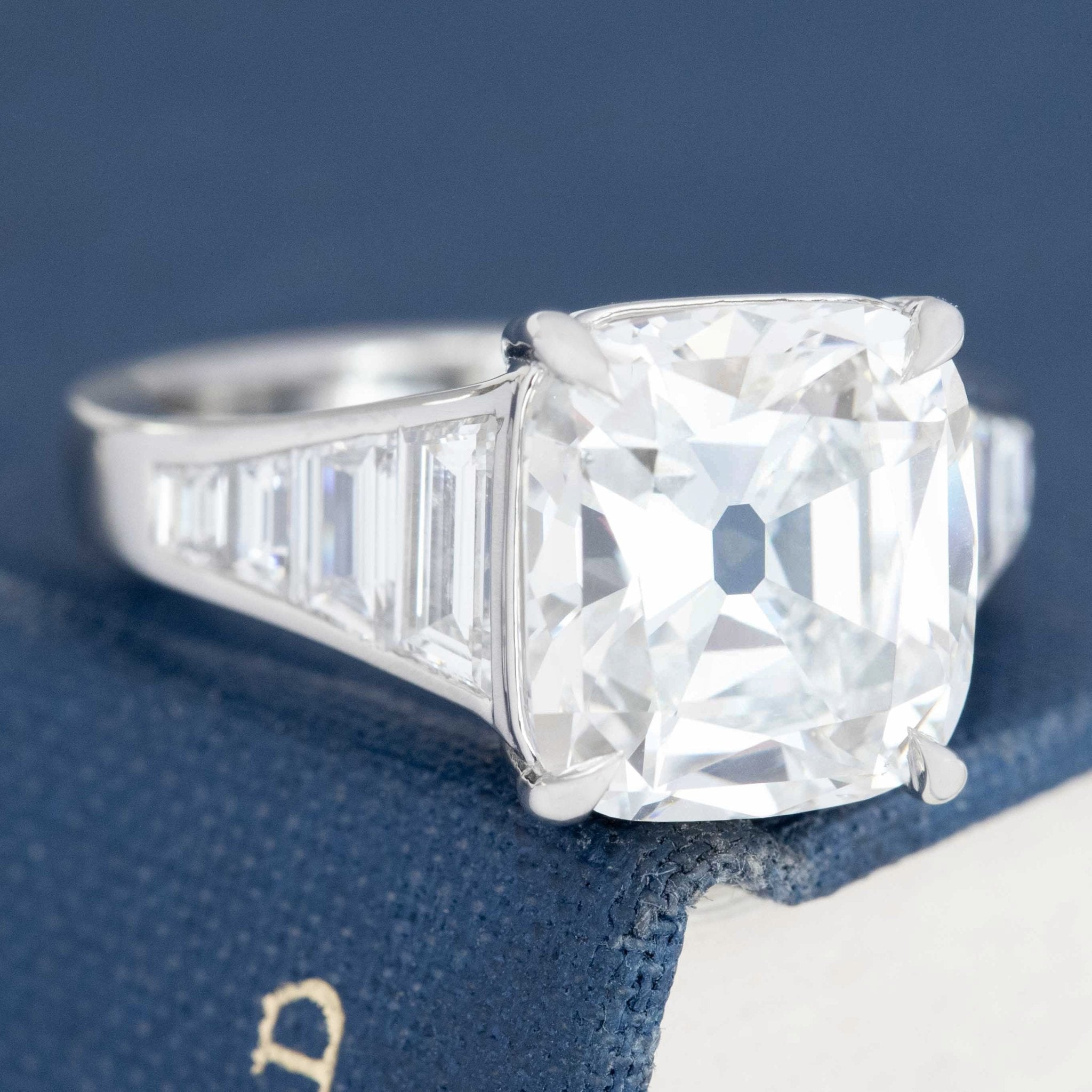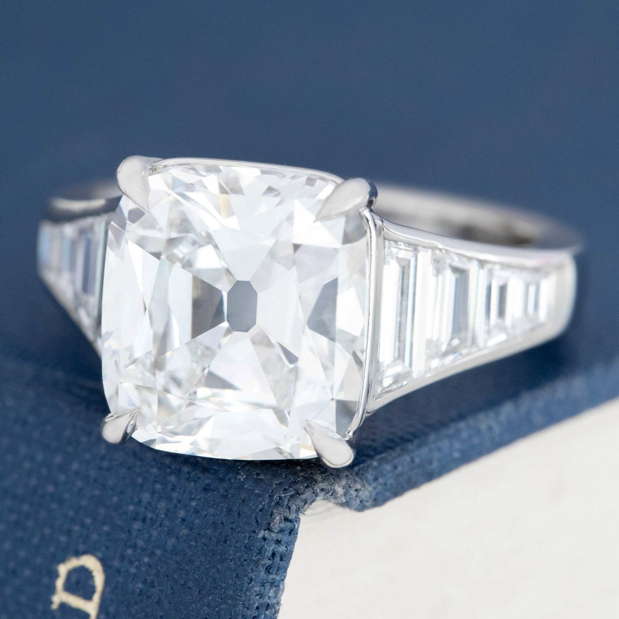 STUNNING does not even come remotely close to this one-of-a-kind ring! Set with a killer 5.02ct old mine cushion center with a rare high H color, full of life with its broad facets and chunky make. Set in timeless platinum with a surround of custom cut calibrated baguettes which taper down gracefully as it goes down the finger. Low profile on the finger, all you literally see is a sea of bright, white diamonds. Simply spectacular!