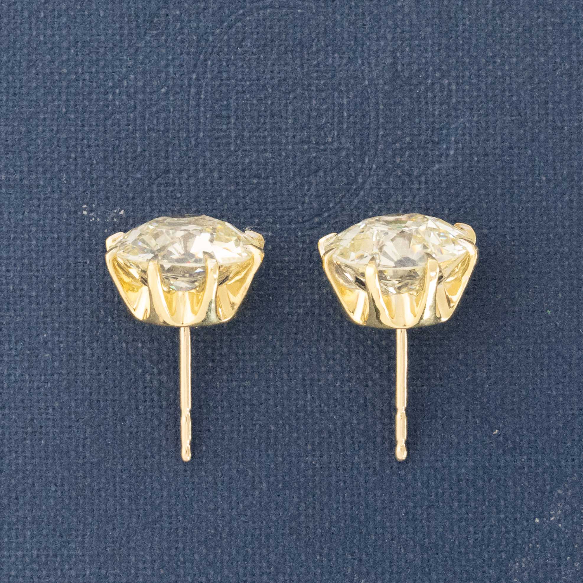 HTalk about headlights for the lobes! VERY present pair of old European cut diamonds, set in simple 8-prong settings for a vibe that is both elegant and timeless. The studs sit nice and low on the lobes (at least, as low as 3ct diamonds can!), framing one's face beautifully. The diamonds have the softest warmth to them, yet both very lively and bright - they catch the light so beautifully!