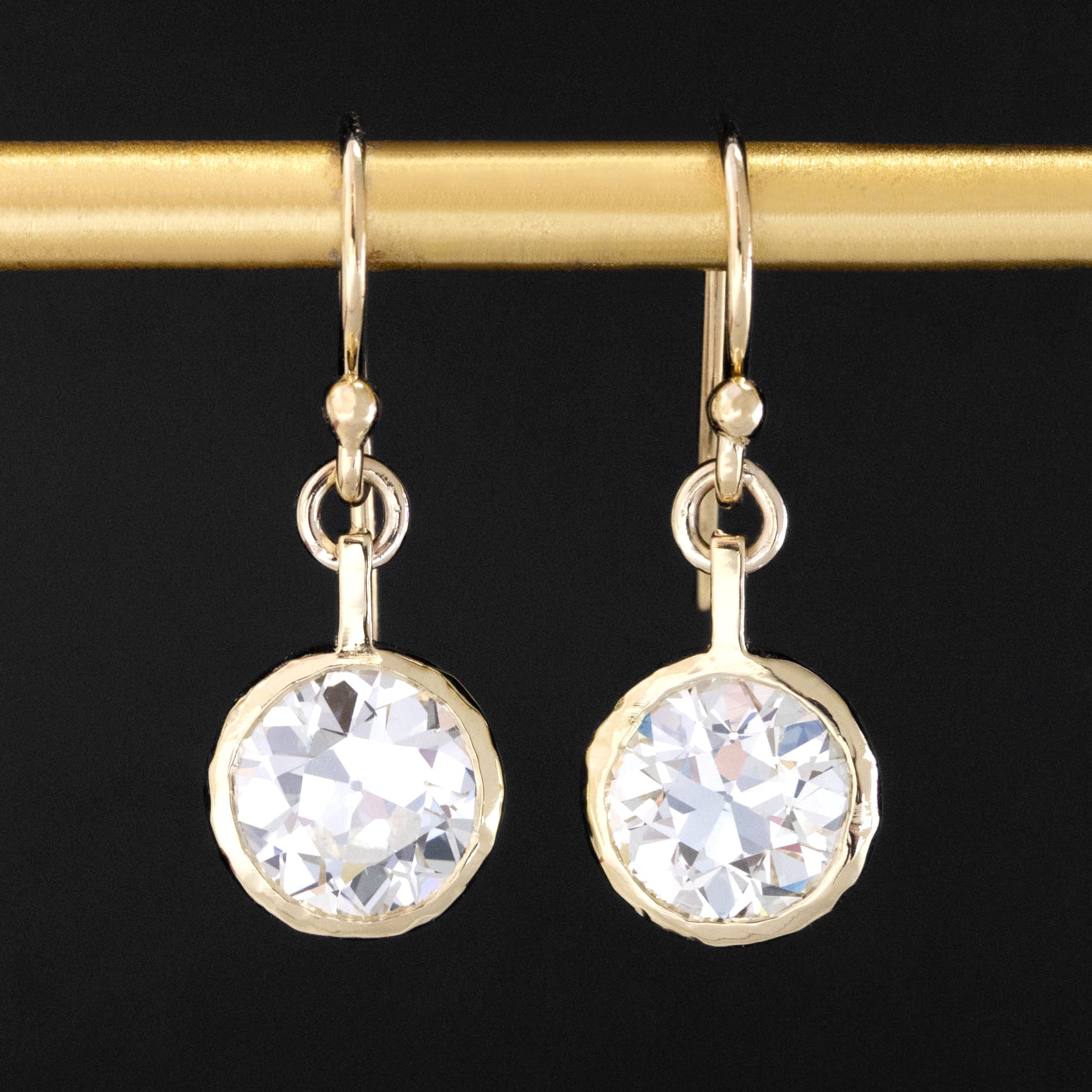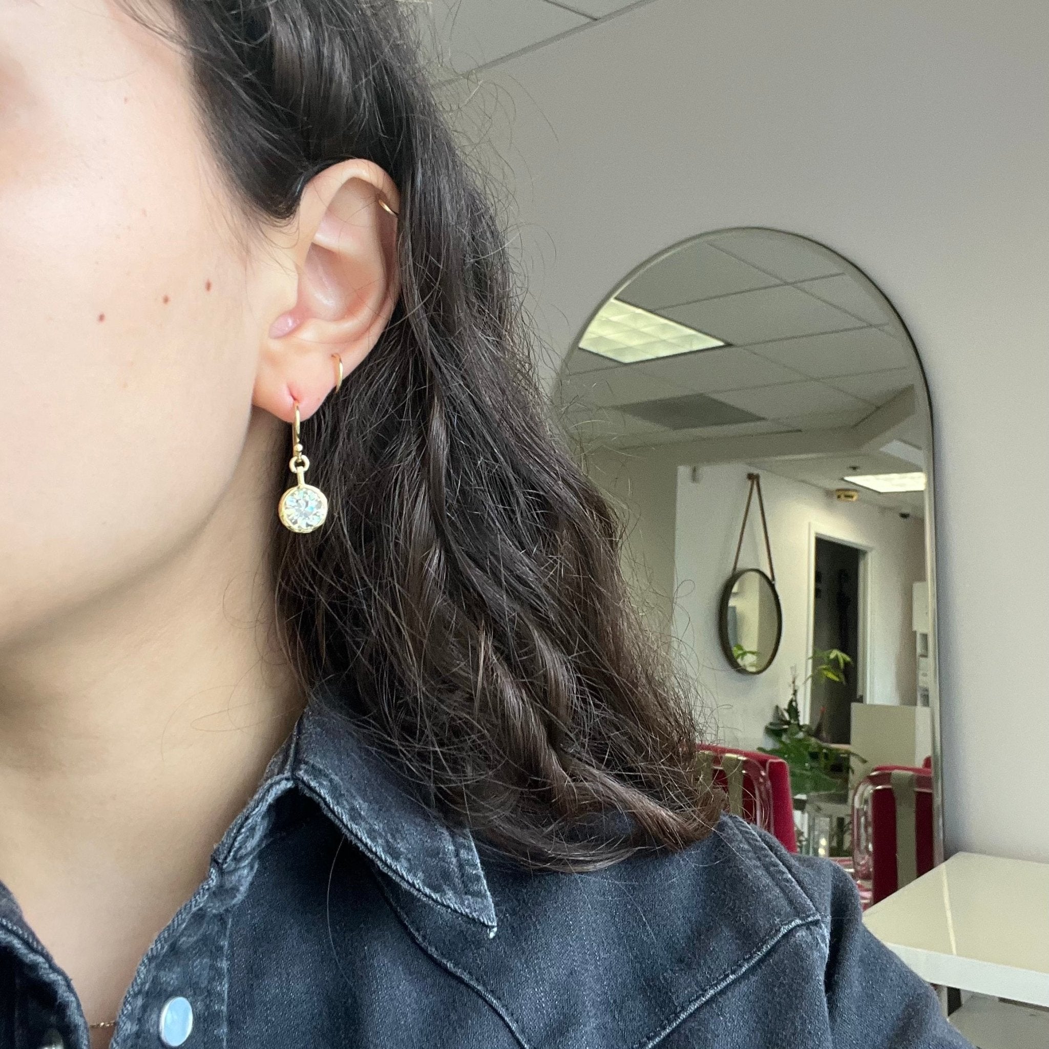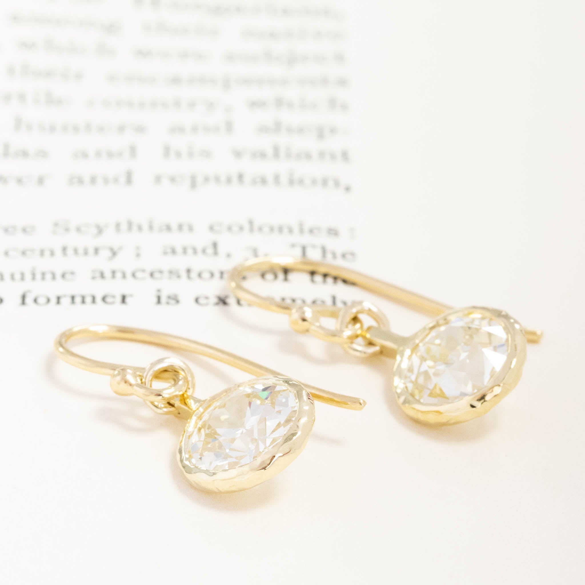 The best mix of old and new, if you ask me! The old European cut diamonds are your "classic" flavor OEC - chunky facets, prismatic and super lively- truly like little sparklers on the ears. Set in sleek and simple bezel on the more rustic design, giving them a charming artisanal vibe. I designed the drops to be slightly lower on the lobes as well - a little flirty without losing the elegance of the pair. I adore how the diamonds catch light and colors with every movement!