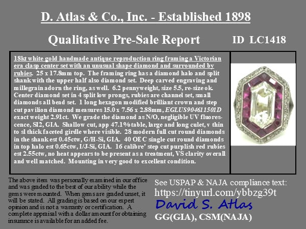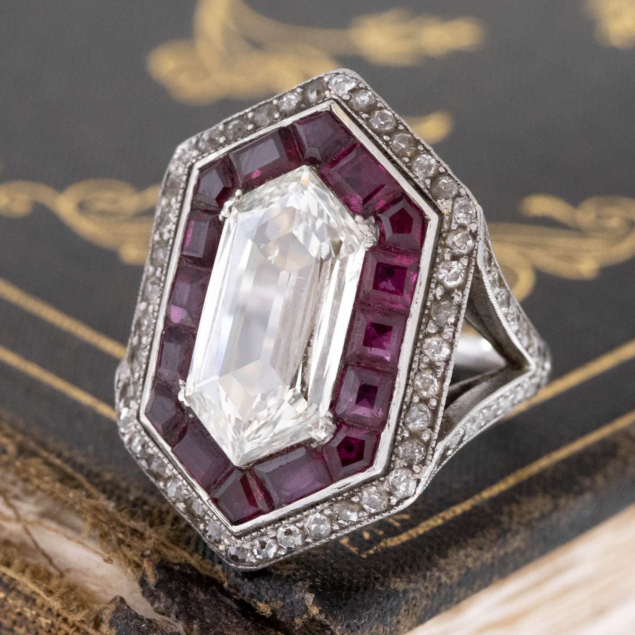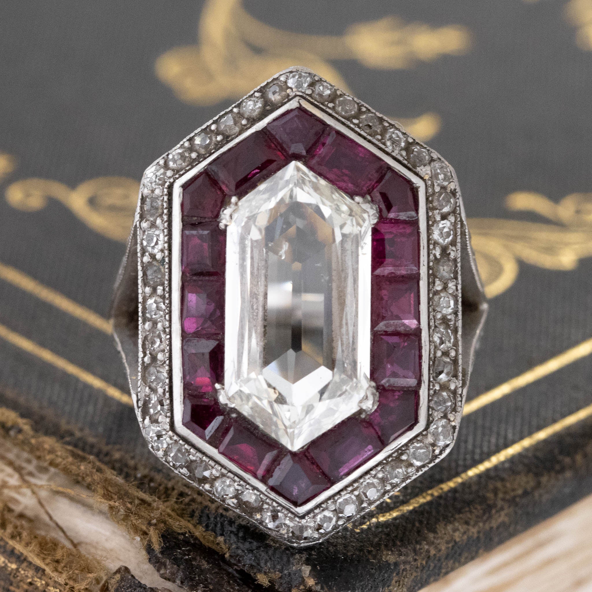 Truly an incredible piece of jewelry! The central hexagon cut diamond is a work of art in itself, with a generous face up and portrait cut diamond characteristics. In a surround of deep red natural rubies, the diamond literally just shines! Believed to have been a clasp in what must have been an impressive Victorian jewel a diamond surround was later added , including the pave-diamond studded shank. Stunning on the finger!