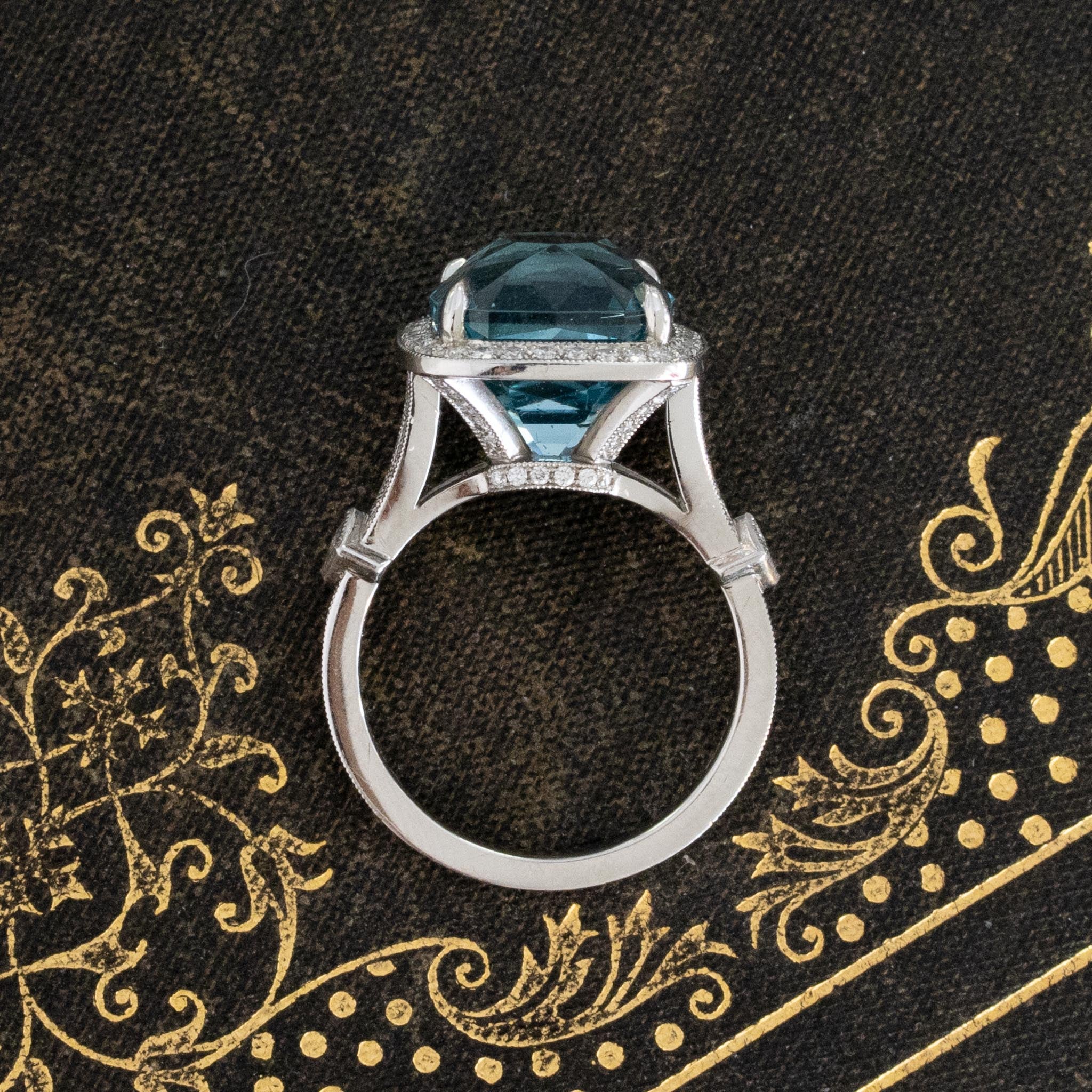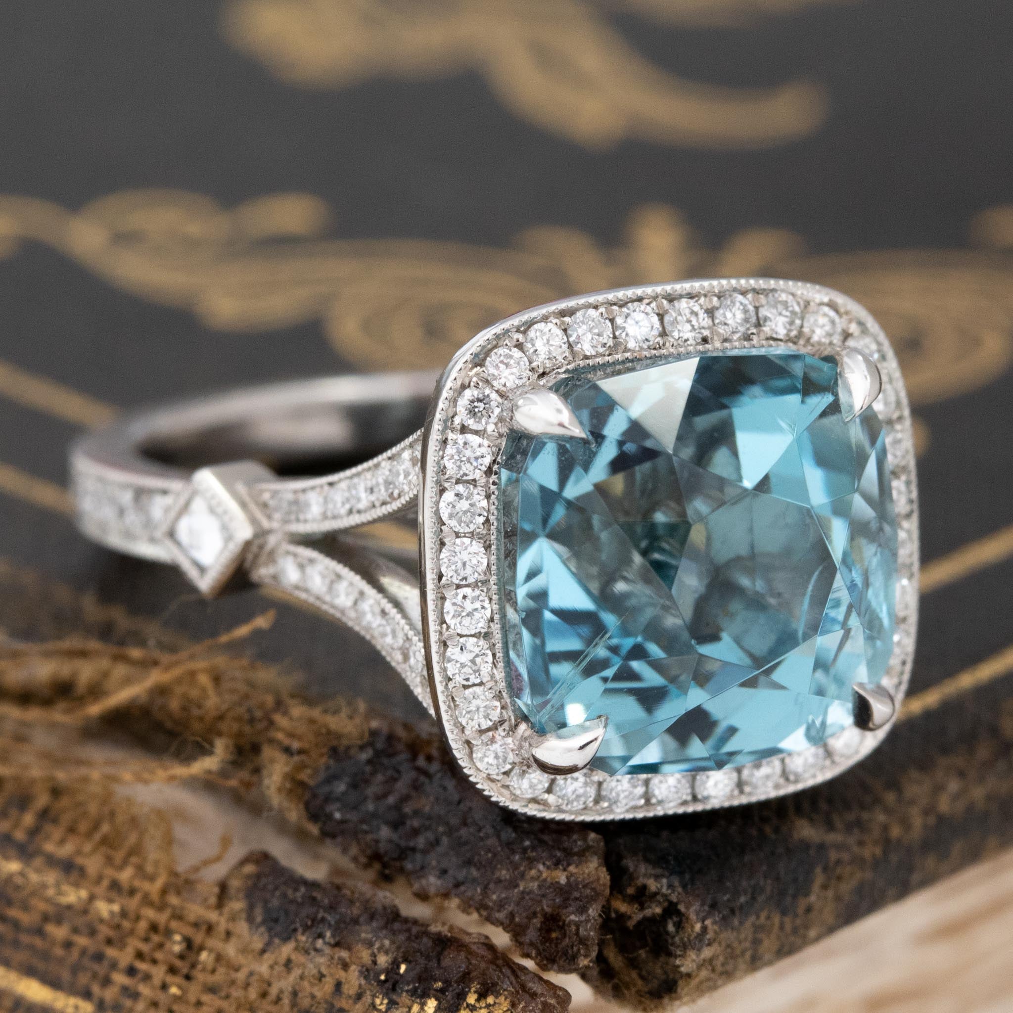 Aquamarine is a gemstone that is often associated with tranquility, serenity, and harmony as it relates to the stillness and clarity of water (hence the name aquamarine!). This blue gemstone can range in hue, and the cushion cut aquamarine in this Victor Canera setting is absolutely stunning. The stone itself was actually cut by Jeff White, a renowned gem cutter with over 30 years of experience in faceting gemstones.