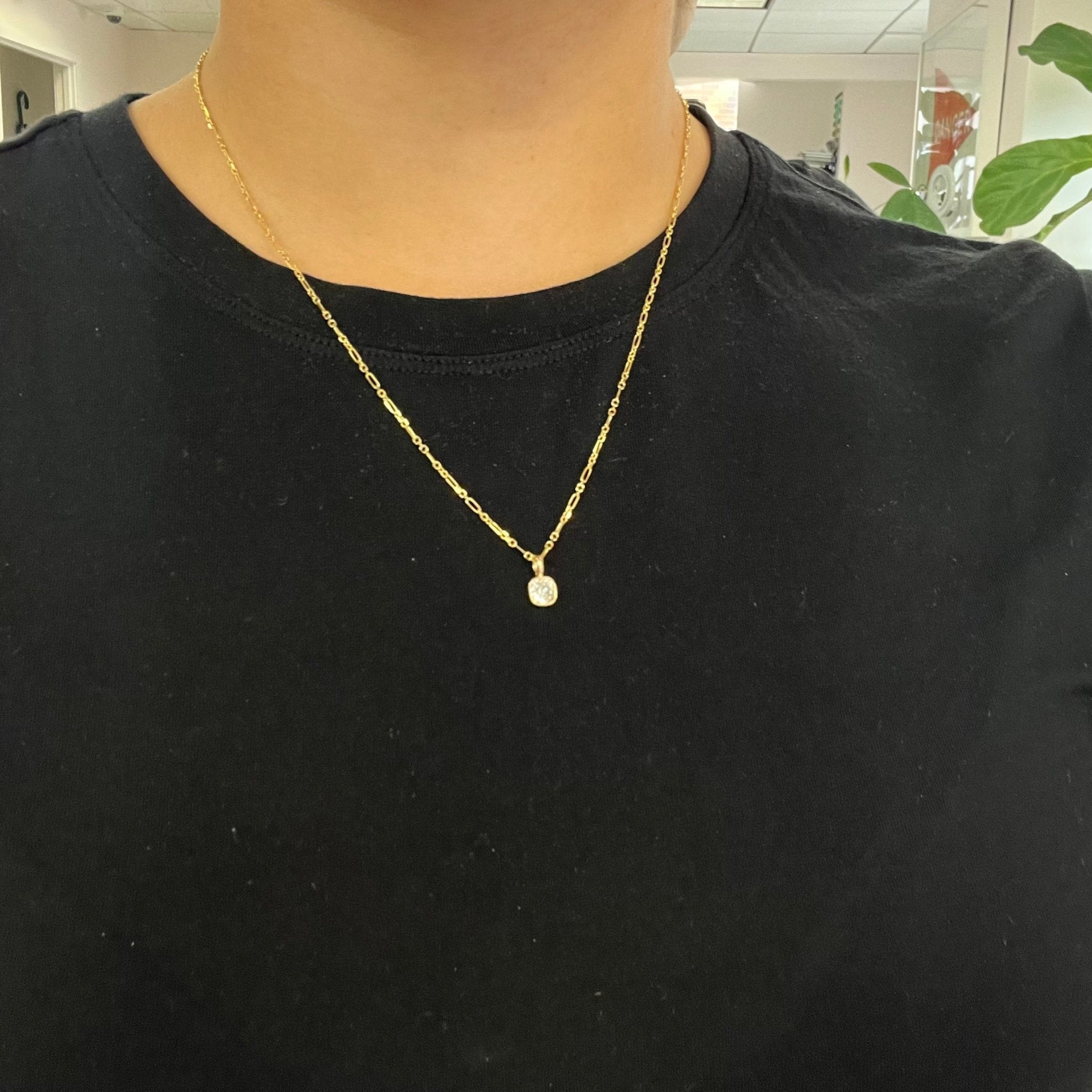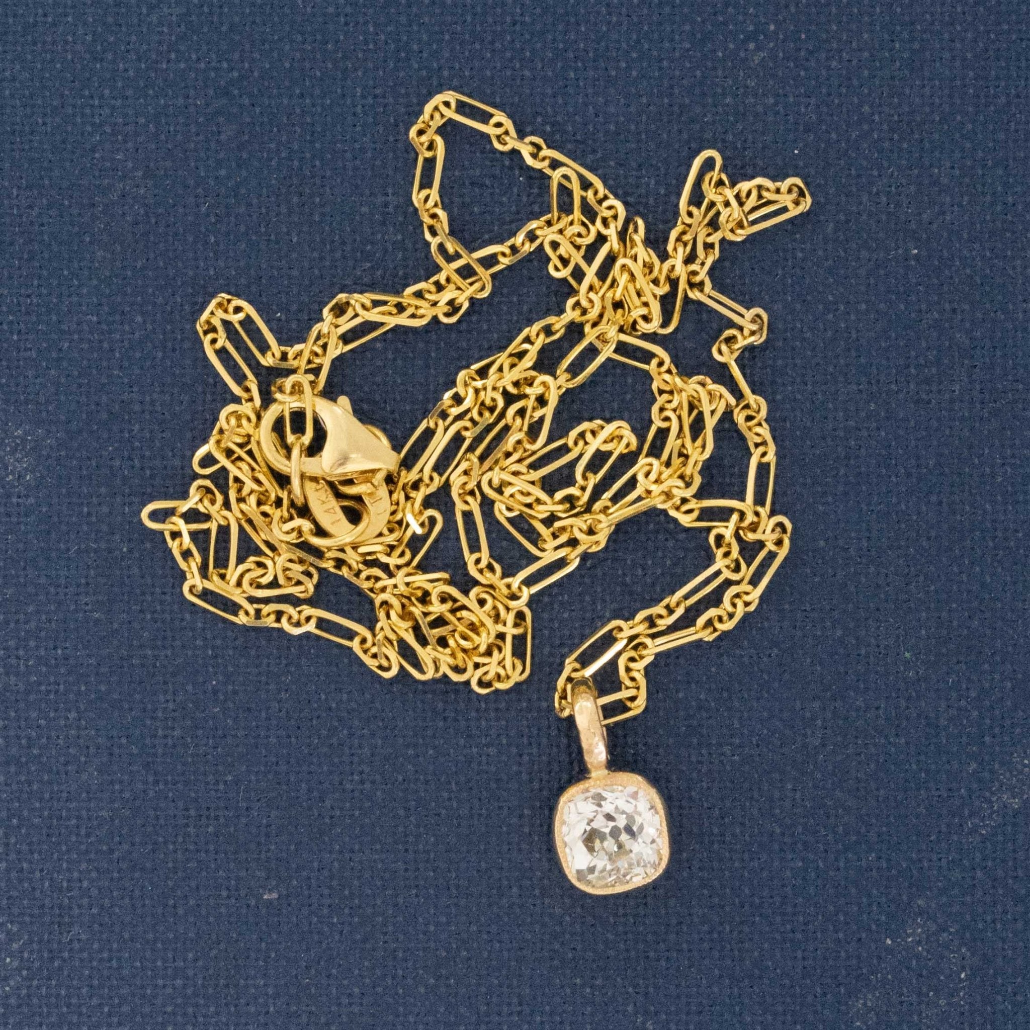 A sweet old mine cut diamond bezel pendant, set along a contemporary gold chain in 14kt gold. A simple and chic staple in one's jewelry collection, made all the more charming with the chunky glory of an antique diamond.