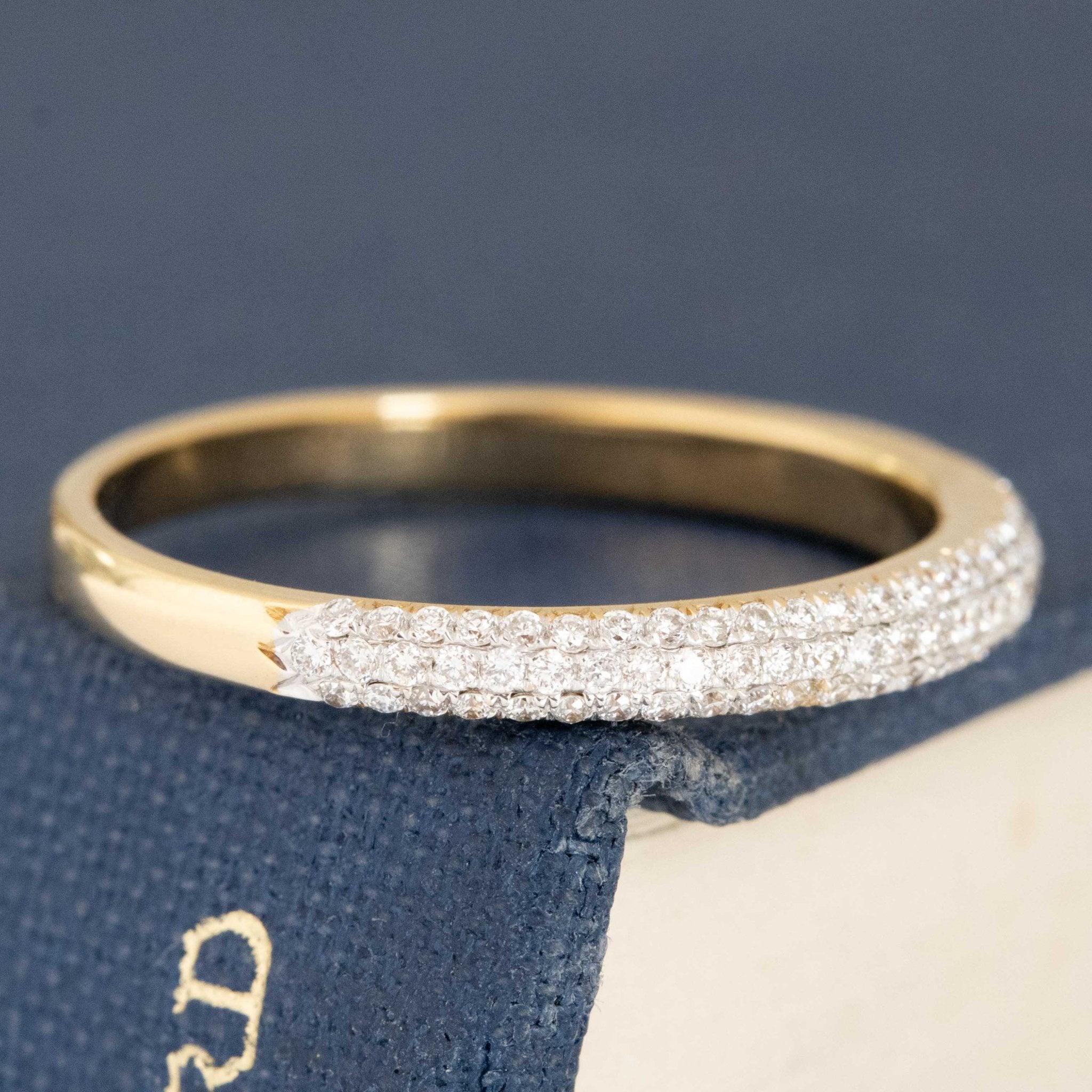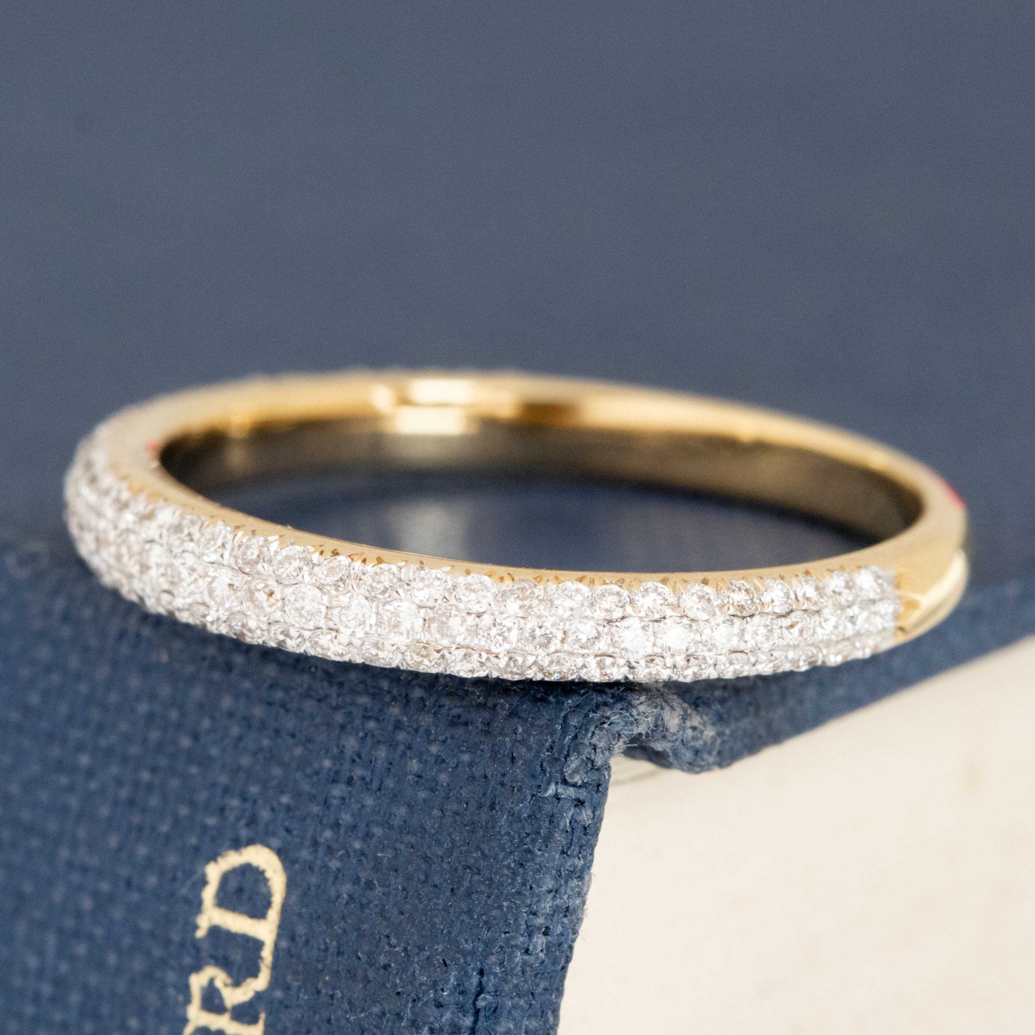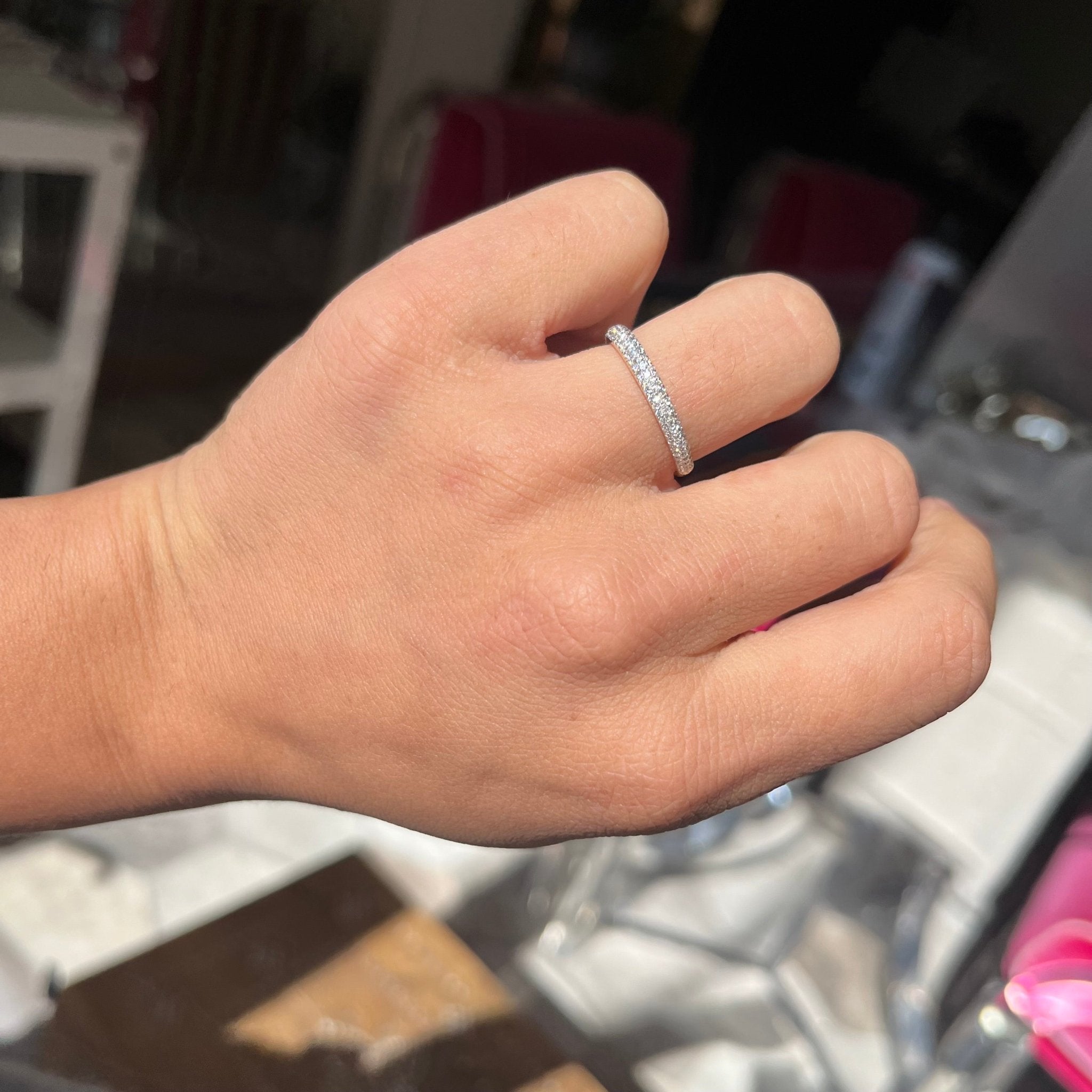 Dainty and feminine half eternity band, set with twinkling round diamonds! Low profile and slender, it will stack perfectly with almost any engagement ring, as well as other bands.