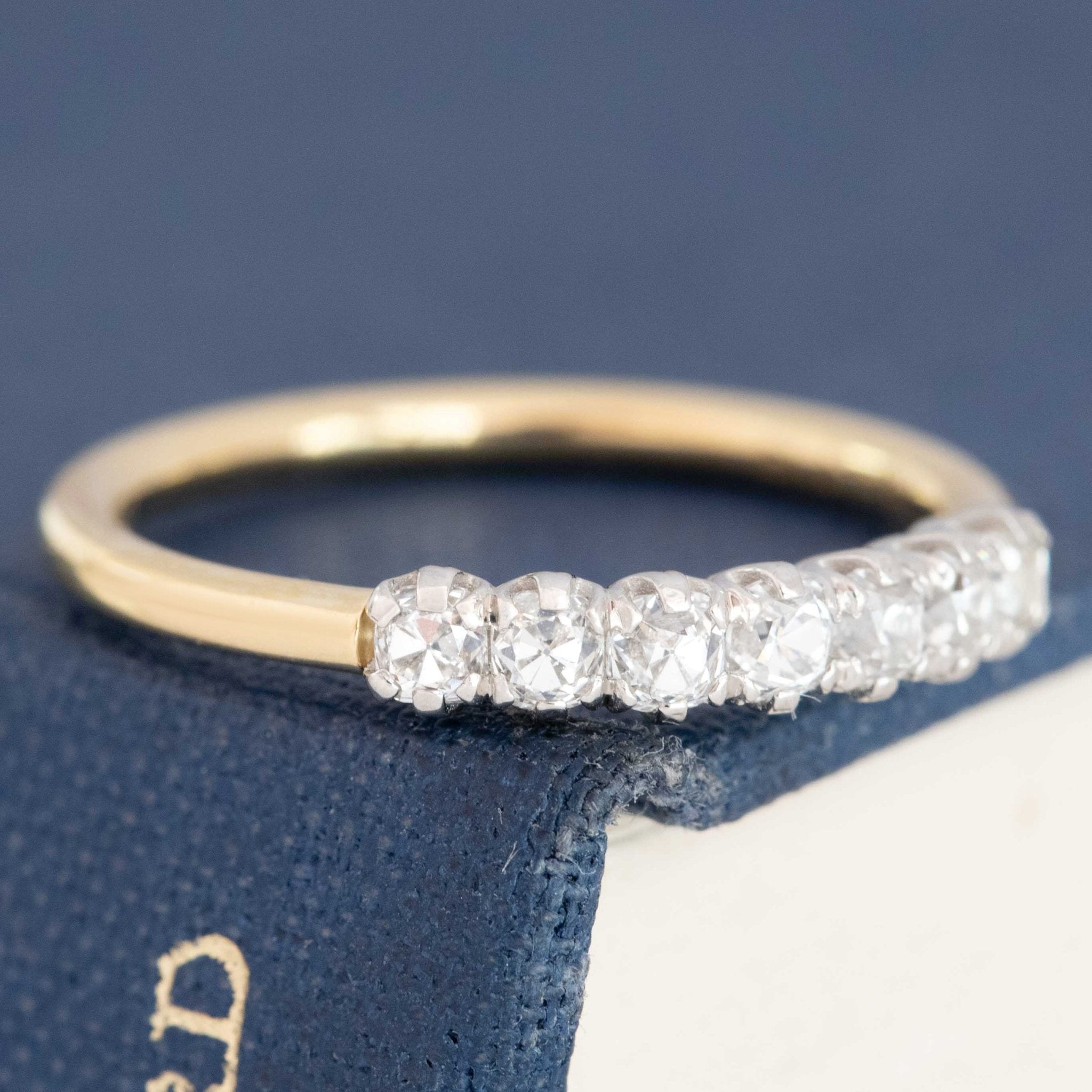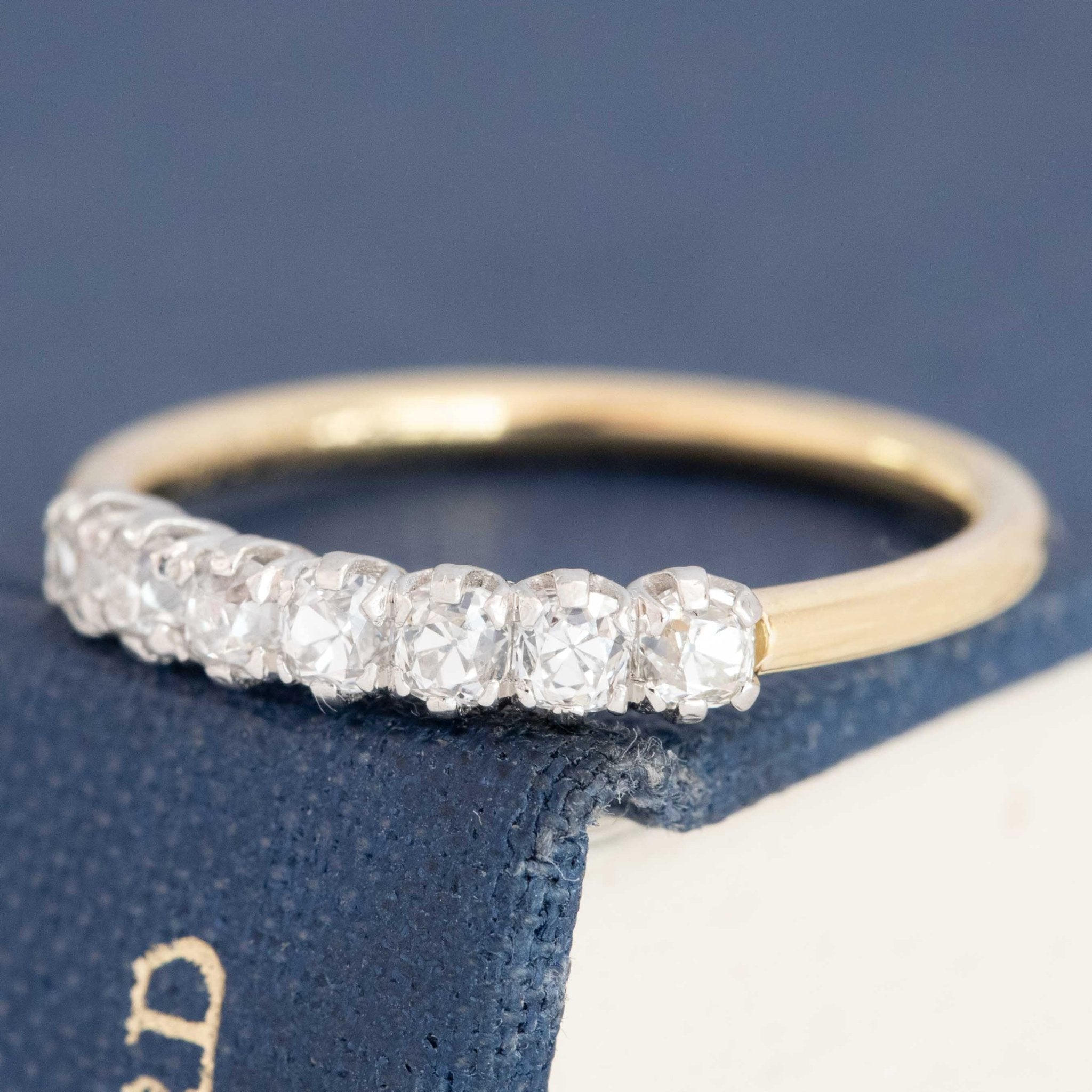 Modeled after antique diamond half-hoop bands from the Georgian and Victorian eras, this 7-stone band is set with chunky and charming old mine cut diamonds in 18kt yellow gold and platinum! The diamonds are bright and sparkly, twinkly and sparking brightly - so beautiful and elegant on the finger.