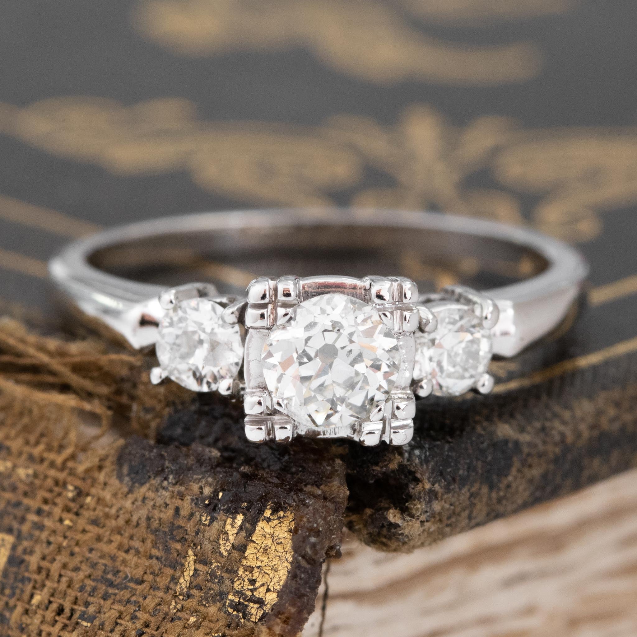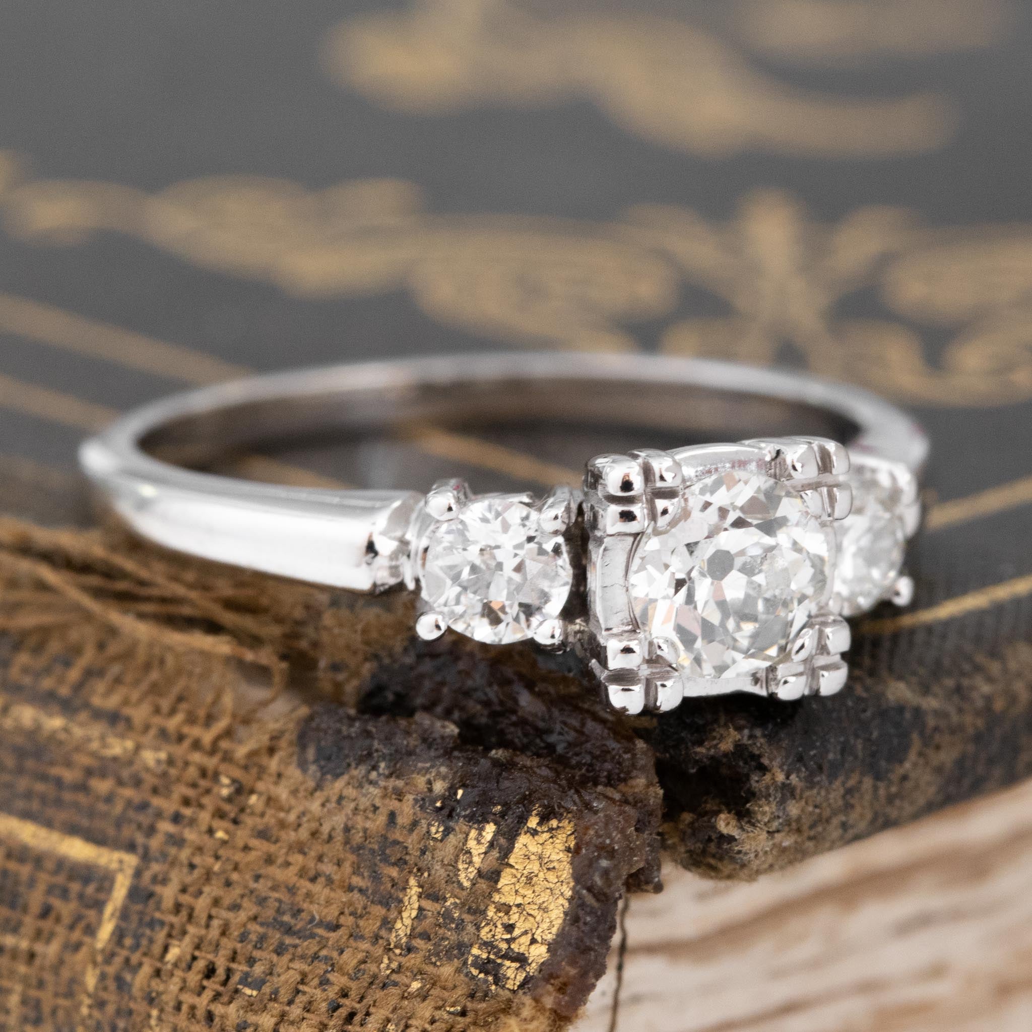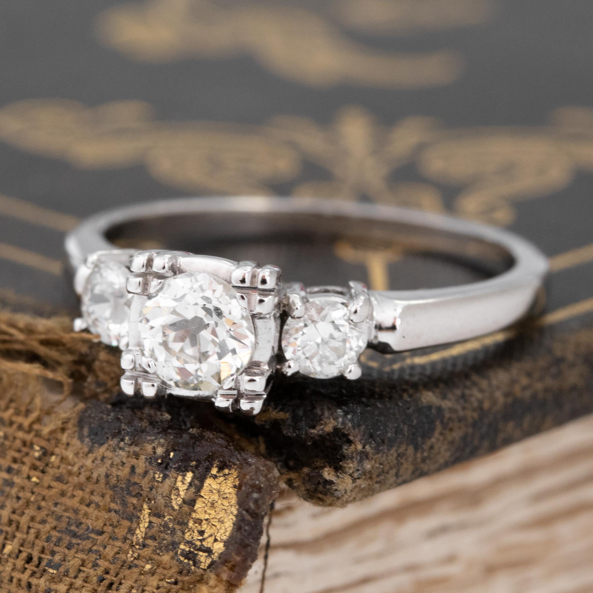 A most darling vintage trilogy ring, set with prismatic Old Euros in a white gold mounting! We love the square-shaped bezel that the center OEC sits in, adding a nice sharp contrast between itself and the round diamonds on the shoulders. Representative of the past, present, and future, the diamonds span across the finger beautifully and sparkle like mad!