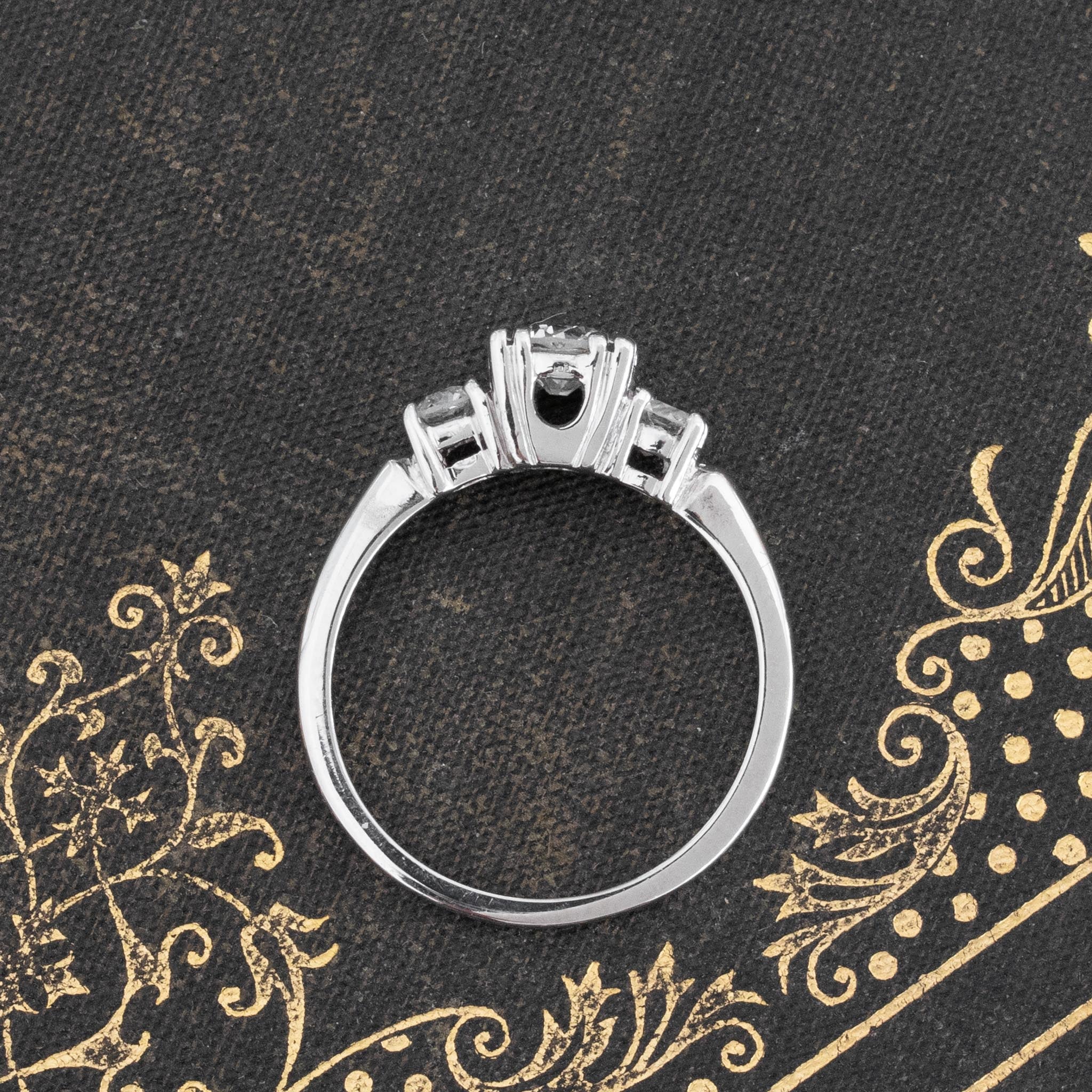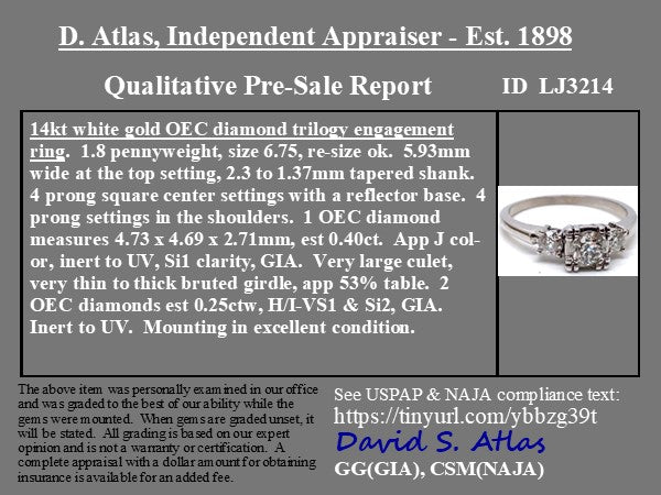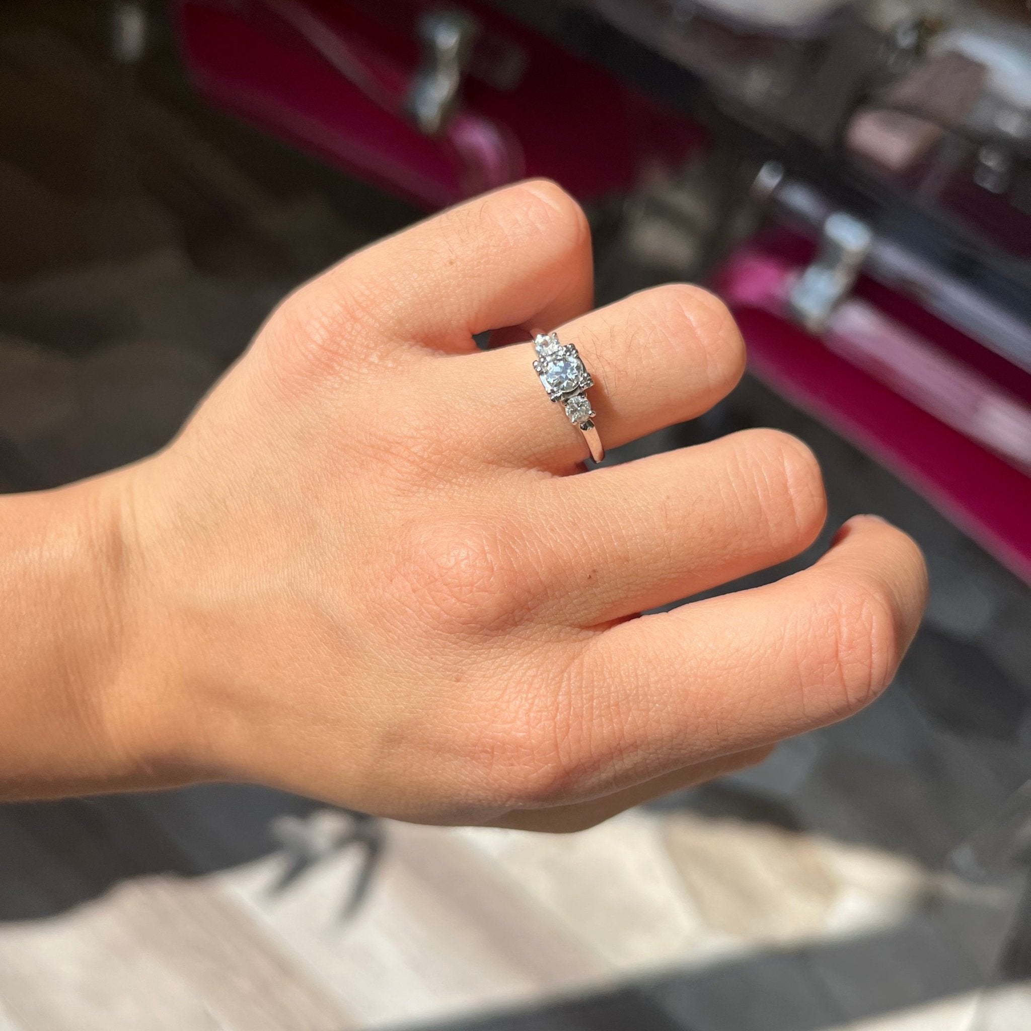 A most darling vintage trilogy ring, set with prismatic Old Euros in a white gold mounting! We love the square-shaped bezel that the center OEC sits in, adding a nice sharp contrast between itself and the round diamonds on the shoulders. Representative of the past, present, and future, the diamonds span across the finger beautifully and sparkle like mad!