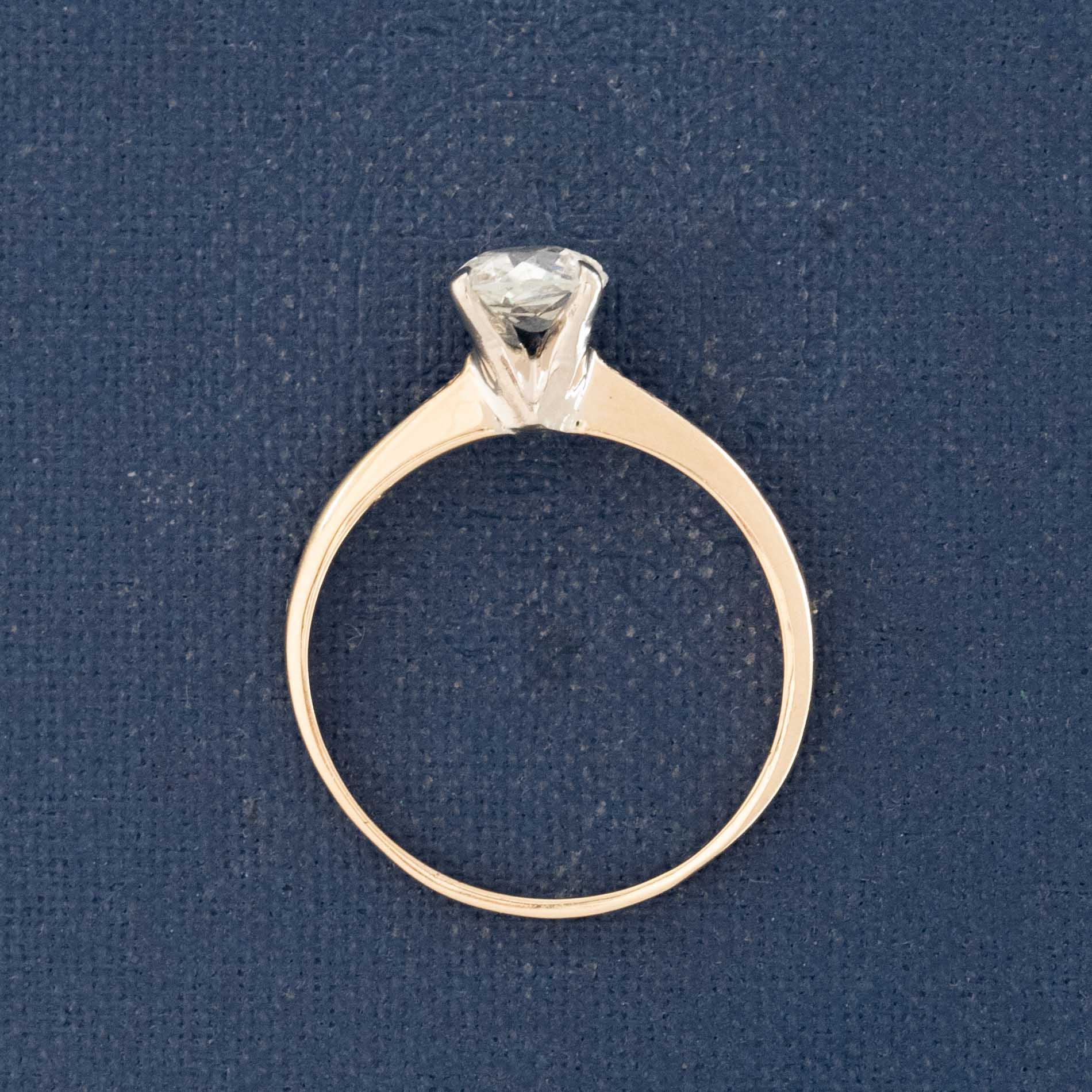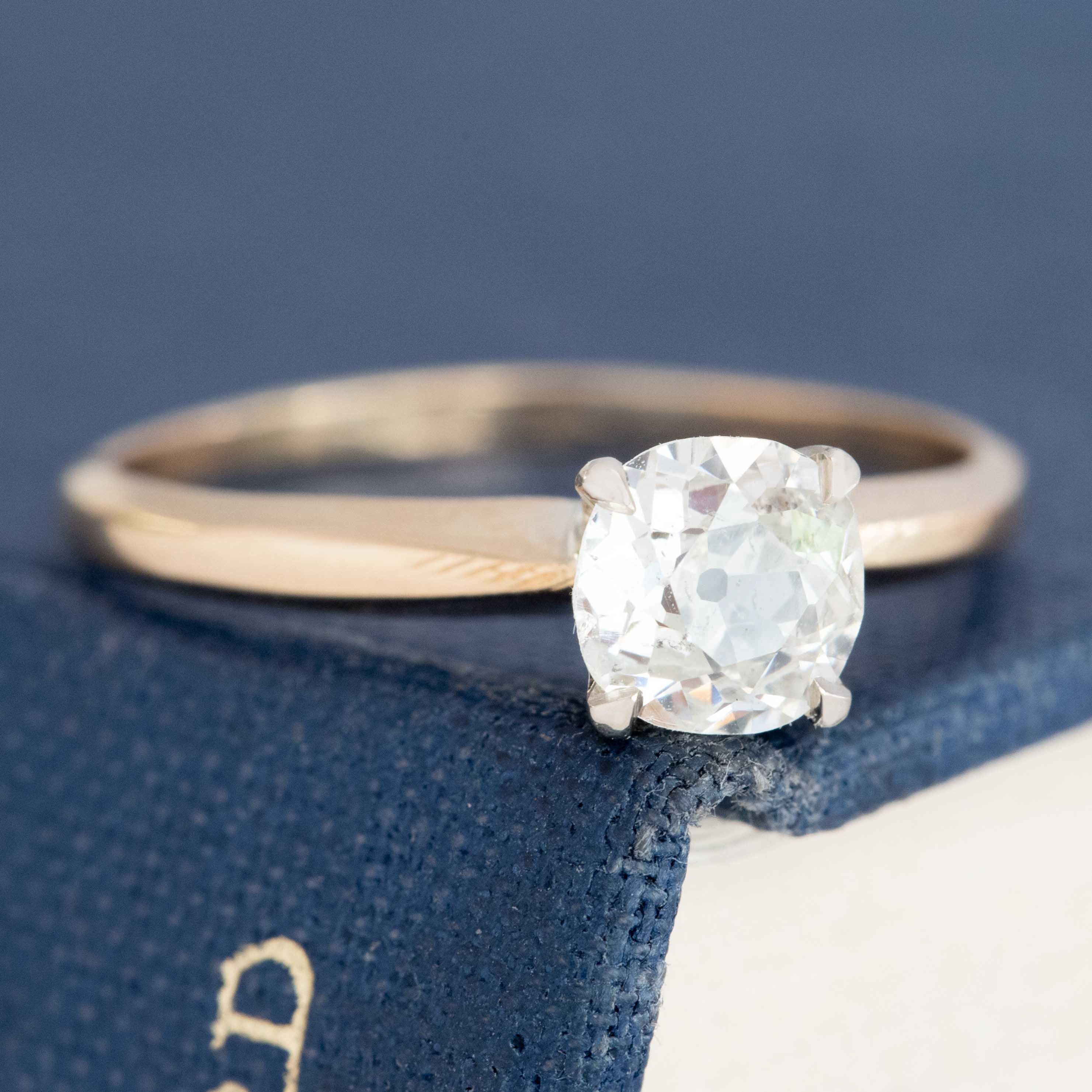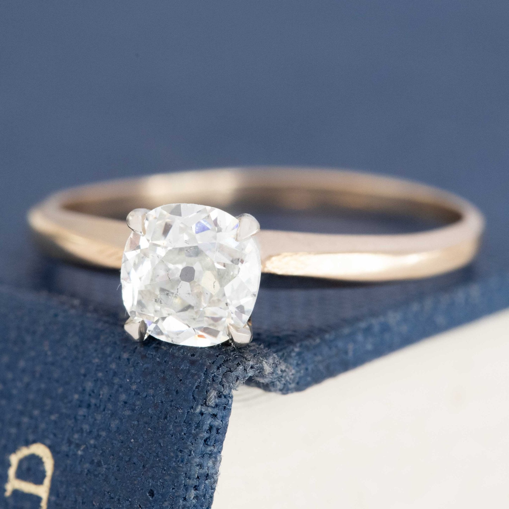 This sweet antique old mine cut solitaire is chunky and bright - the stone sits in four claw prongs that allow those old facets to really shine. The shank tapers in ever-so-slightly at the shoulders, and it stacks with other bands like a dream.