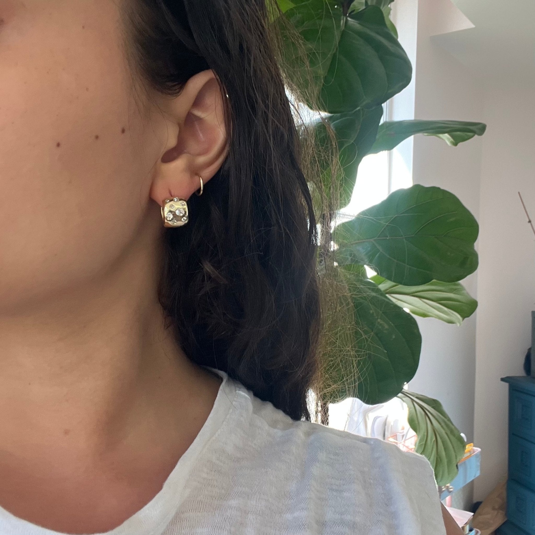 We are big fans of hoops around here so what do we do? We created chunky, close-to-the-ears hoop huggies studded with our old mine cut diamonds! The result is a pair of earrings that is not one one of a kind, but also with that gorgeous antique vibe. The diamonds are all chunky little b=nuggets - pulling colors and sparkle with every movement! Just a perfect daily staple.