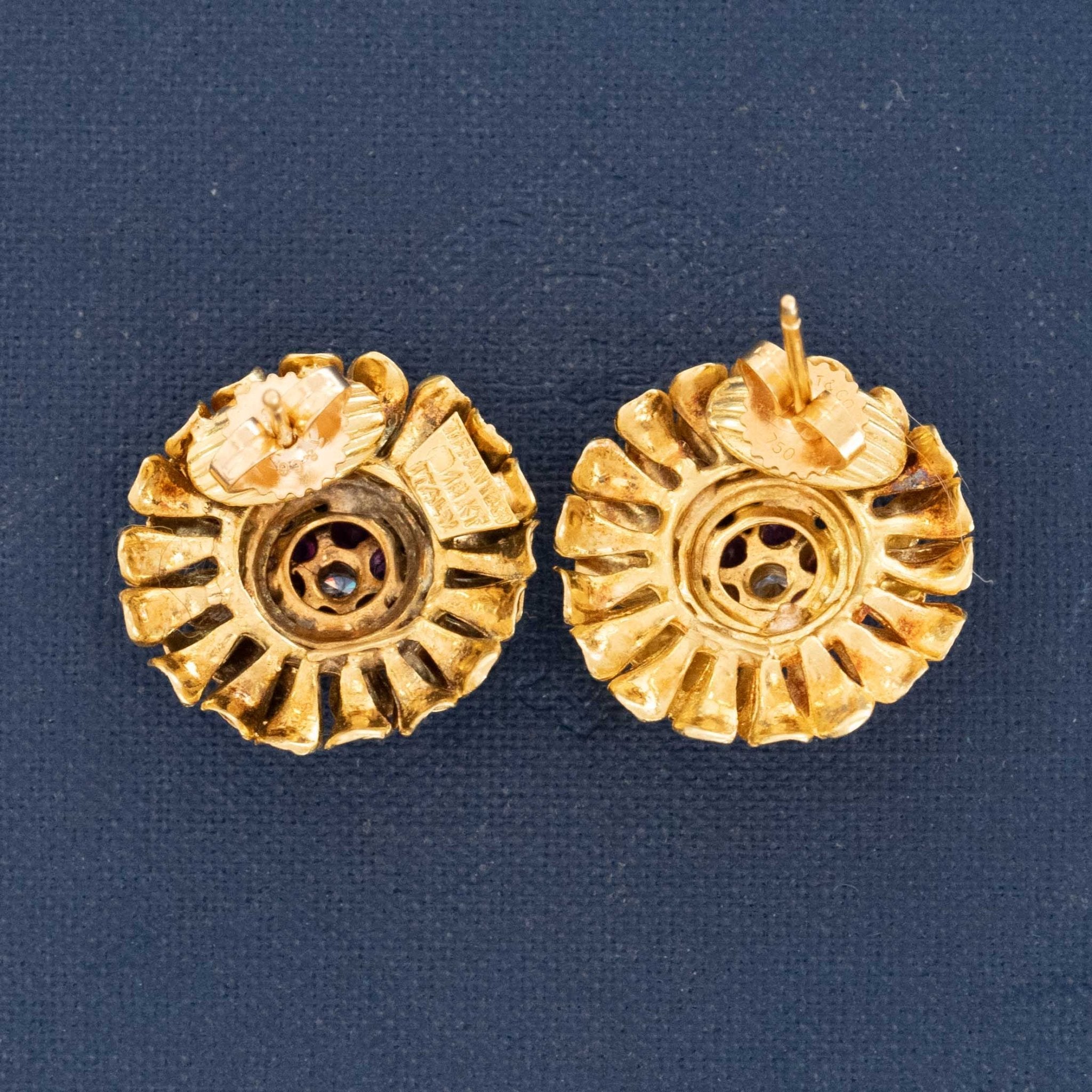 The loveliest vintage floral stud earrings, chock full of detail, gold petals, and gemmy stamen. We've not decided whether they are Zinnias or Chrysanthemums, but either way, they have a delightful presence on the lobes and are so sweet.