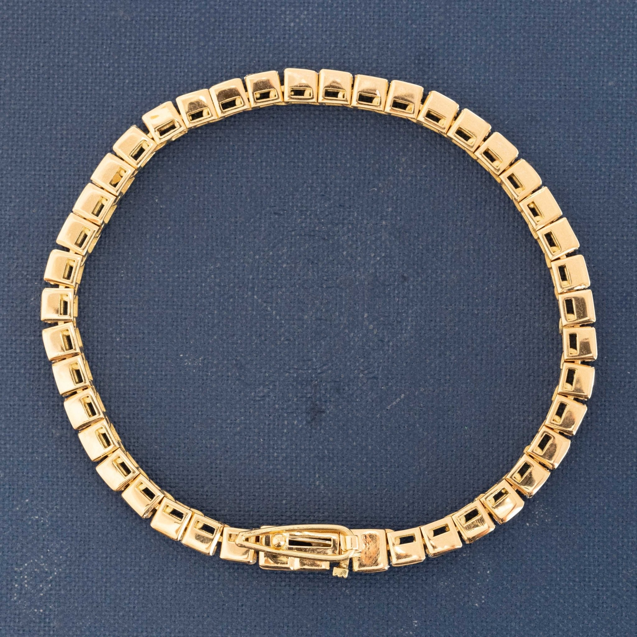 Nothing quite like a good ol' tennis bracelet to complete one's jewelry suite! This one is one of our own creation, set with juicy and delicious emerald cut diamonds in yellow gold bezels. Coming in at 7.19ctw total gem weight, we are big fans of the proportions on this baby. The diamonds are shimmery and happy, with faceting we absolutely adore. Perfect solo, with a watch, with chain link bracelets - perfect all the damn time.