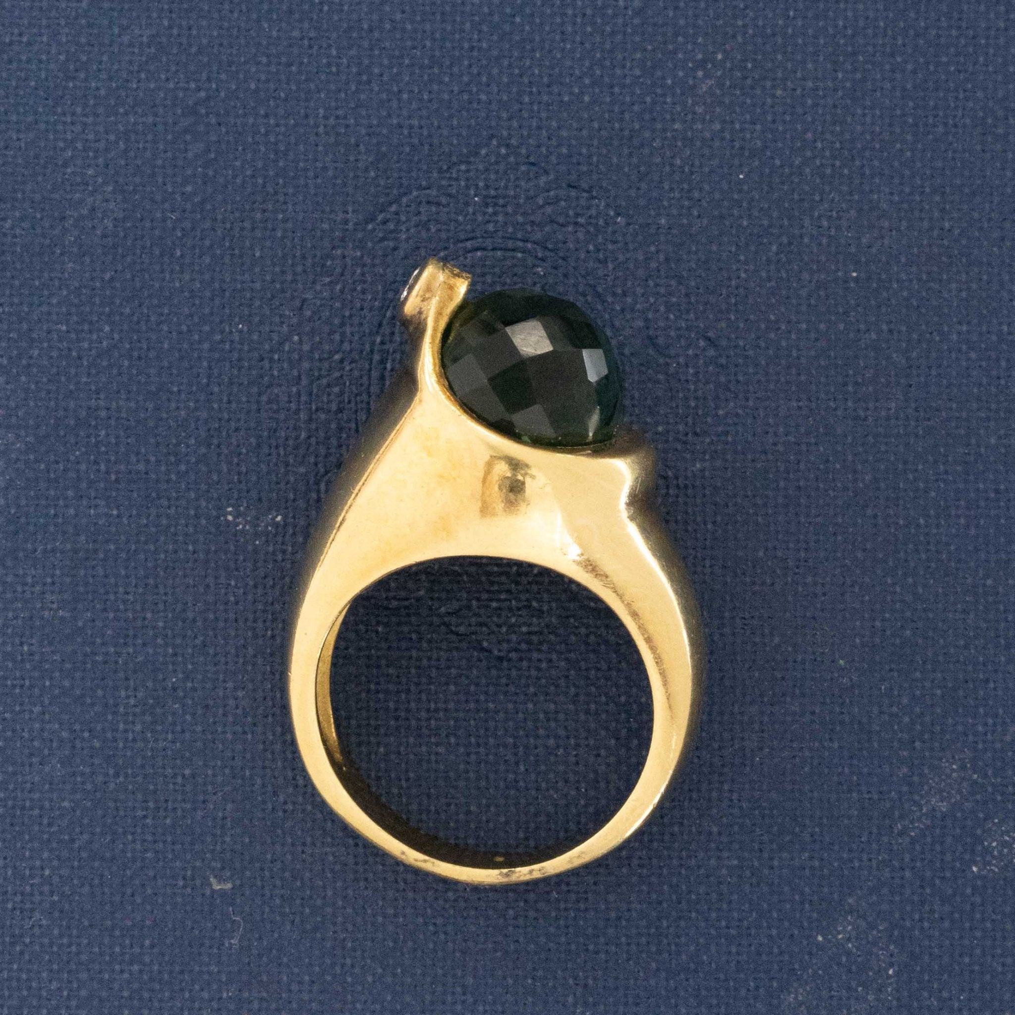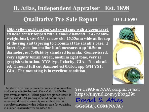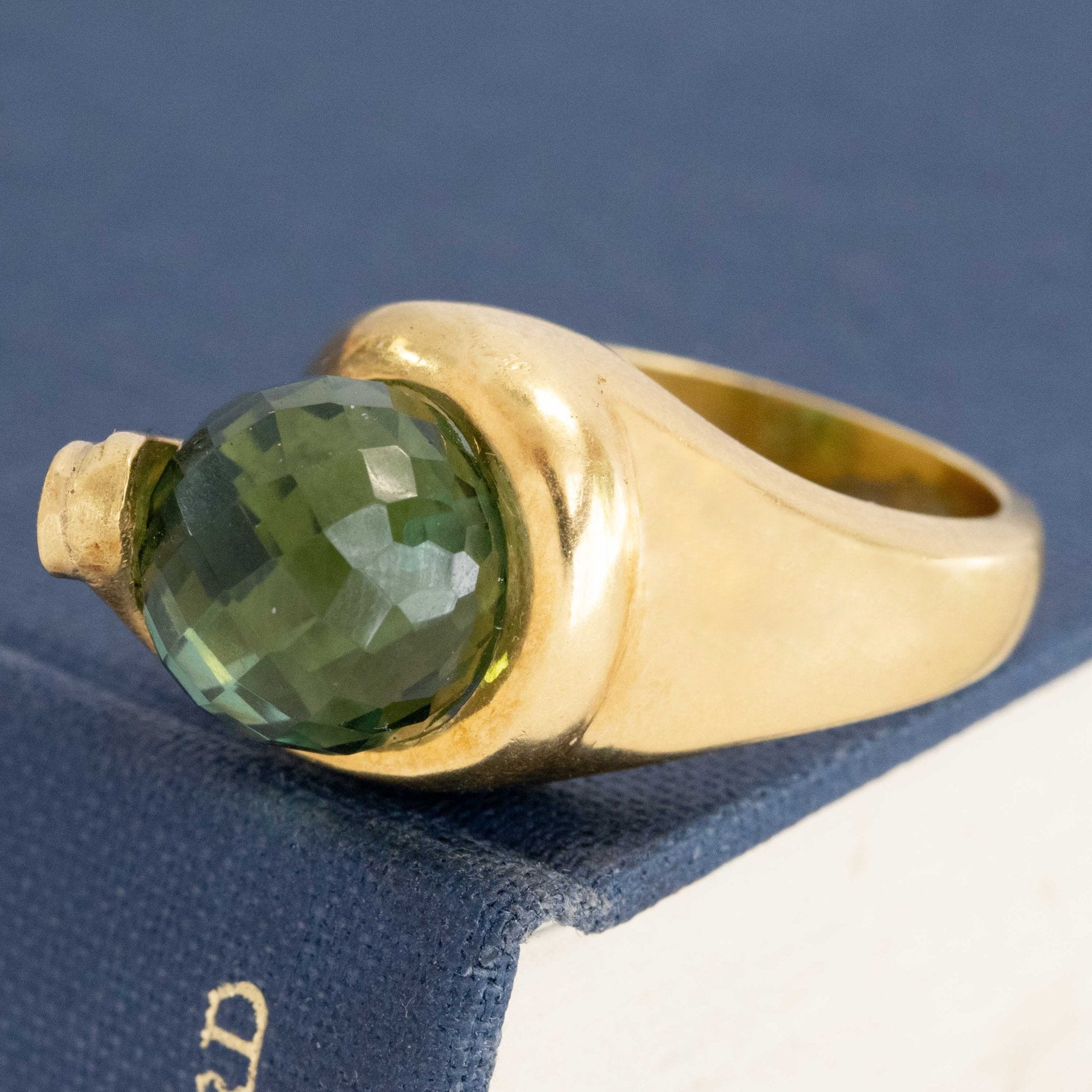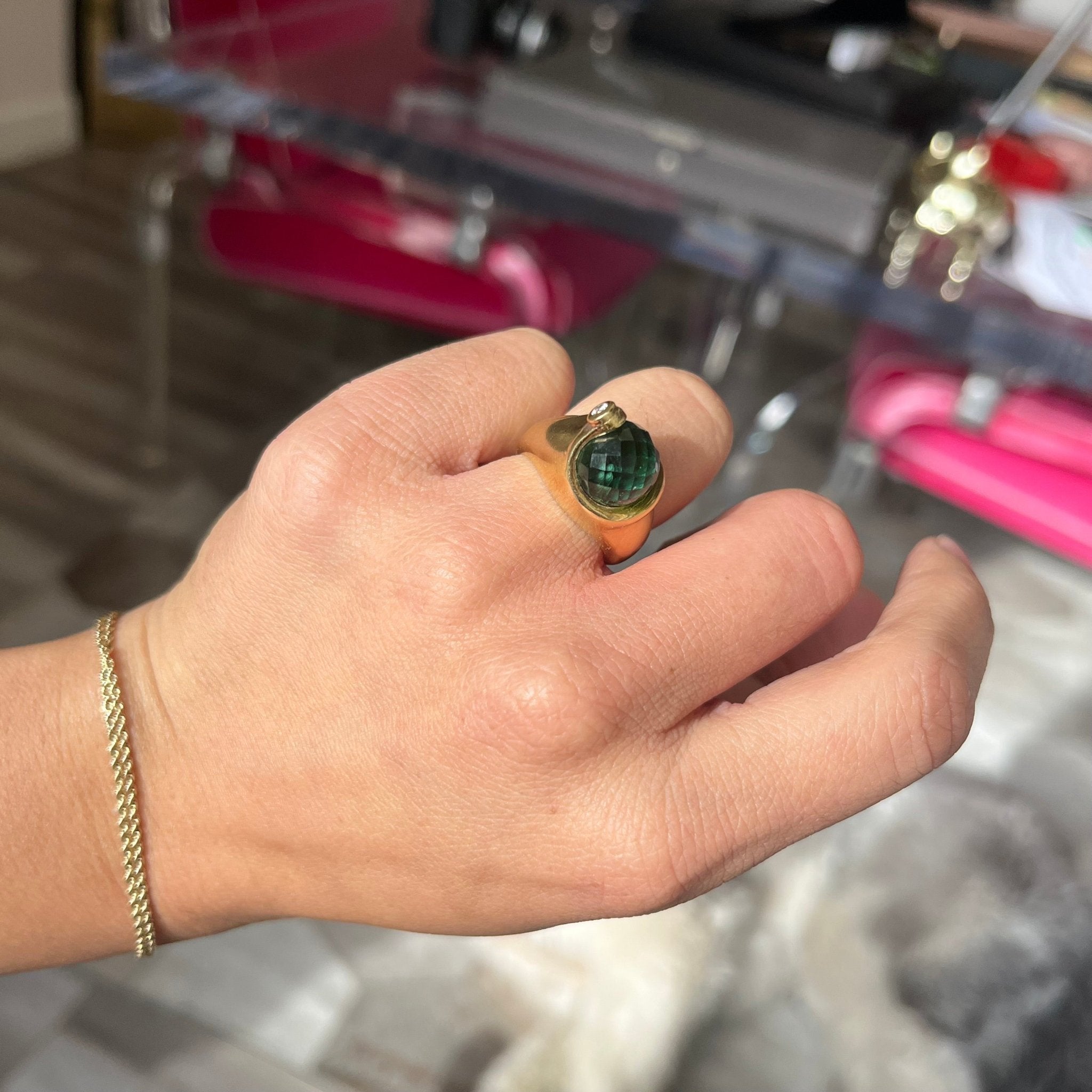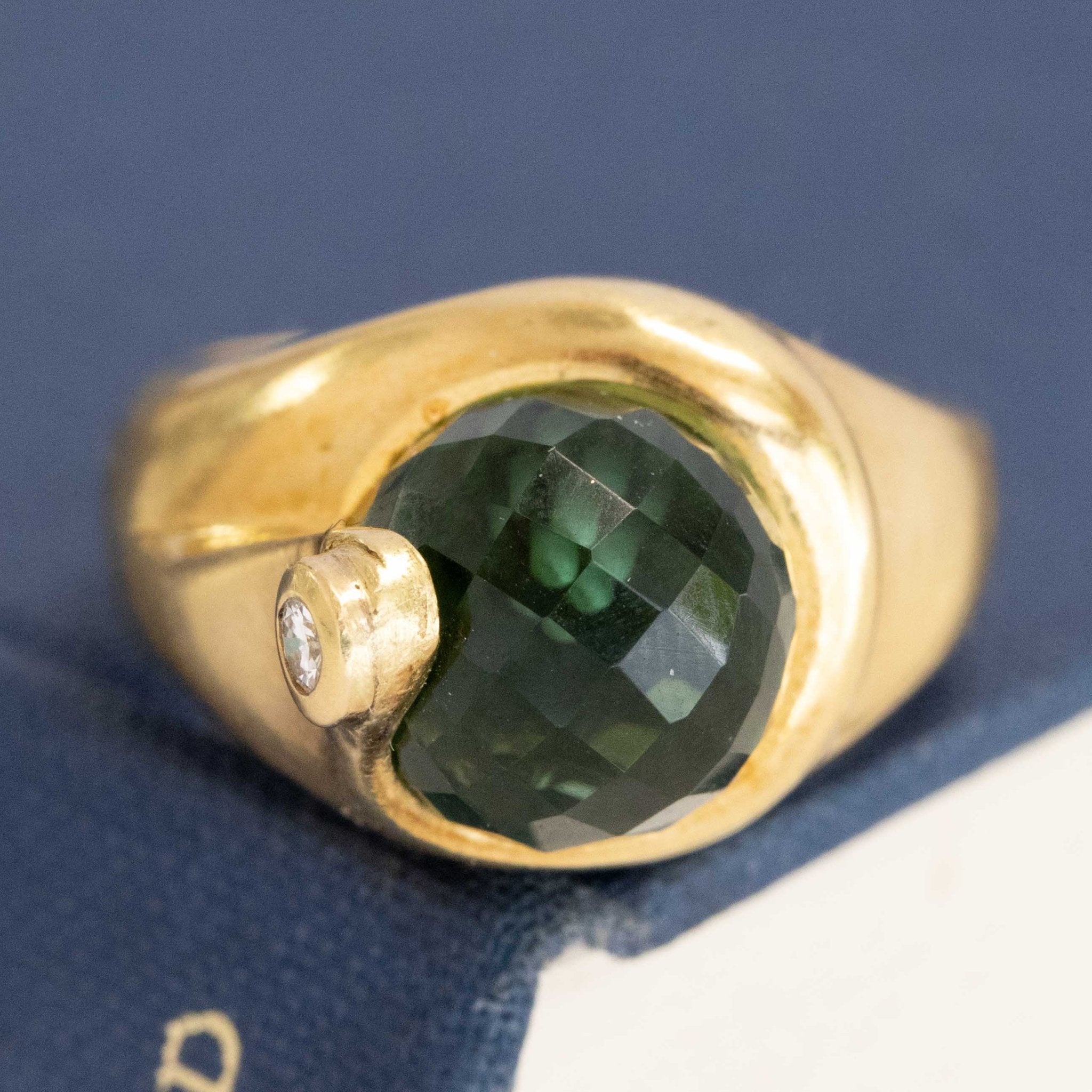 A funky gold vintage ring with a spherical faceted tourmaline set front and center, quite the looker if you ask us! The green tourmaline orb is tension set in a buttery gold ring with a diamond accent along the top and makes for a tactile delight and excellent pop of color on the hands.