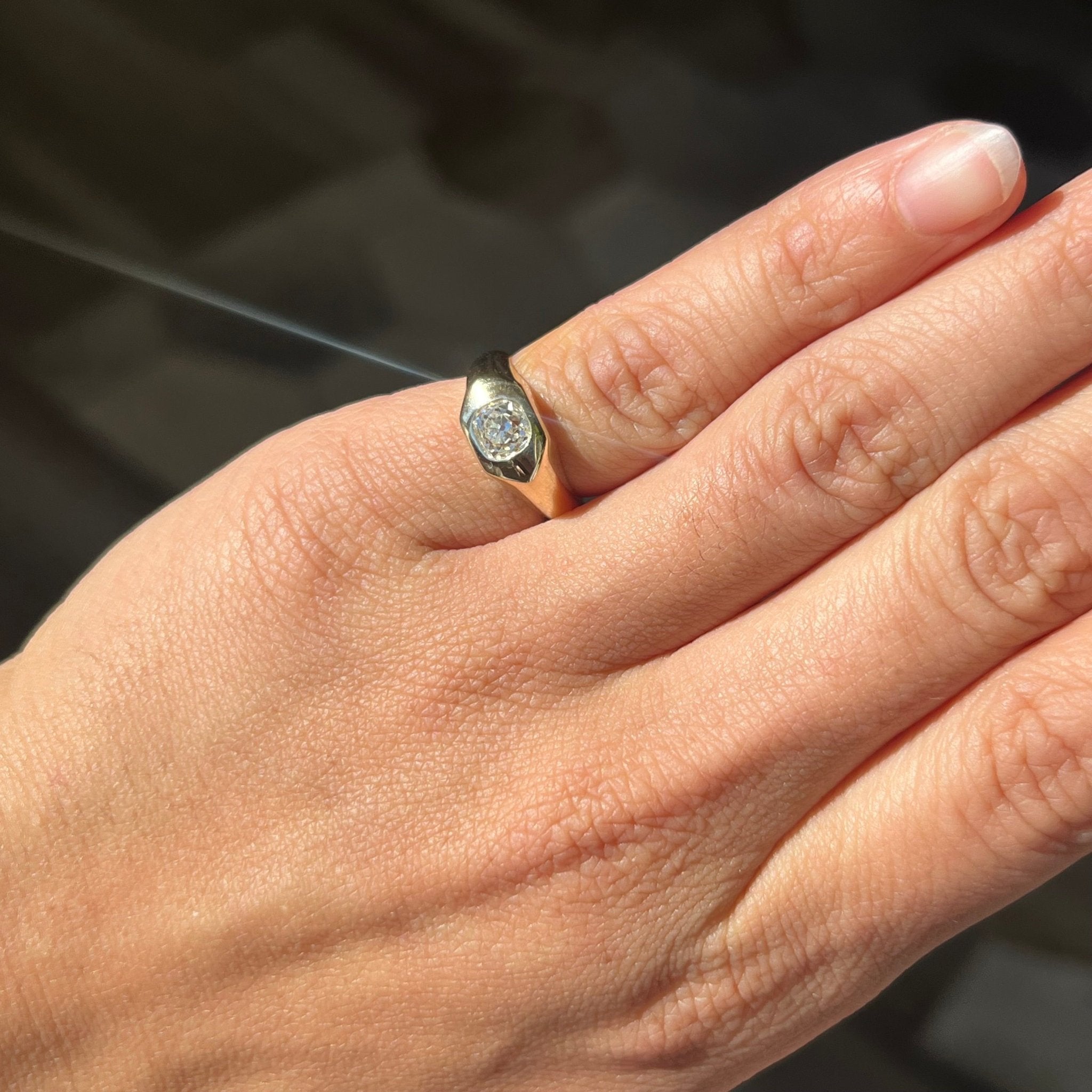 You guys have been asking us for diamond-studded pinky rings so you know we had to deliver! Inspired by antique signet rings, but in a more pinky-appropriate proportion - we went for chunky and bold gold vibes with a single diamond flush-set in the center, A little sparkle never hurt nobody! This one has a chunky, rustic old mine cut diamond with the sweetest facets.