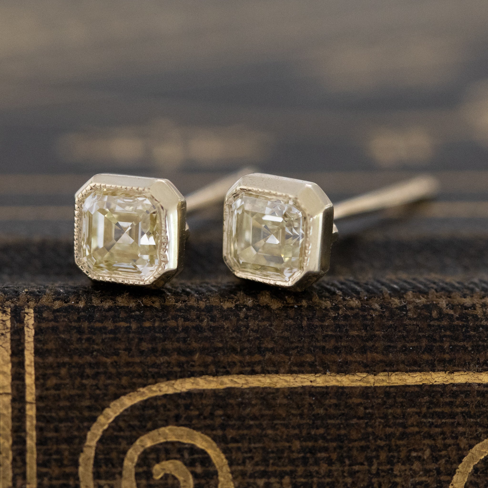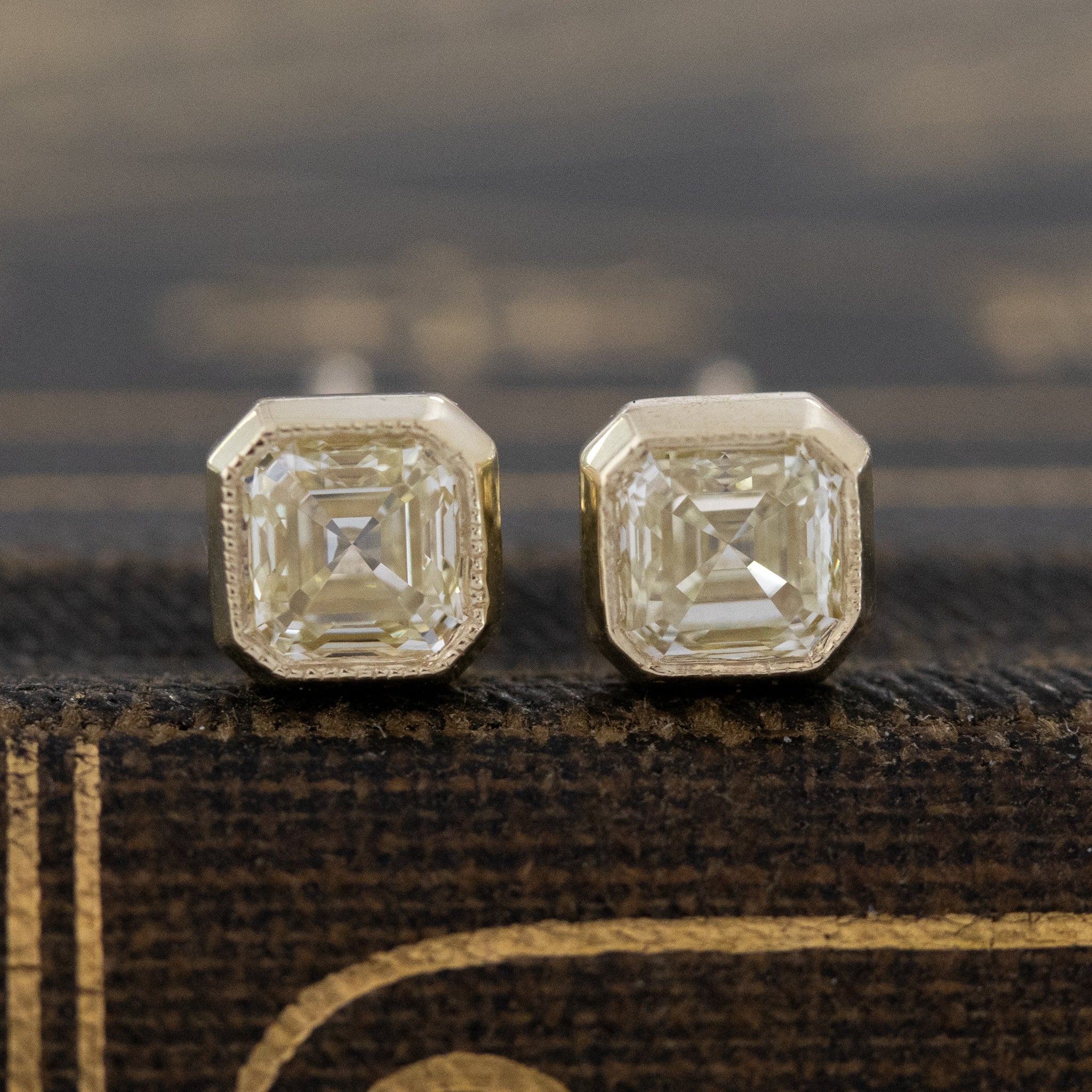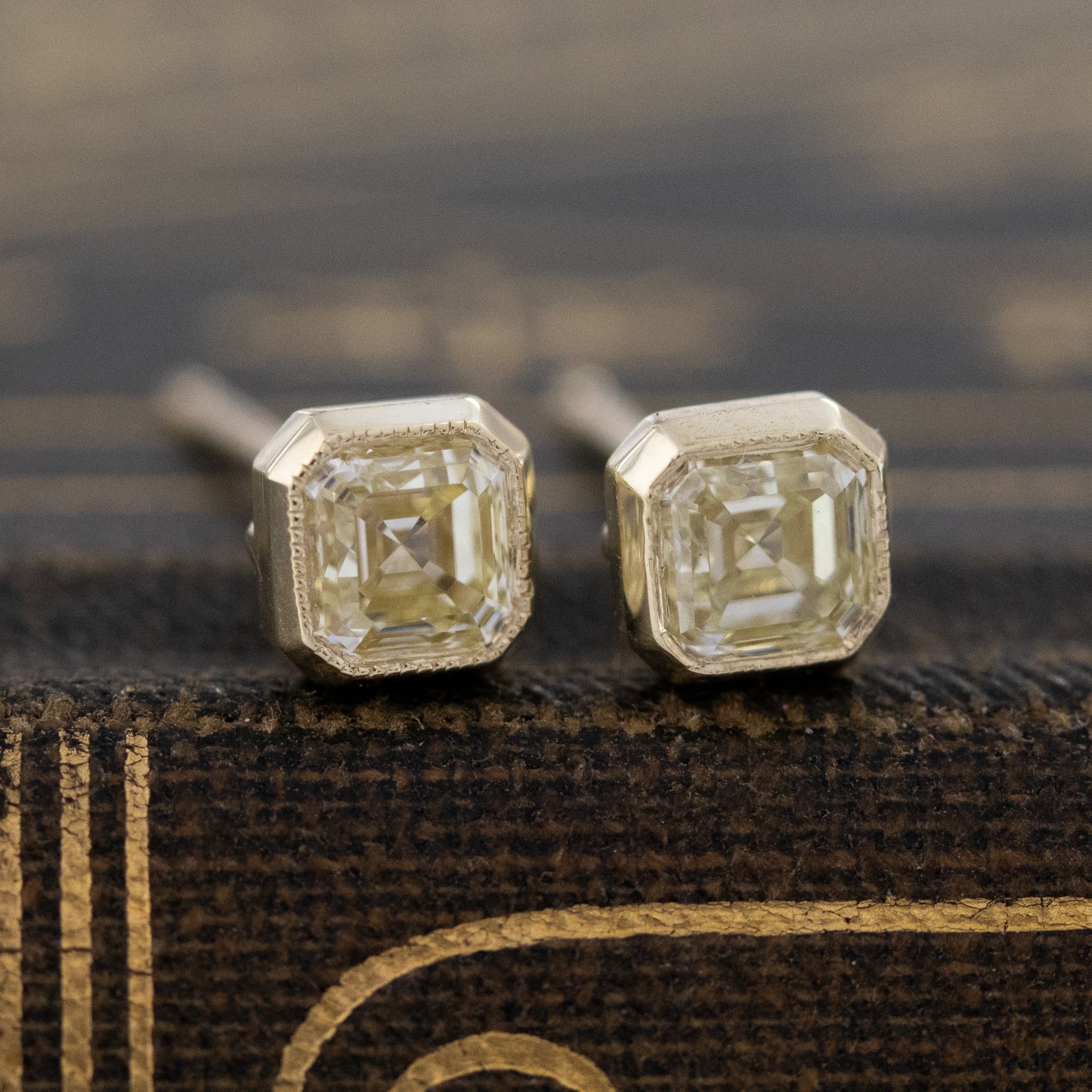 Sleek and elegant - the perfect hint of sparkle on the ears. The asscher cut diamonds were hand-selected by yours truly - the asschers have crisp faceting which simply draw your eyes in. Not to mention their beautiful, happy sunshine colors! Set in hand-crafted bezel settings and finished with delicate hand-applied milgrain. Low set on the lobes - just super chic!