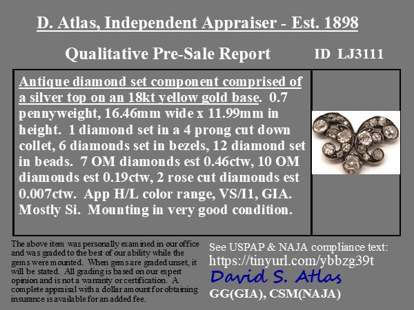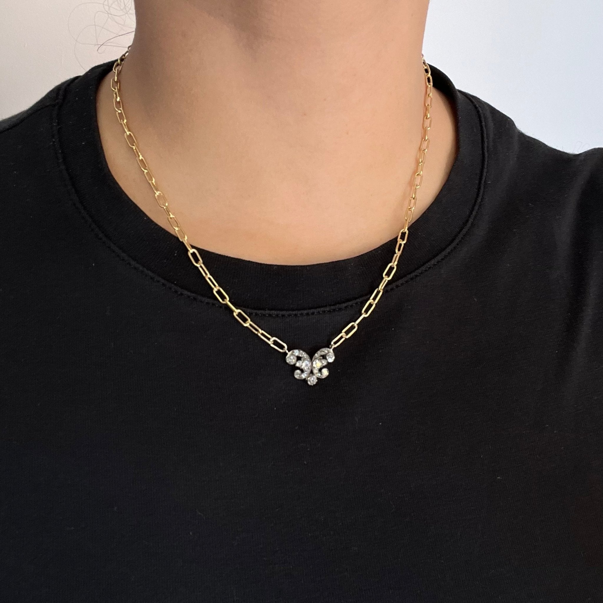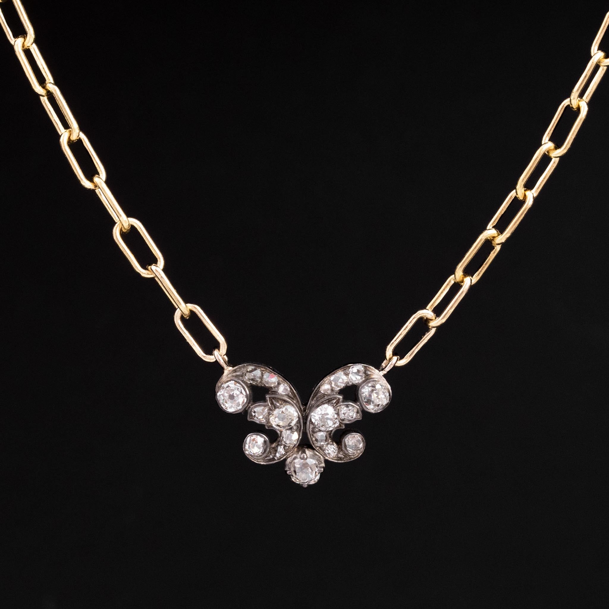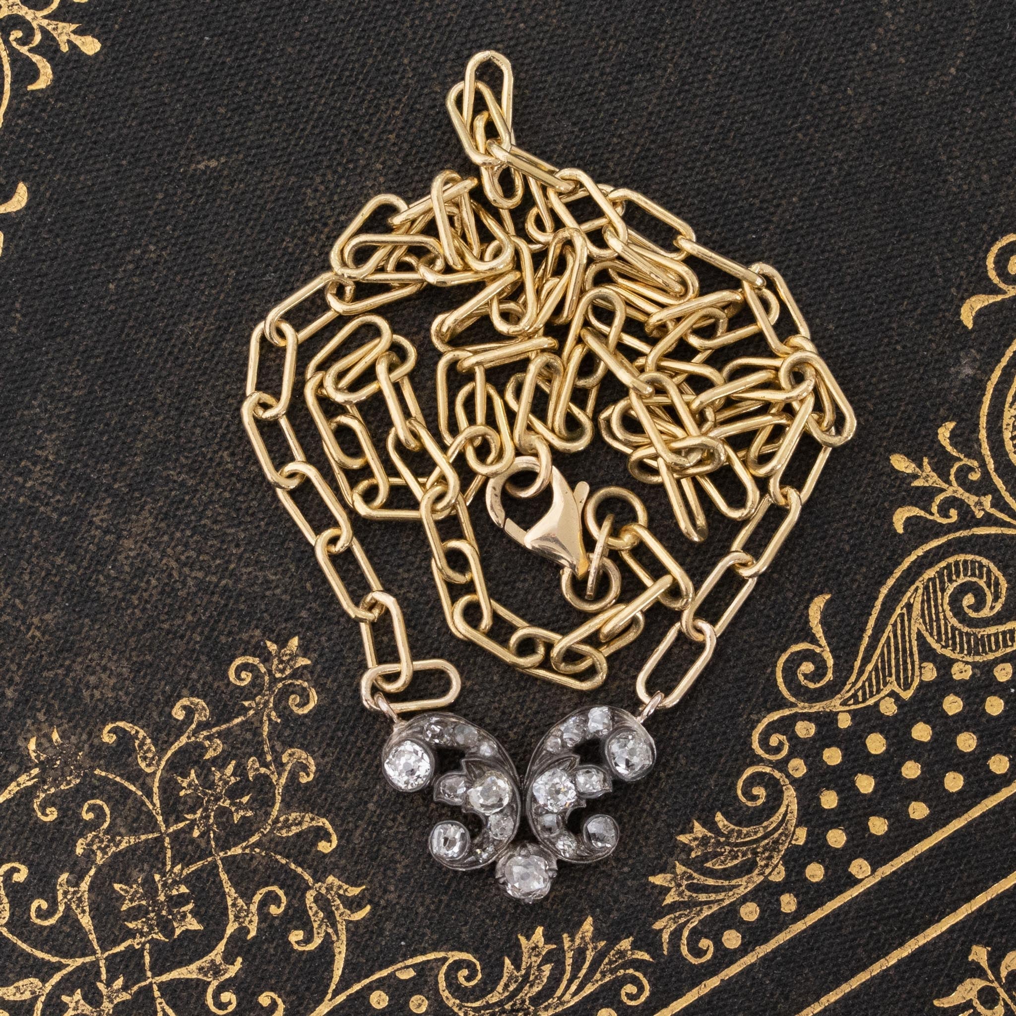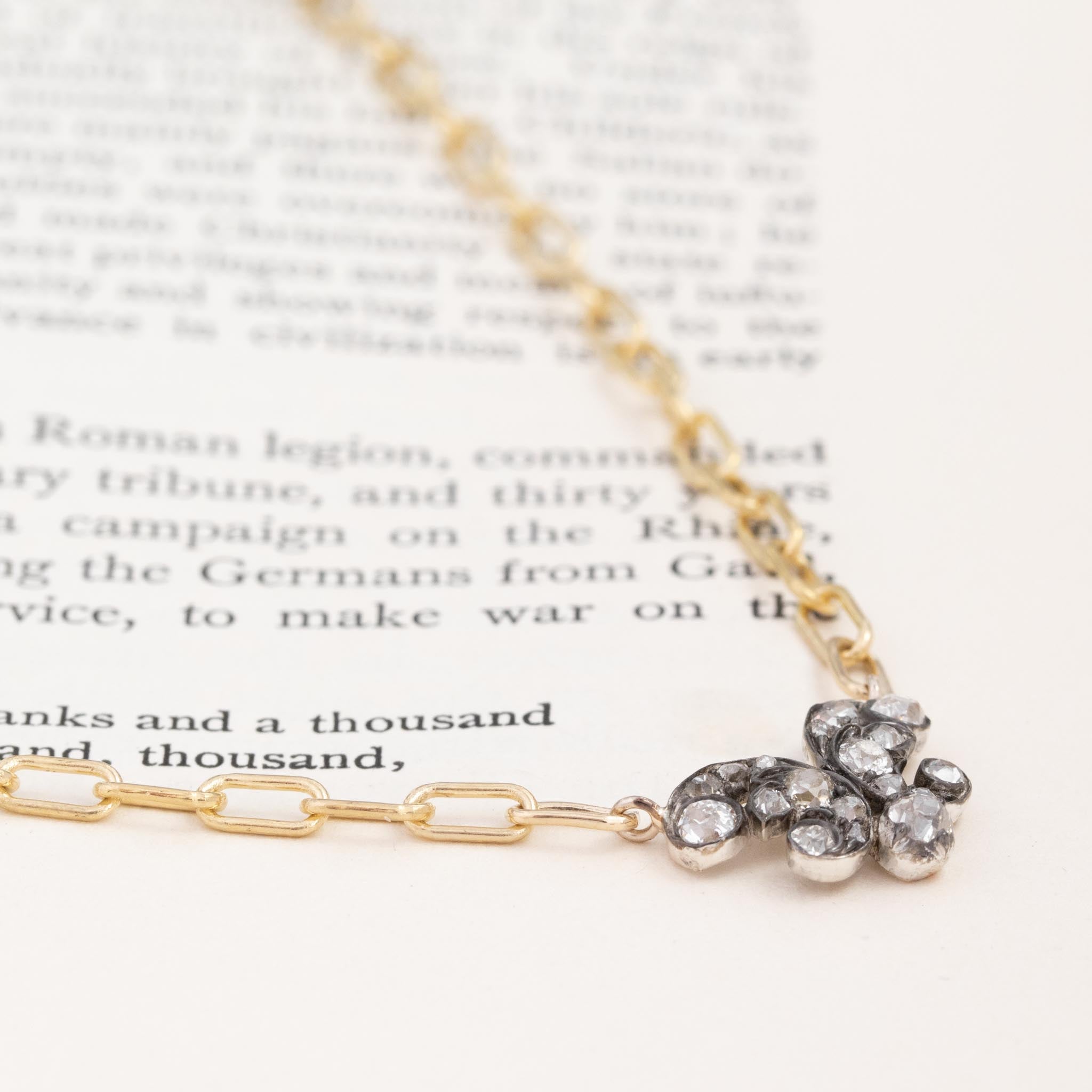 Very often we come across pieces of antique jewelry that have been harvested, broken apart, or clipped into smaller pieces. These become our favorite conversion jewels - such as this pendant! We imagine these bits and bobs lived their first lives as part of a grand necklace or brooch, but now they sit strung along a modern paperclip chain as a pendant. Studded with chunky old cut diamonds in the most charming little form, this unique pendant is one of our favorite ways to add antique charm into your everyday jewelry suite. Does this not remind of a butterfly, or perhaps an angel with outstretched arms?