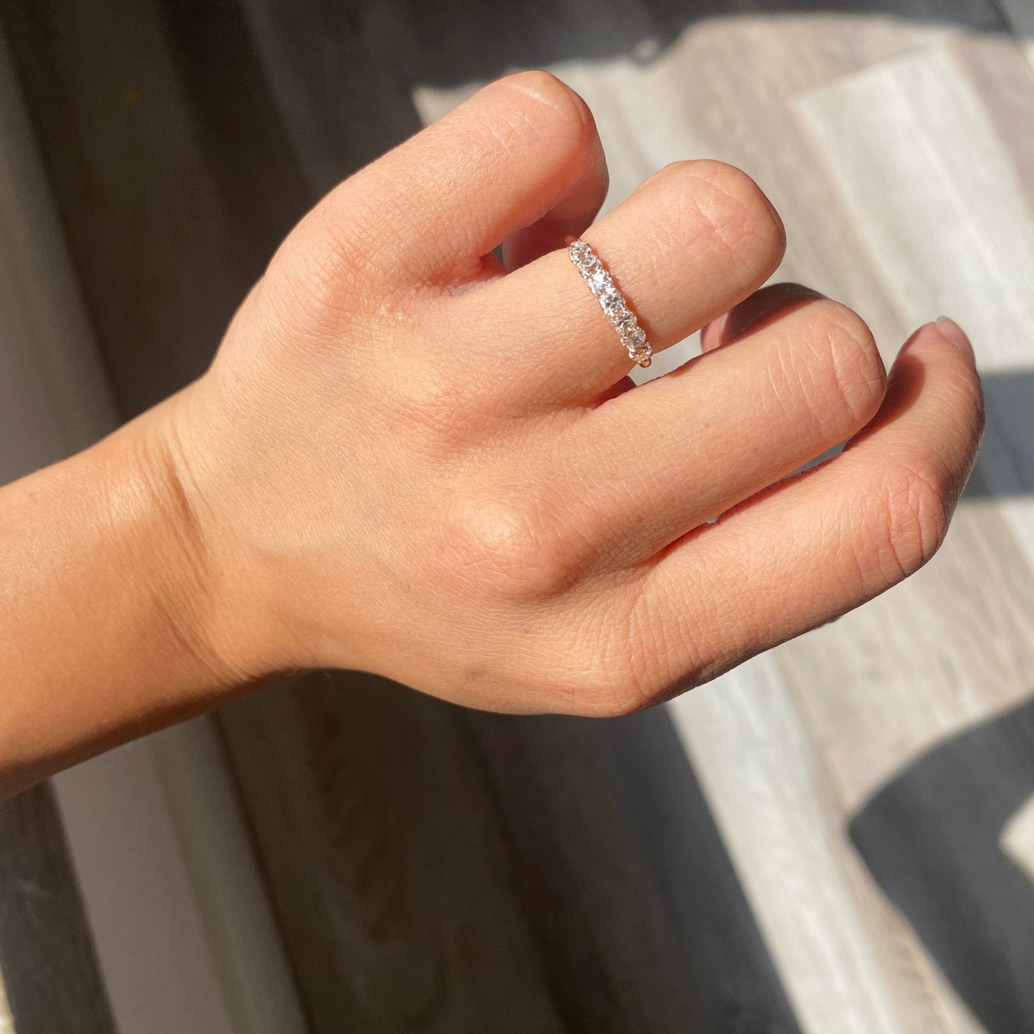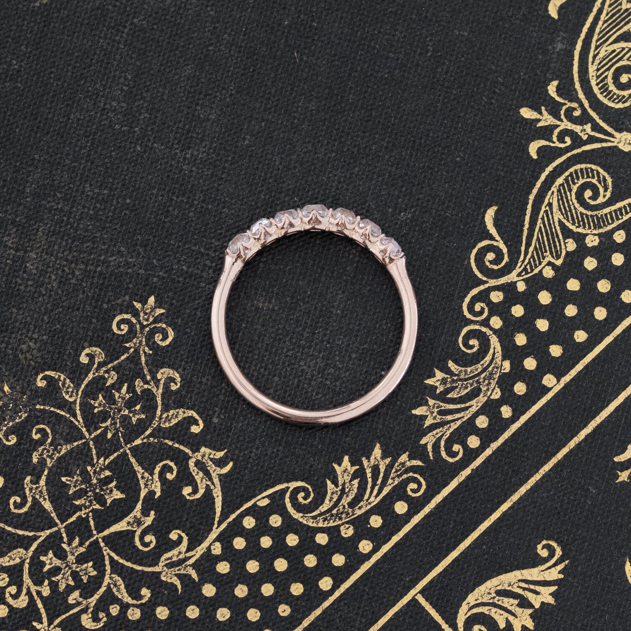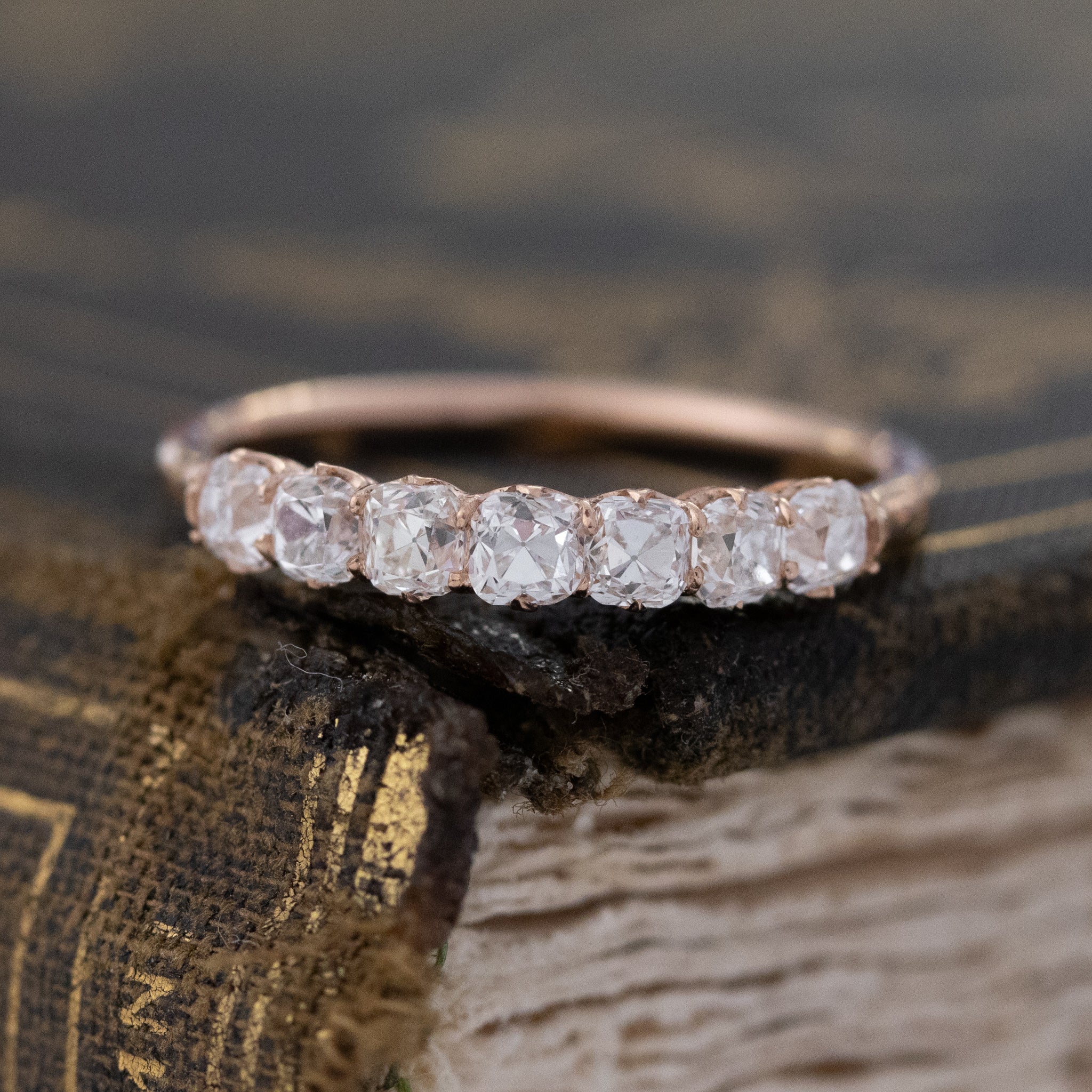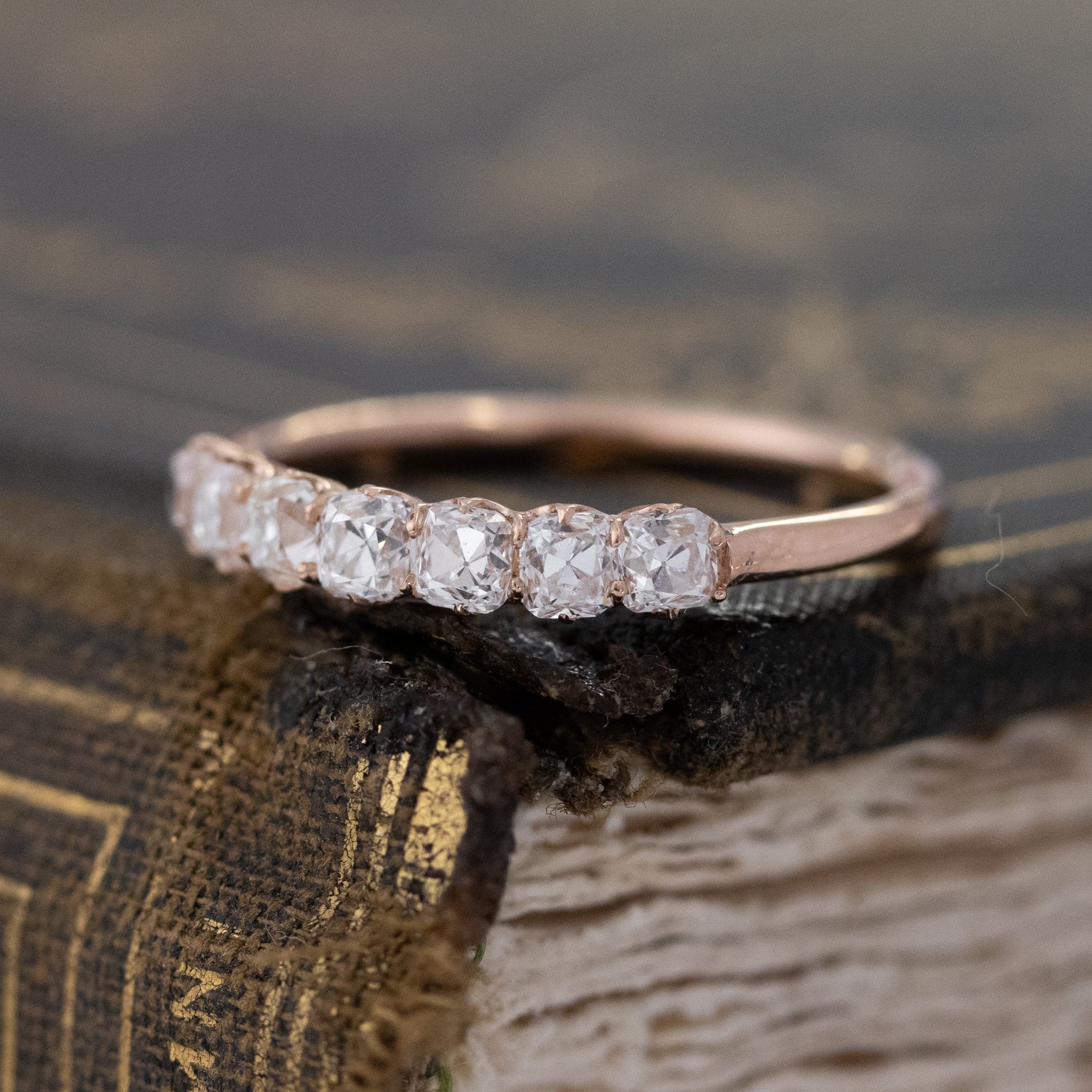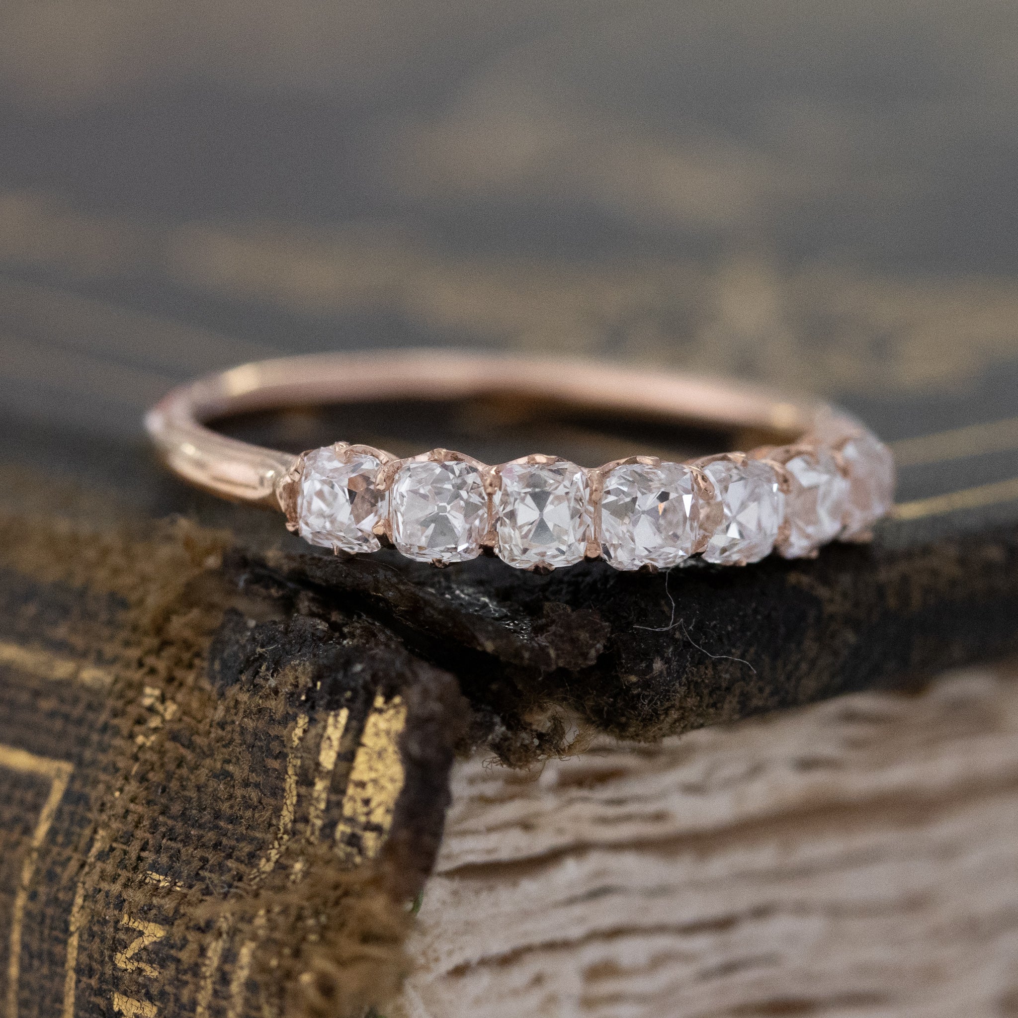 Modeled after antique diamond half-hoop bands from the Georgian and Victorian eras, this 7-stone band is set with chunky and charming old mine cut diamonds in 18kt rose gold! The diamonds are bright and sparkly, twinkly and sparking brightly - so beautiful and elegant on the finger. This is the perfect size for those wanting something smaller and more delicate in scale.