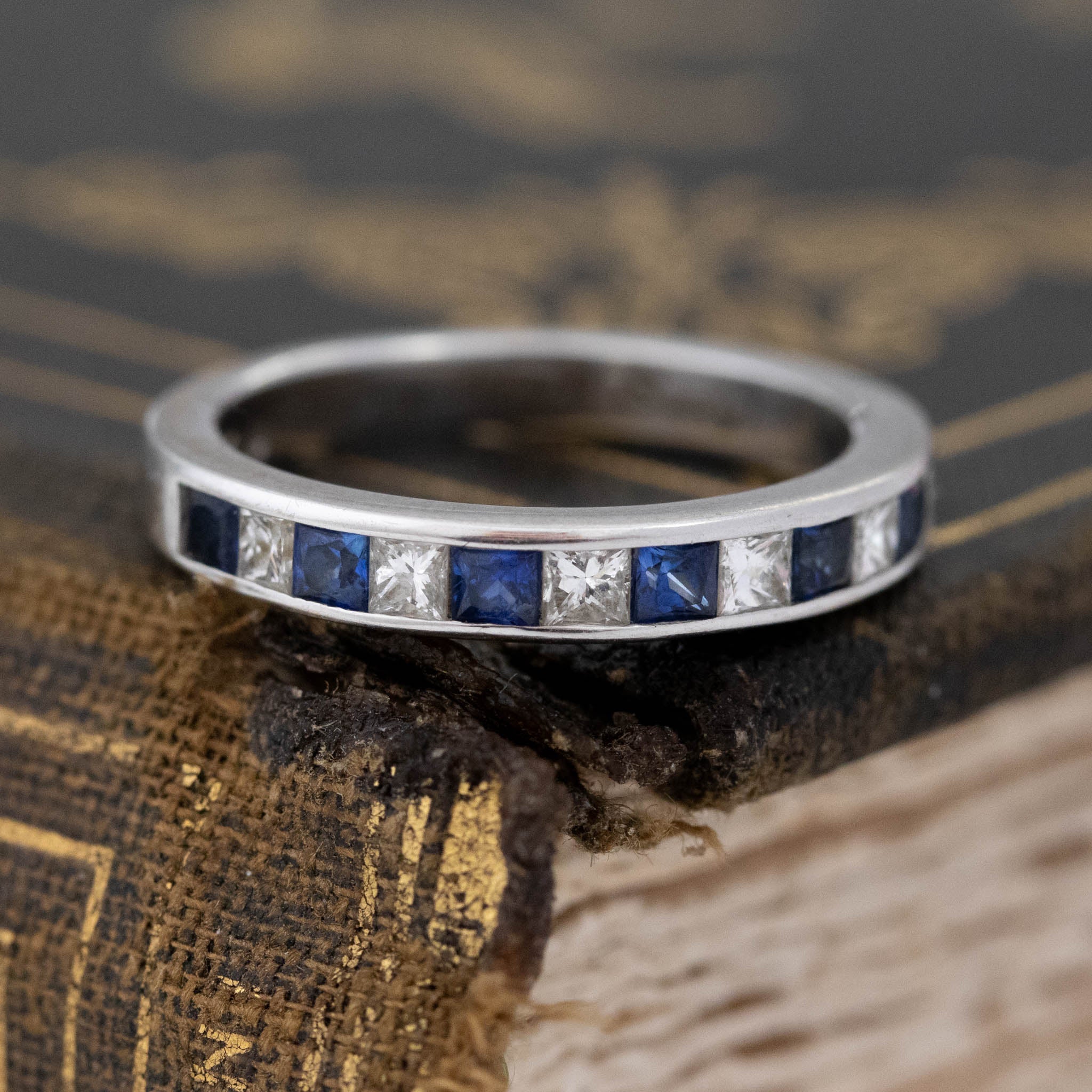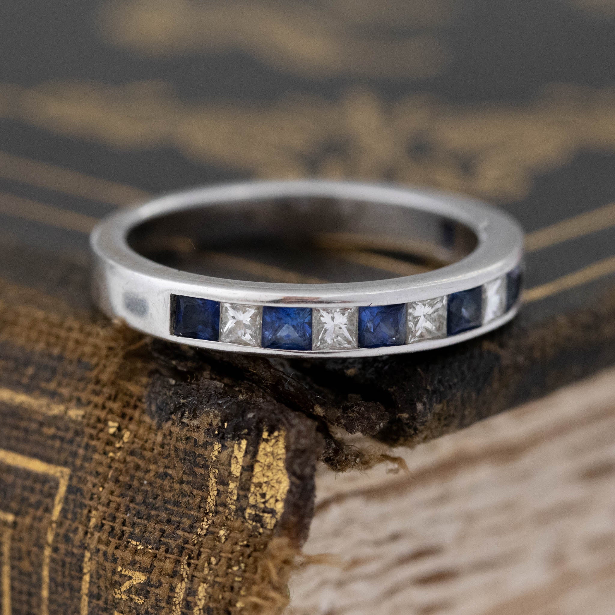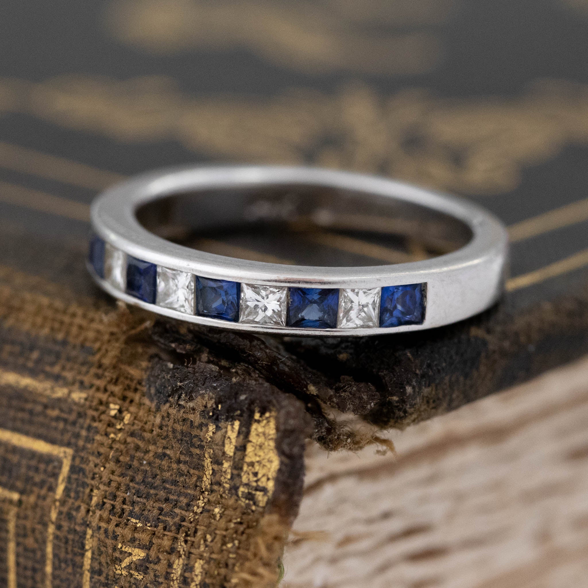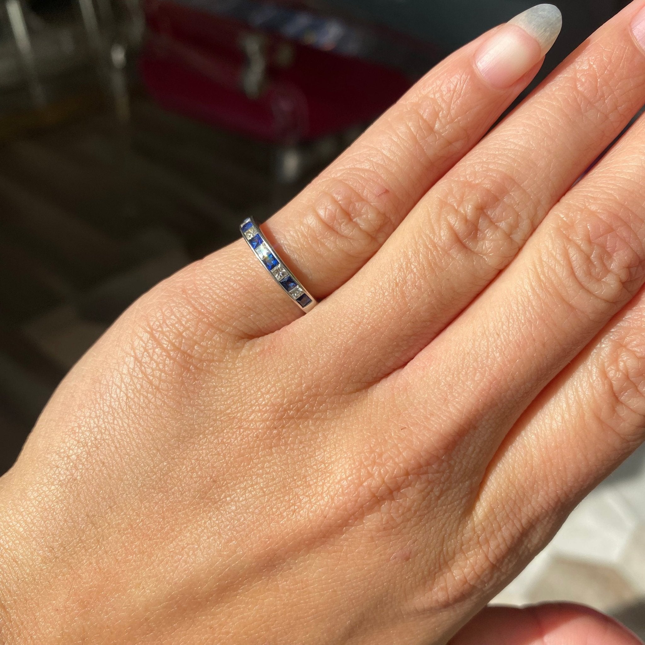 Diamonds and sapphires go together like peanut butter and jelly. There’s something so wonderful and irresistible about that blue and white color combination - and this sweet band is a perfect example of that! Princess cut diamonds and sapphires are channel set in white gold, alternating between one another to make for the perfect stacker band! She sits well with other bands and is a wonderful pop of color to any stack.