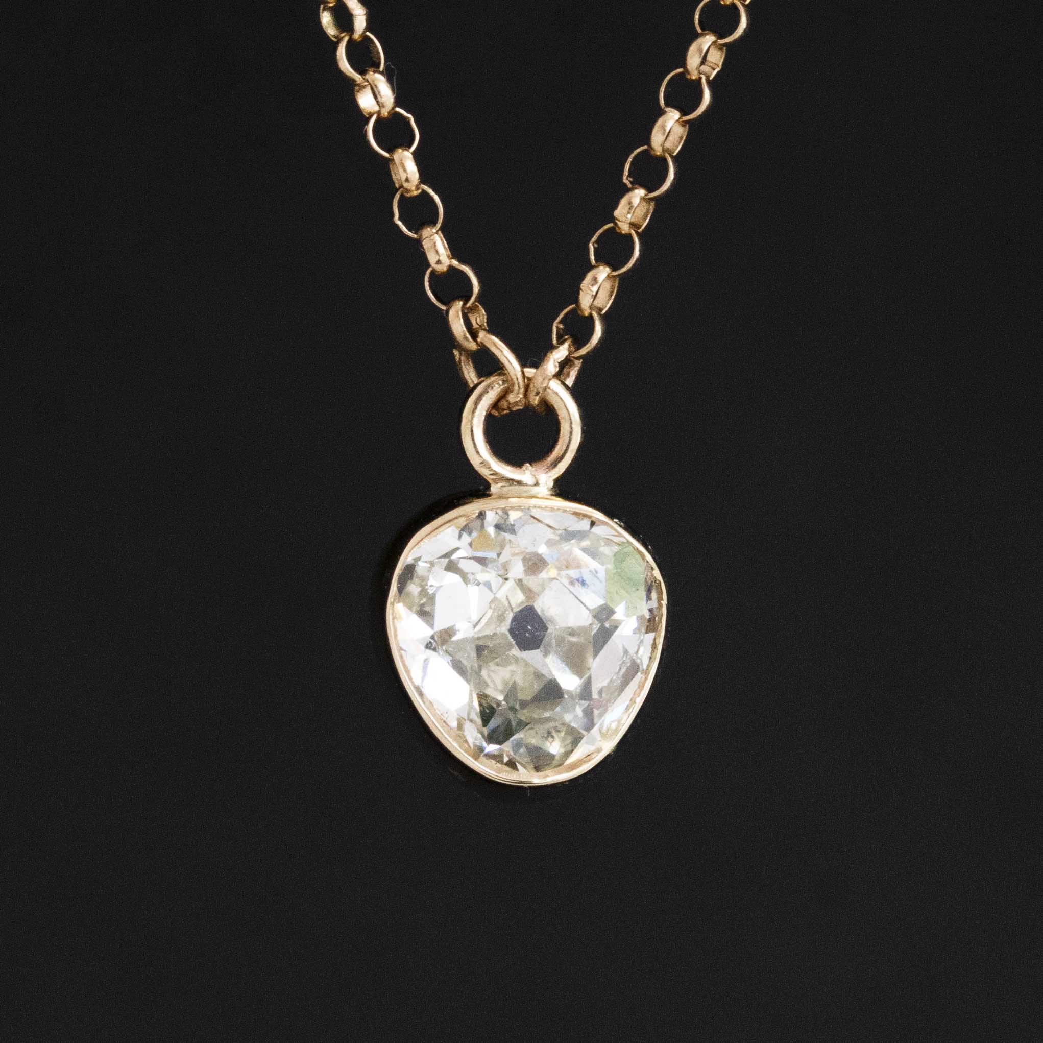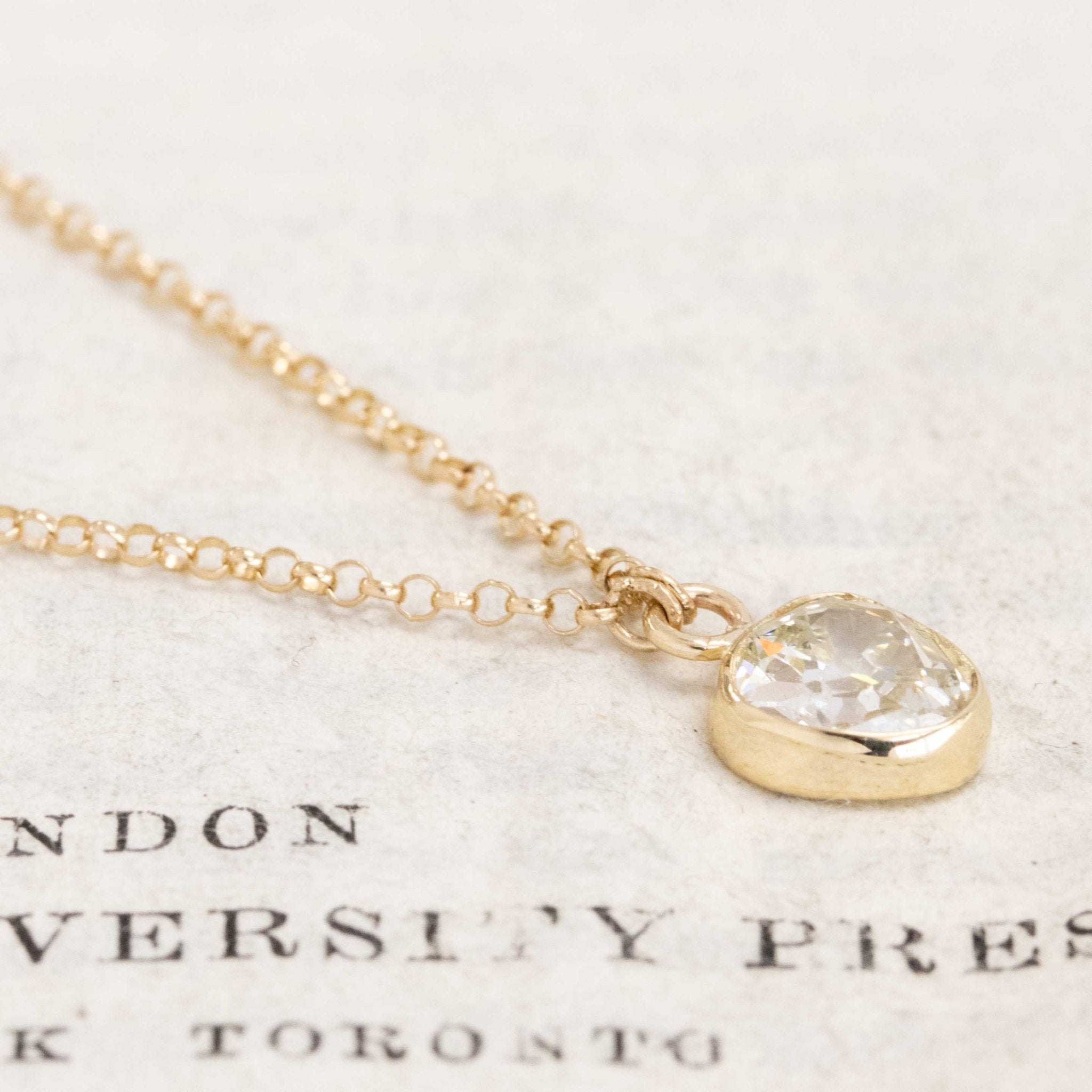 A chubby, antique pear cut diamond which was begging to become a pendant when we first came across her! Set with a sweet bale and set on a skinny rolo chain to give you a very floaty, understated look that packs plenty of antique sparkle. We set the stone up-side down for a heart-adjacent look on the neck, and we're quite fond of how rustic her facets are. She's special!