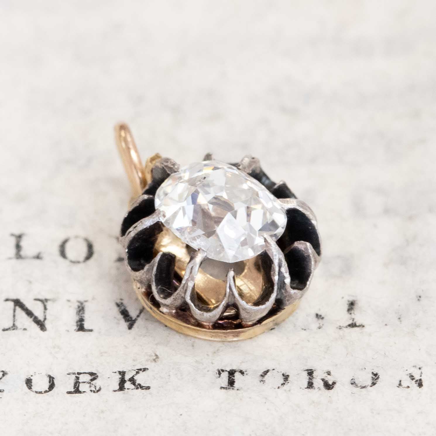 An antique buttercup component, once a small piece of a much larger necklace, newly set with a gold bale to make for the sweetest diamond pendant or charm. This one is set with a chunky monkey of an old mine cut, elongated in shape with an open culet. The buttercup collet setting adds some visual coverage but also romantic and swoopy details.