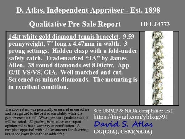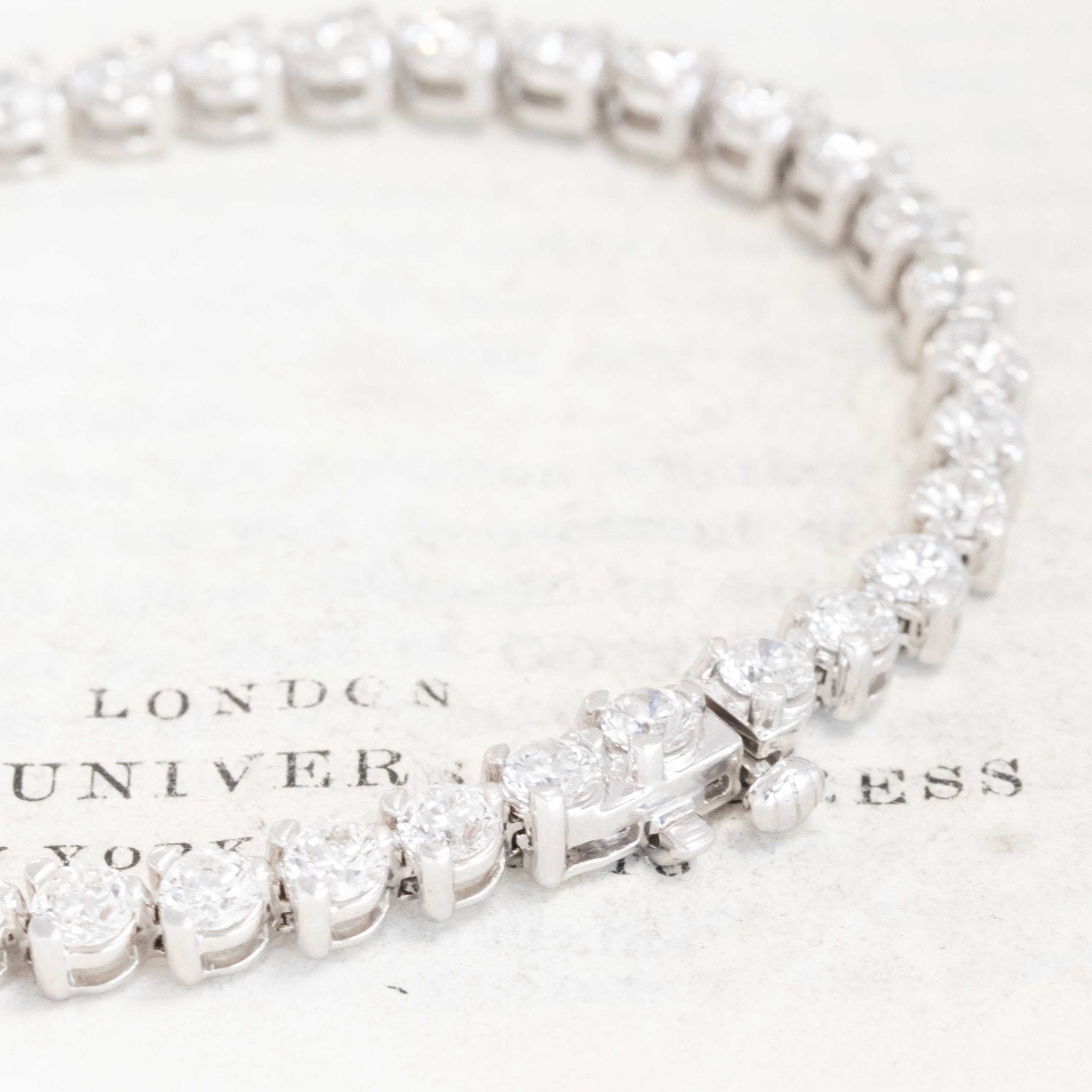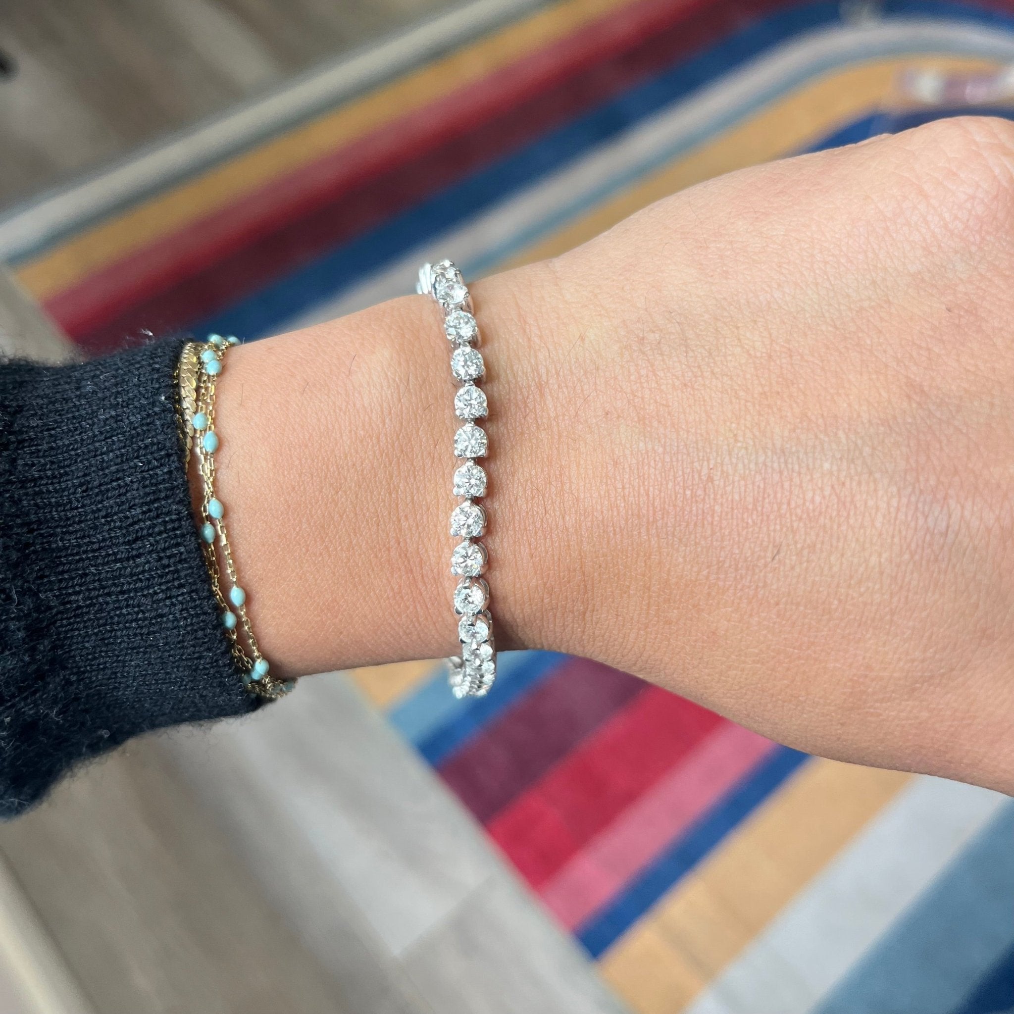 A classic round brilliant cut diamond tennis bracelet - three prong baskets and 14kt white gold, a jewelry suite staple which belongs in everyone's collection! This one is bright and sparkly, in an excellent size and proportion for daily wear. Throw it in a stack with gold links or wear her solo - either way, we're big fans.